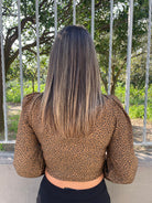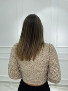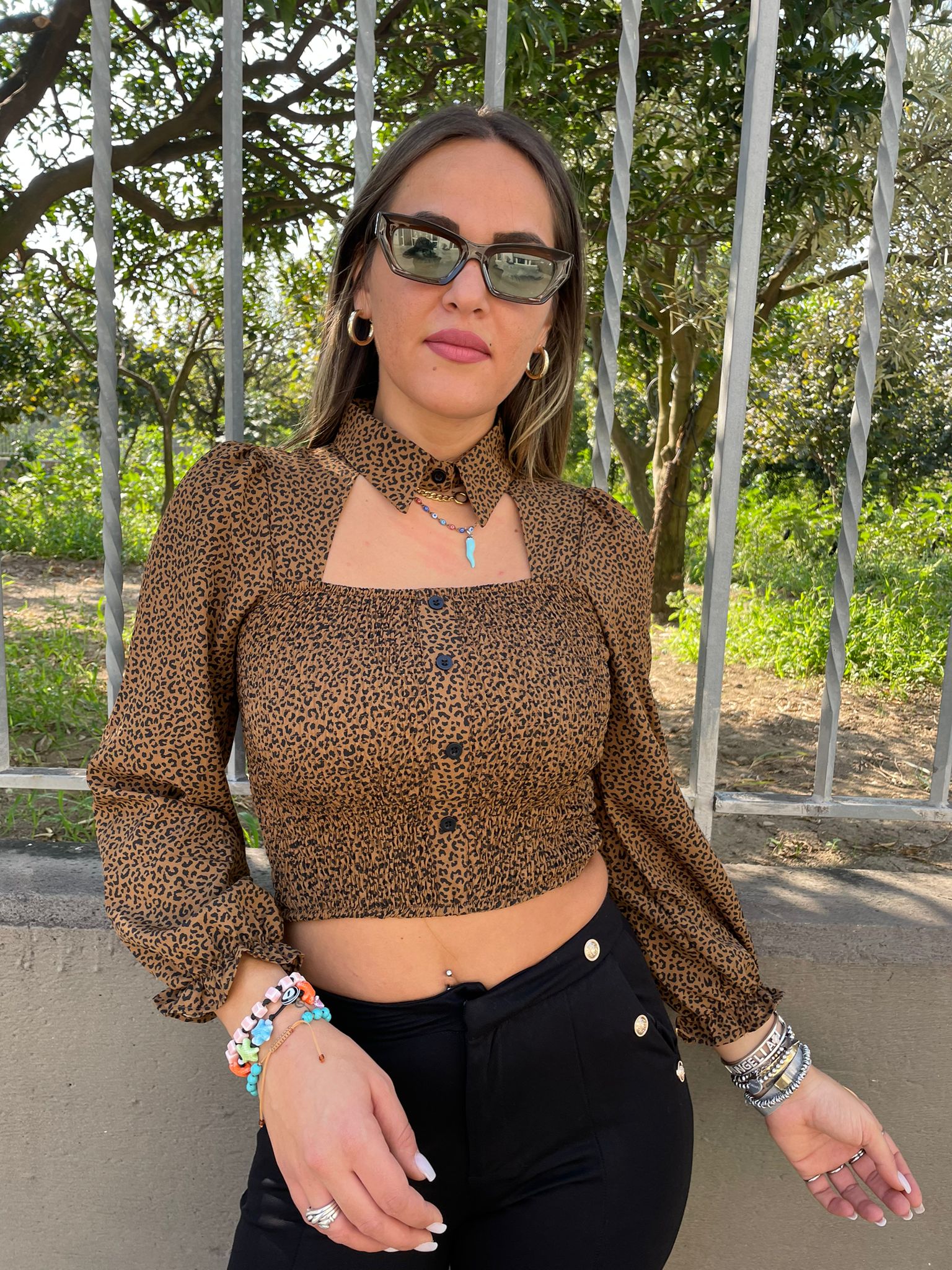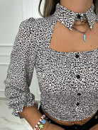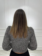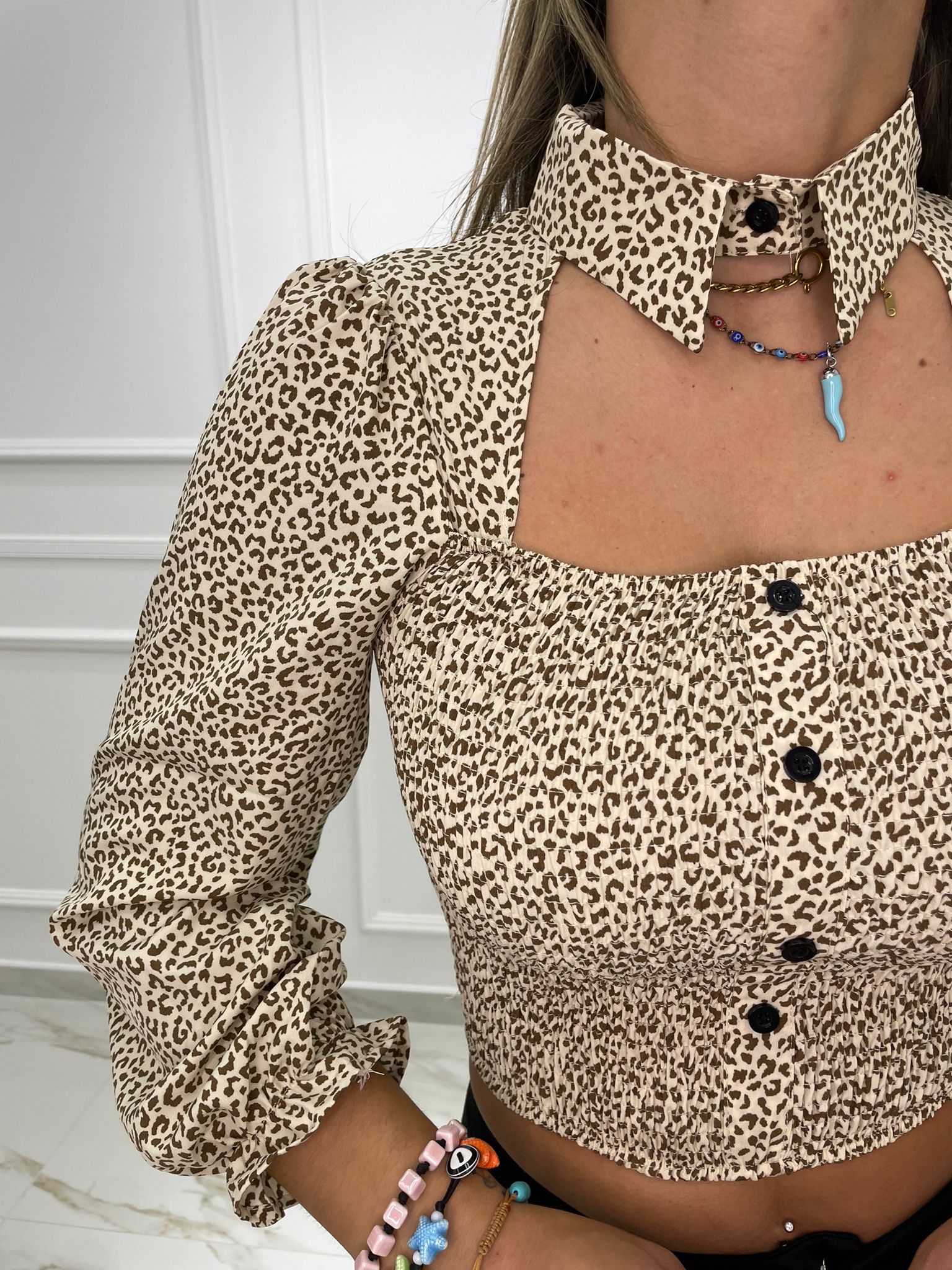 Camicia animalier con drappeggio avanti e maniche a sbuffo