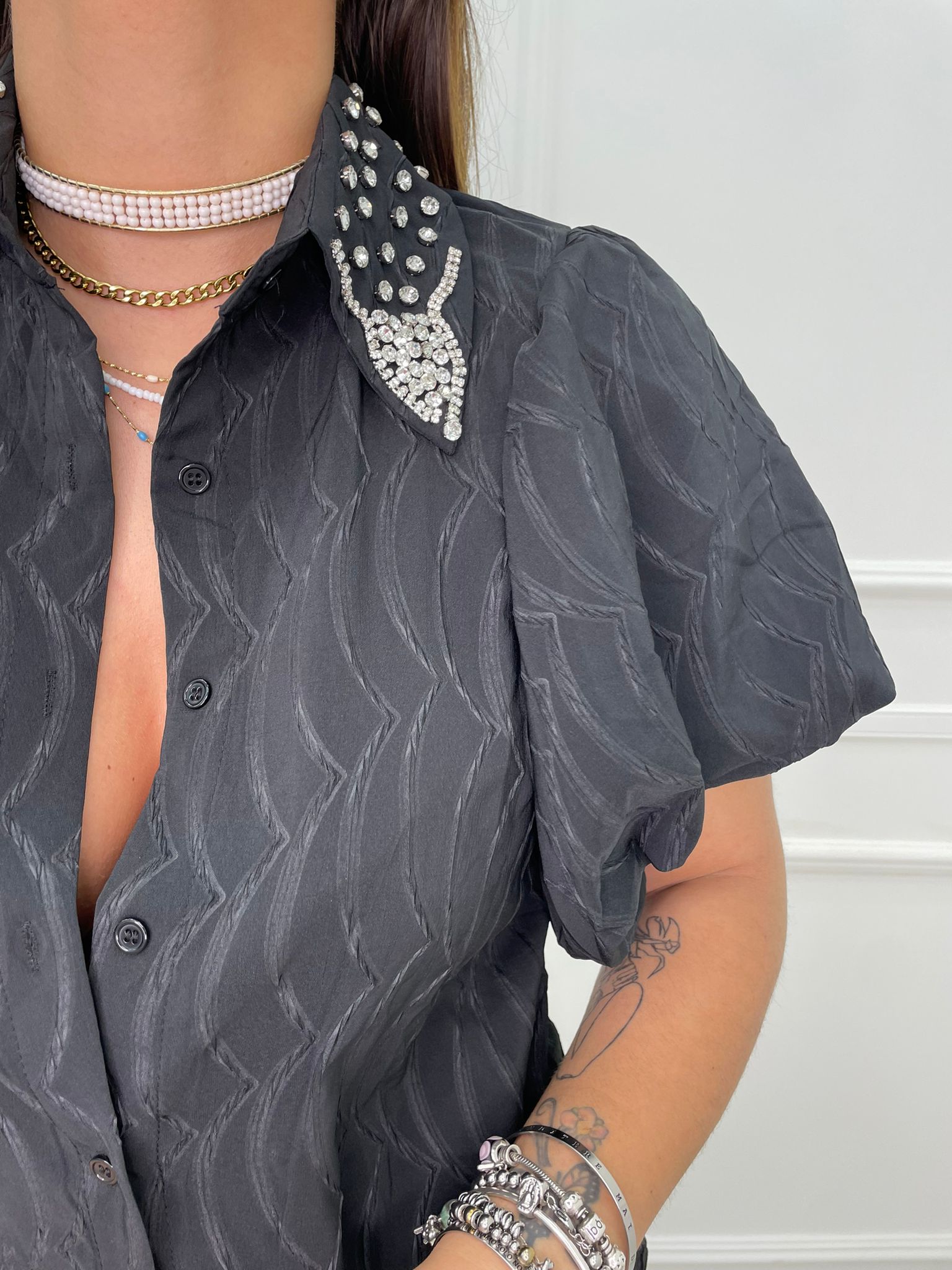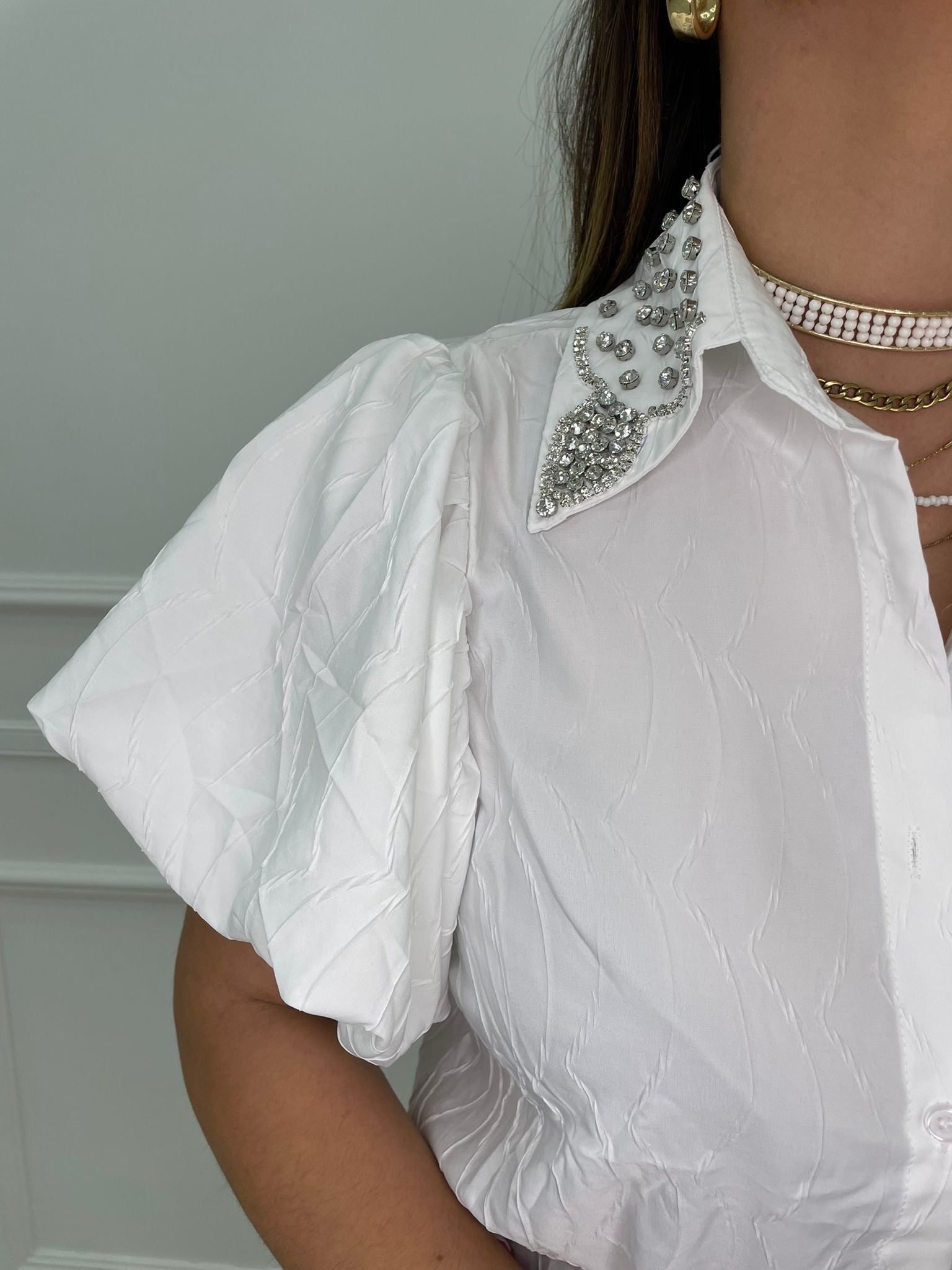 Camicia trama stropicciata con maniche a palloncino e swarovski