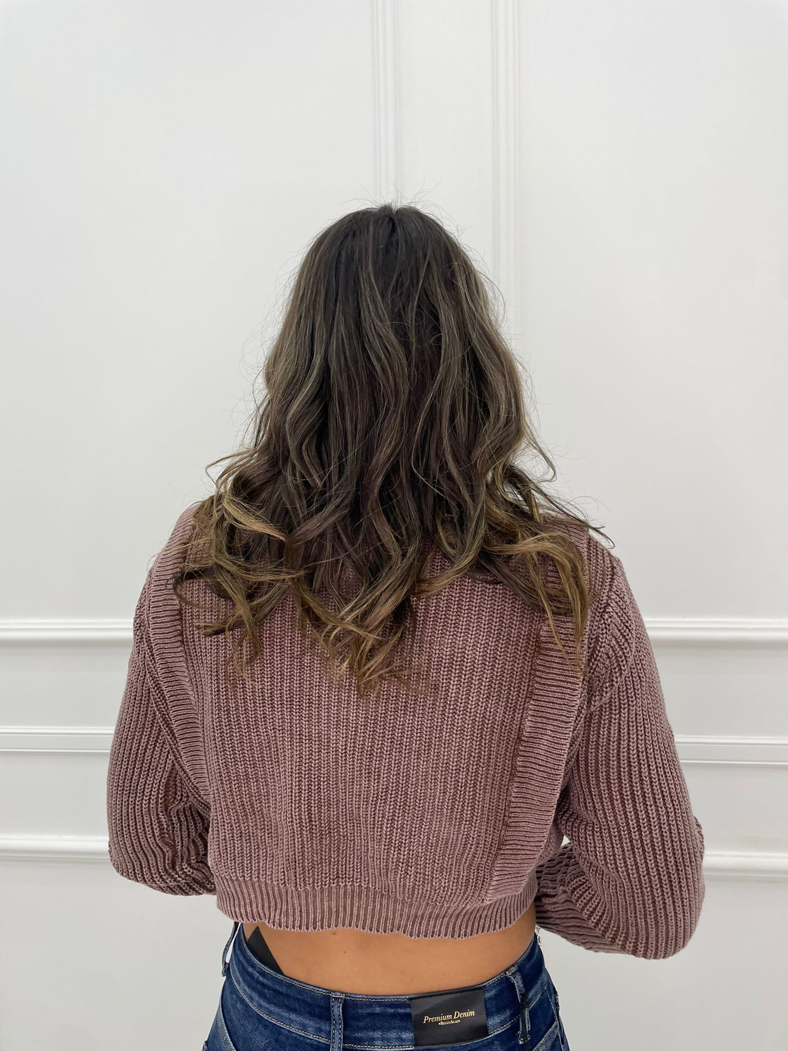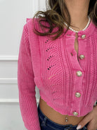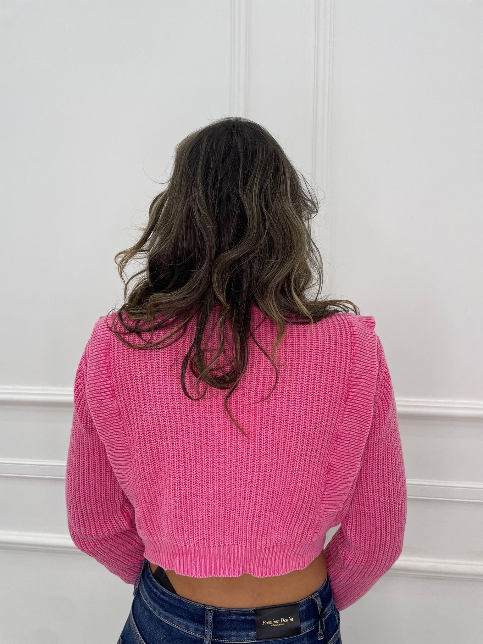 Cardigan crop intrecciato con rouches alle spalle