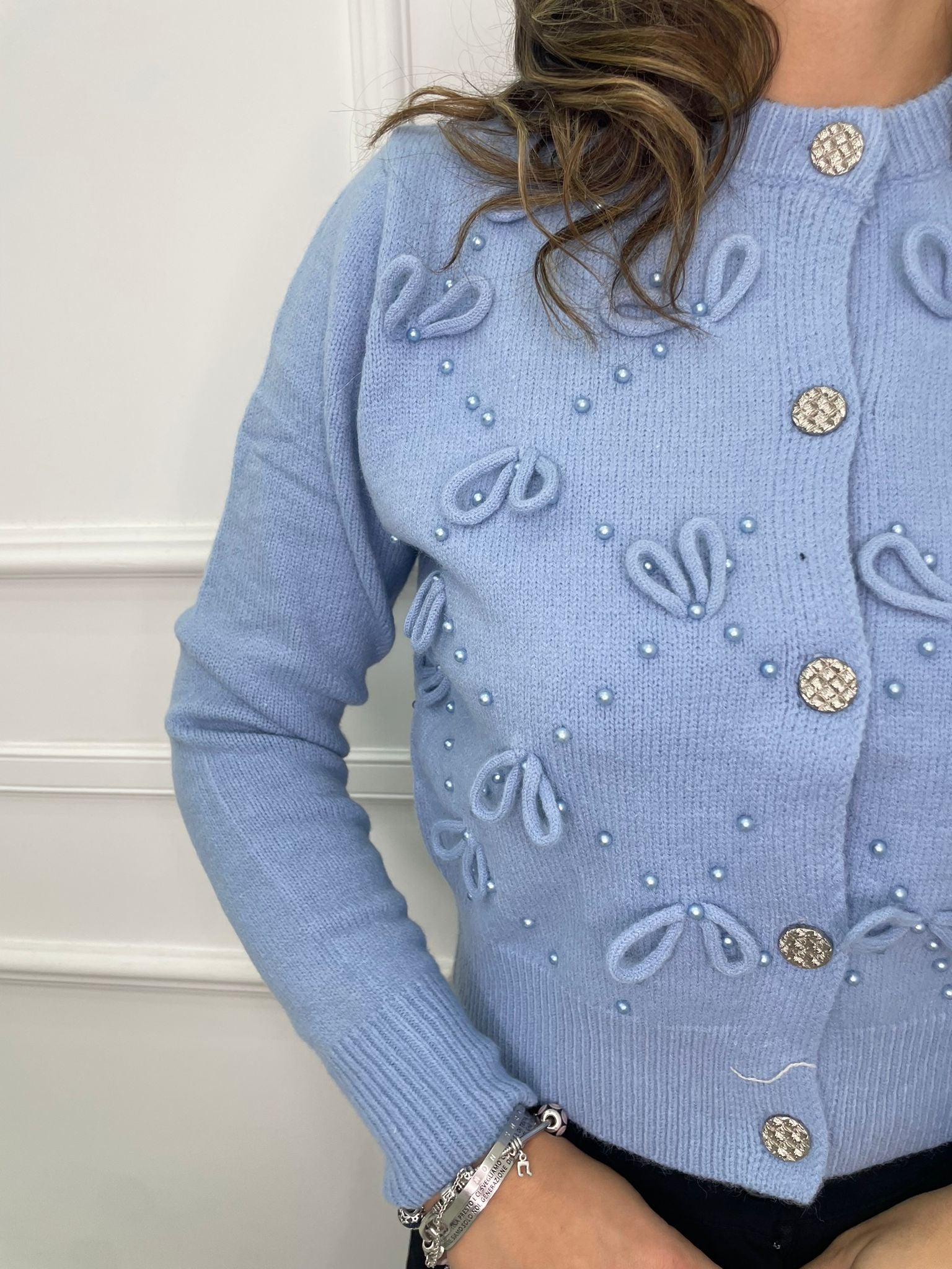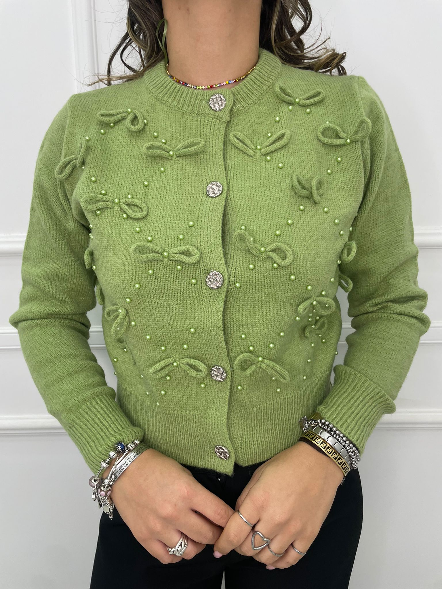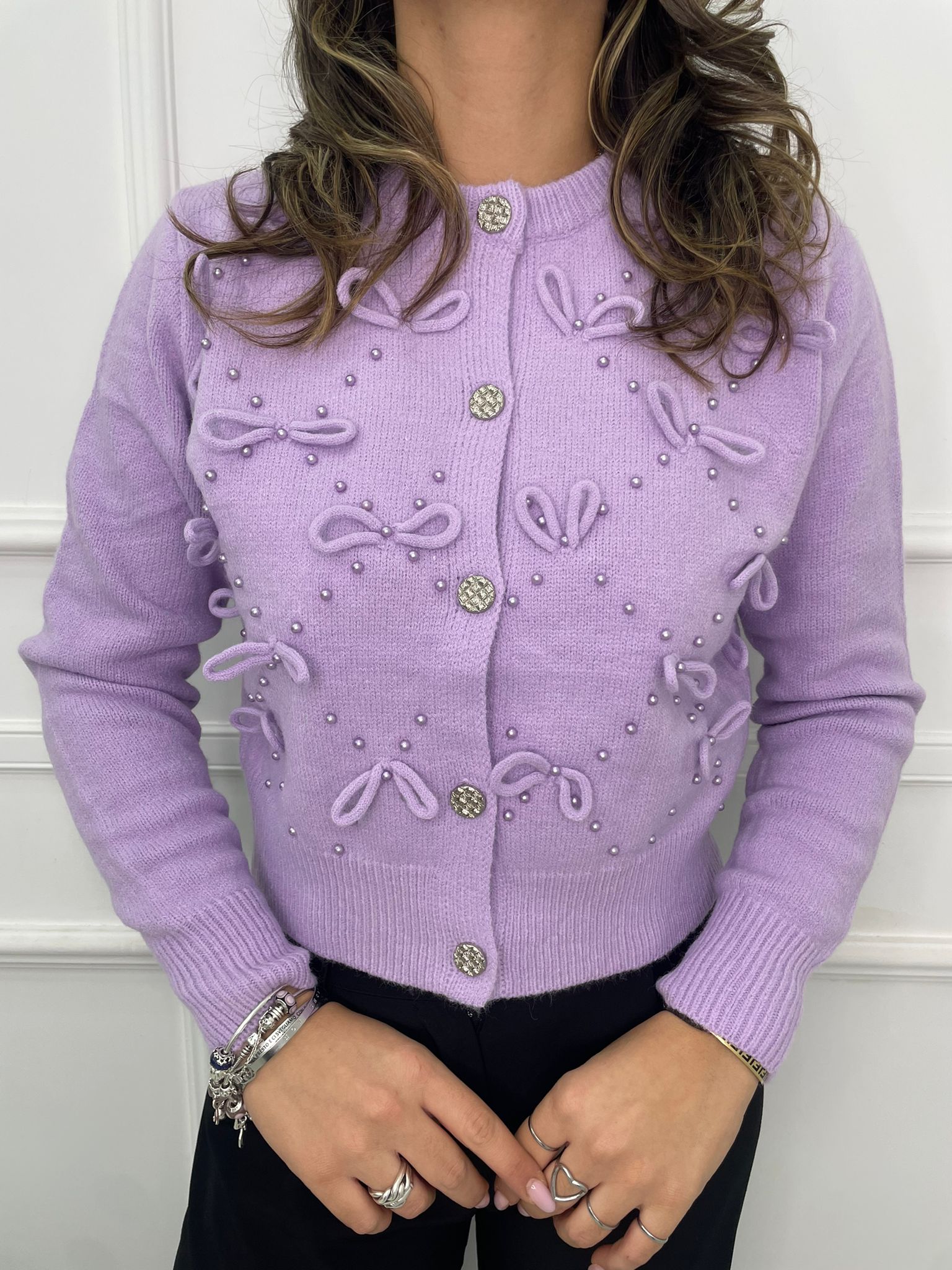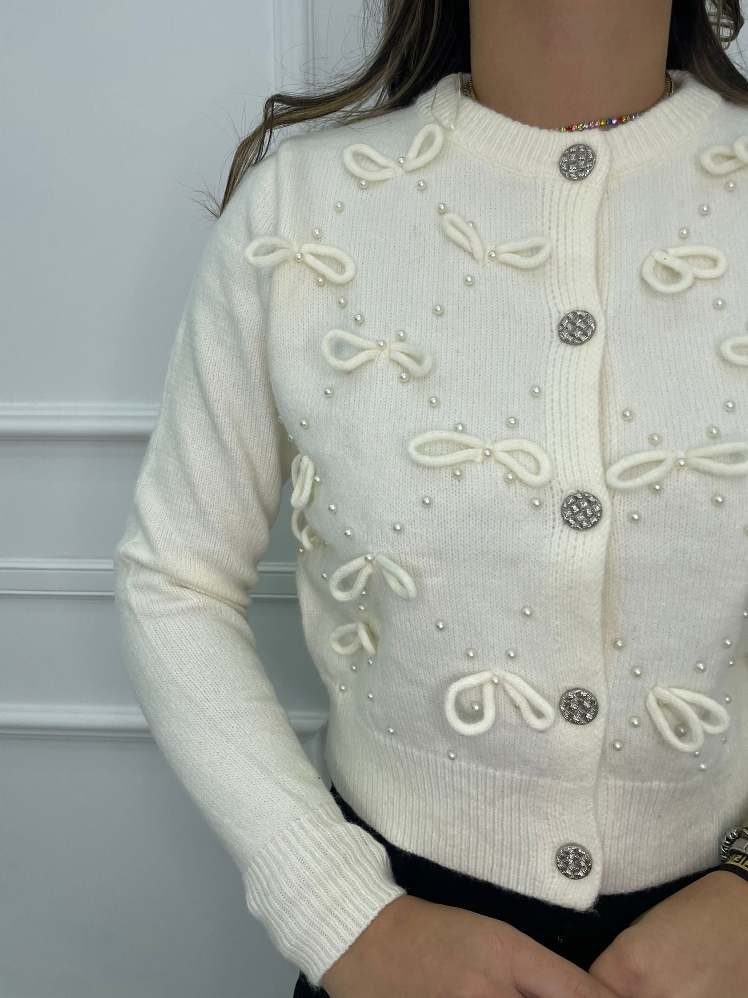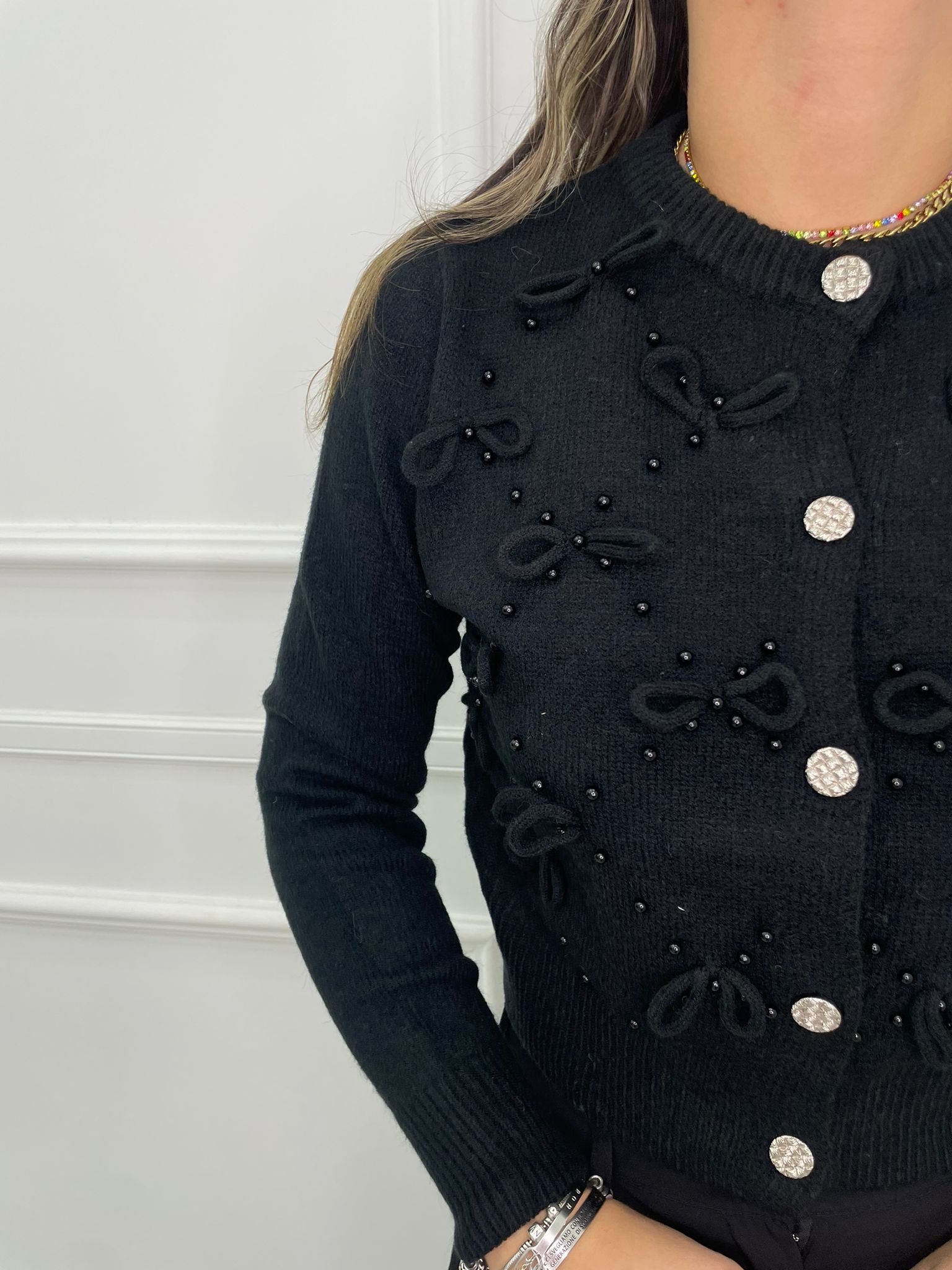 Cardigan tinta unita con fiocchi e bottoni swarovski