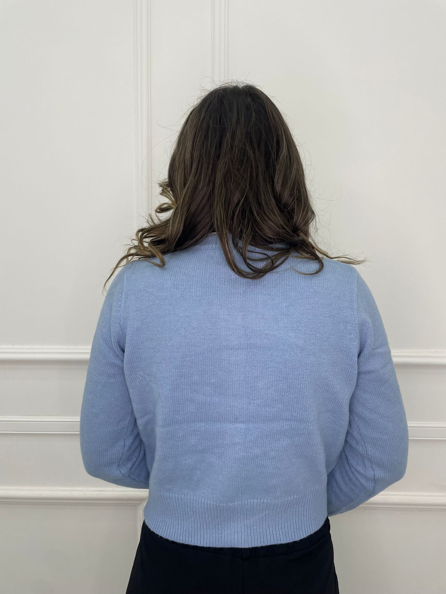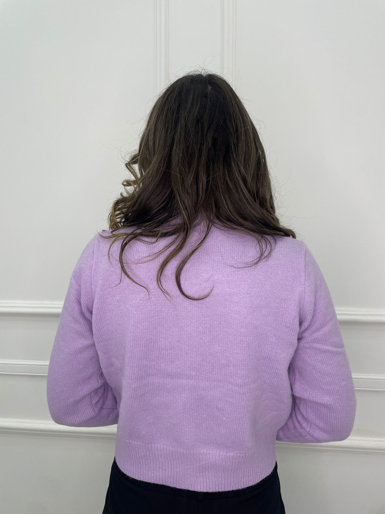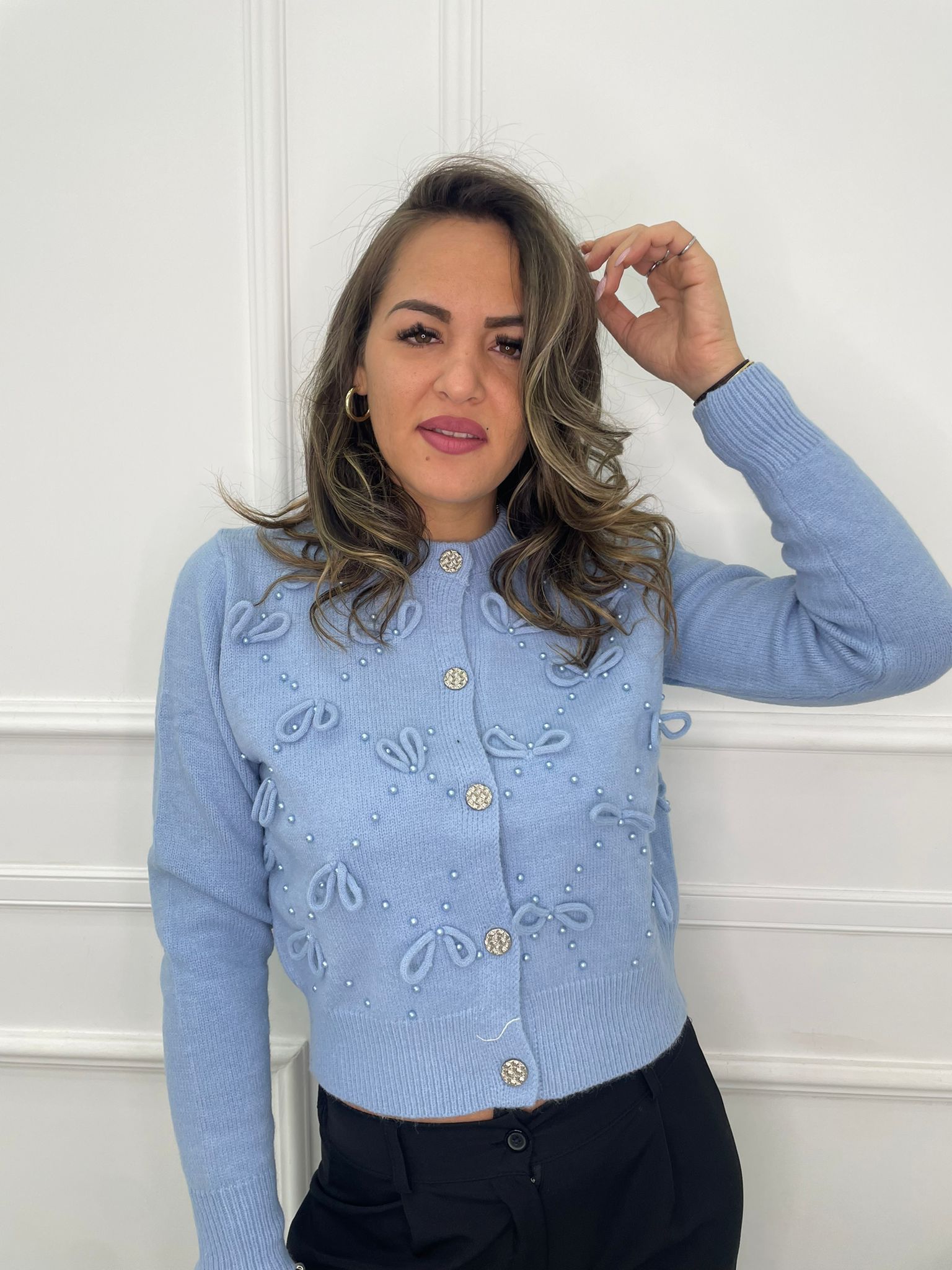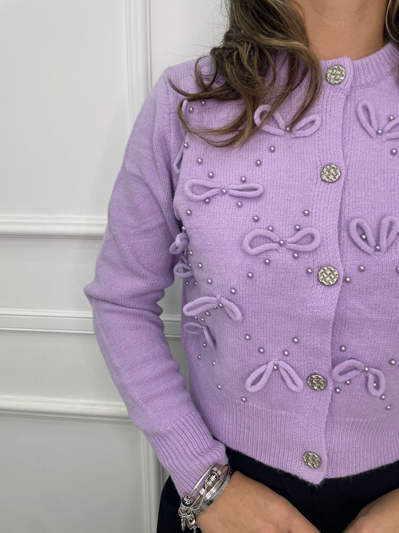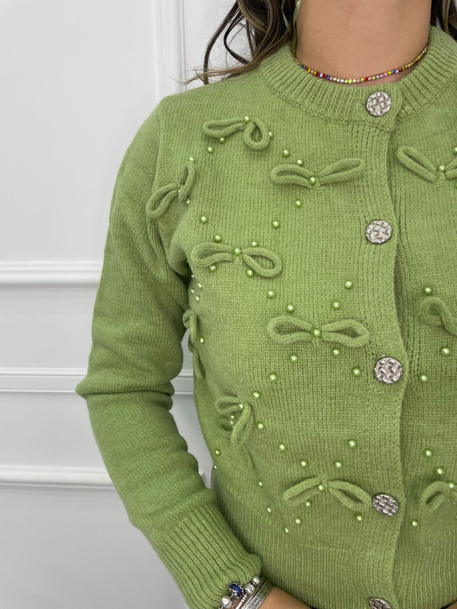 Cardigan tinta unita con fiocchi e bottoni swarovski