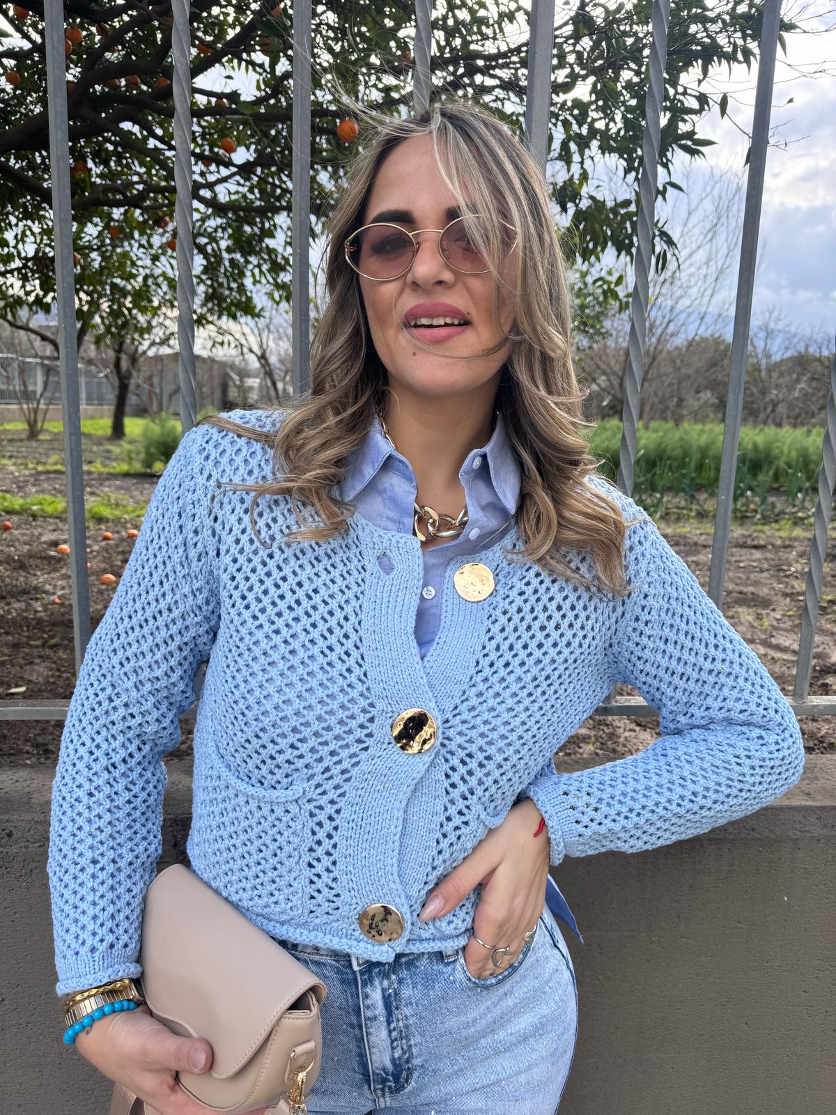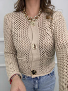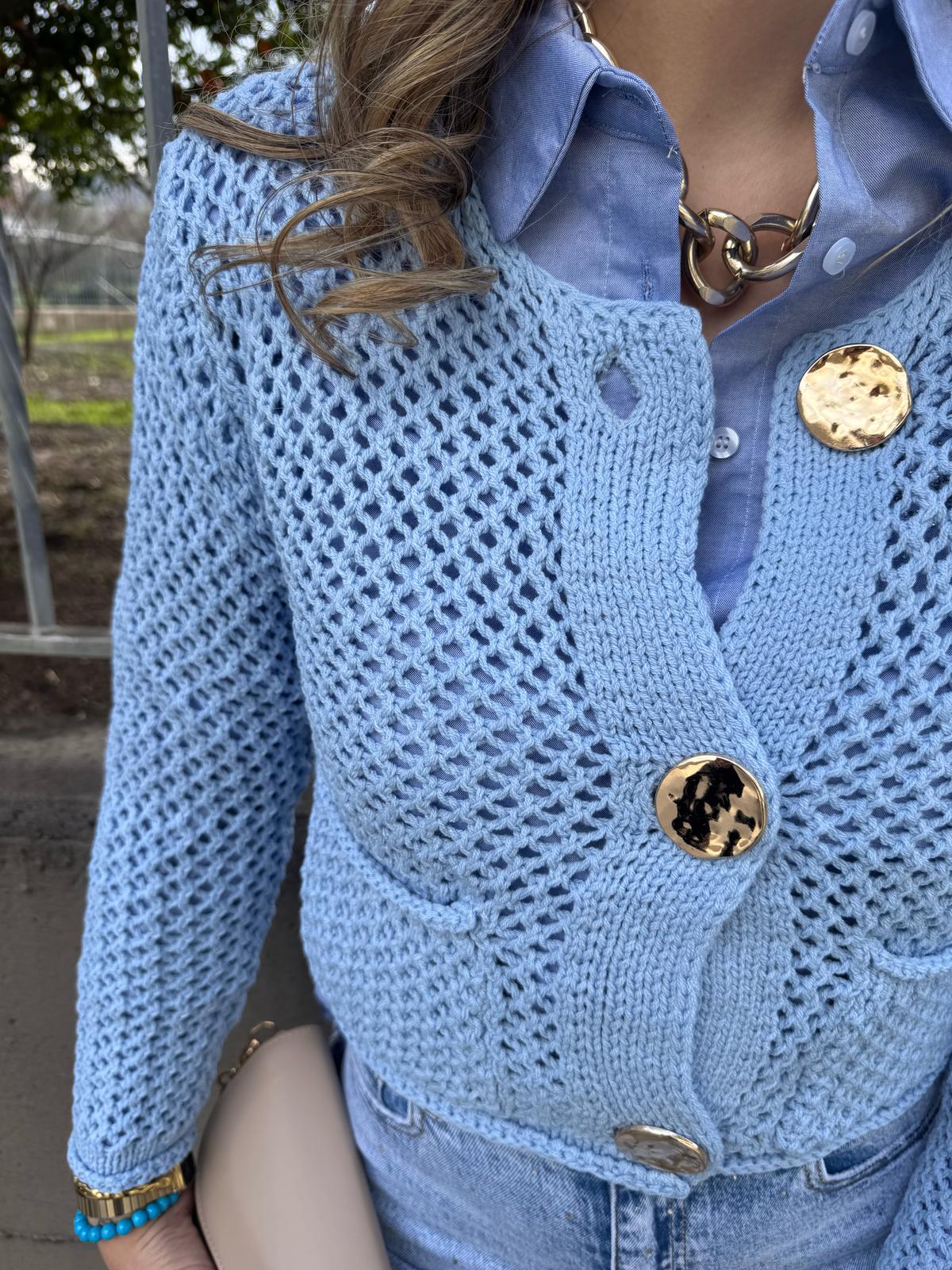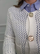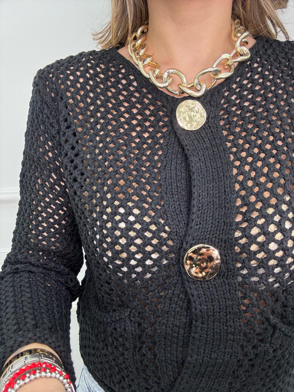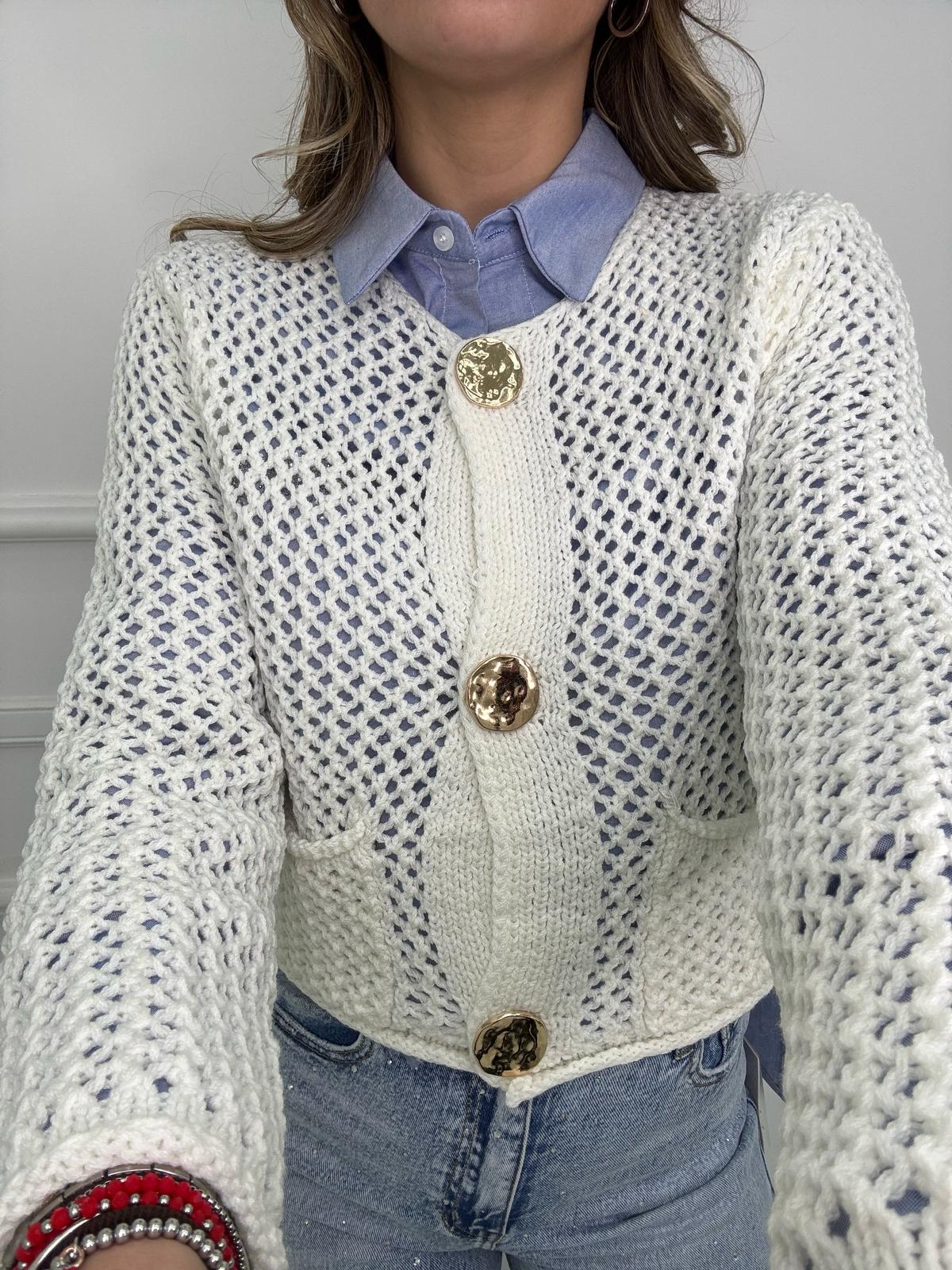 Cardigan traforato giro collo con bottoni oro