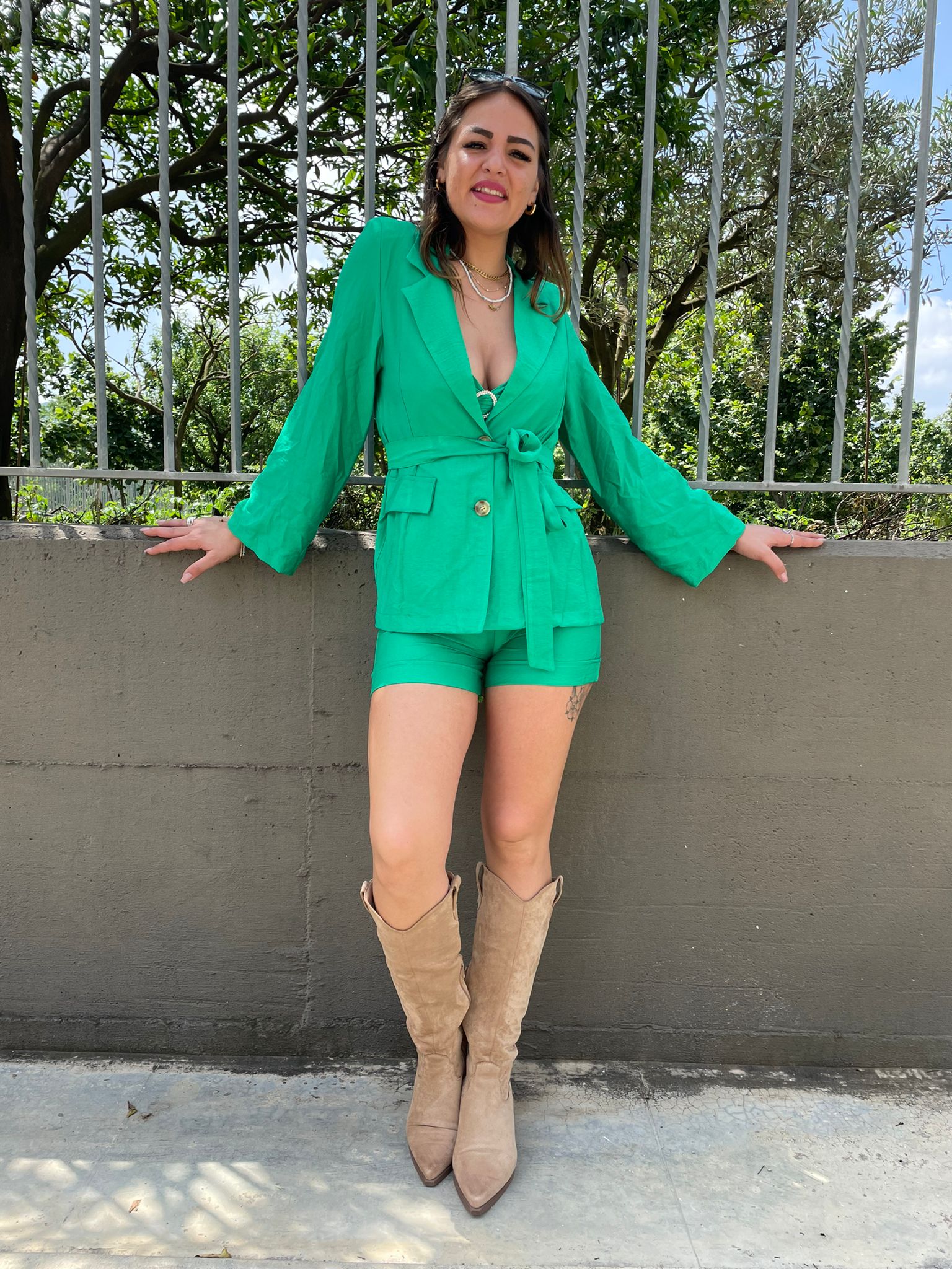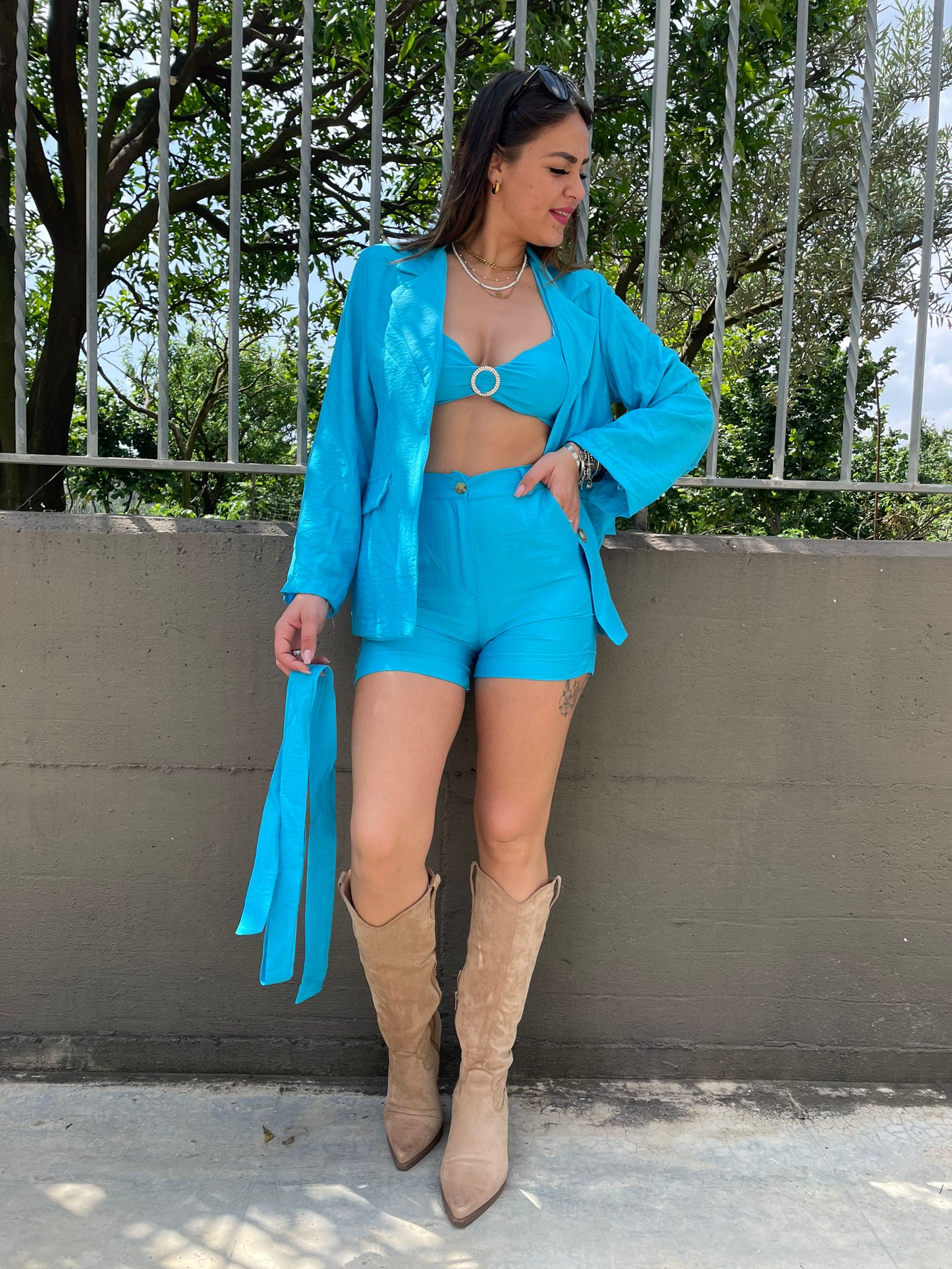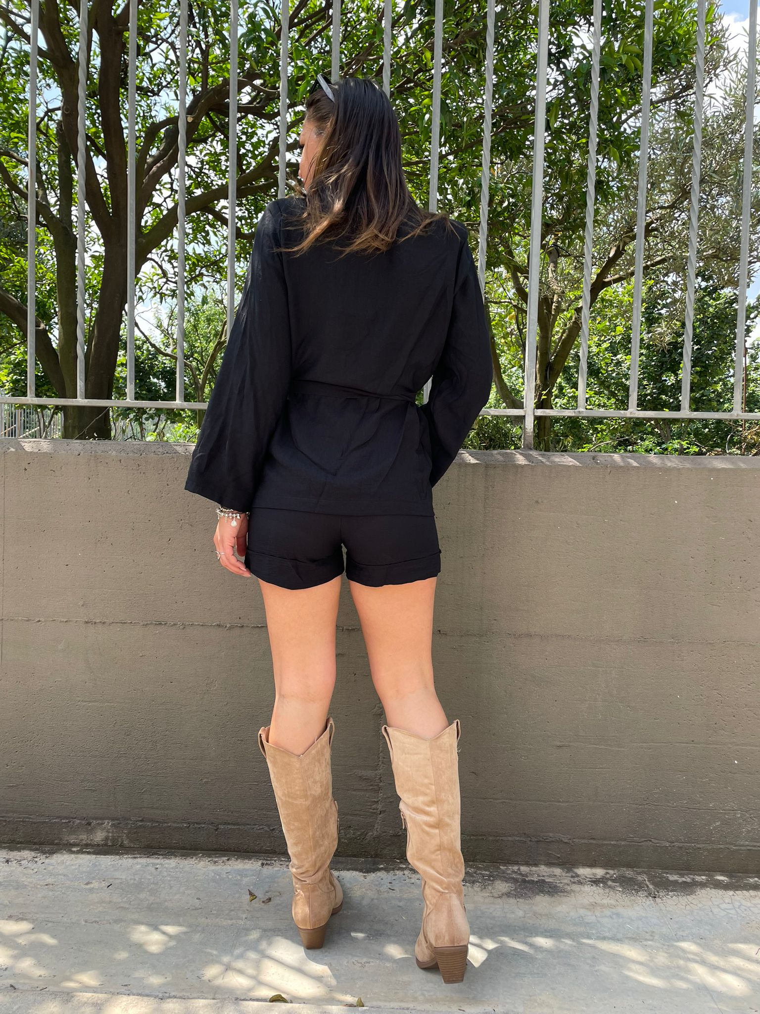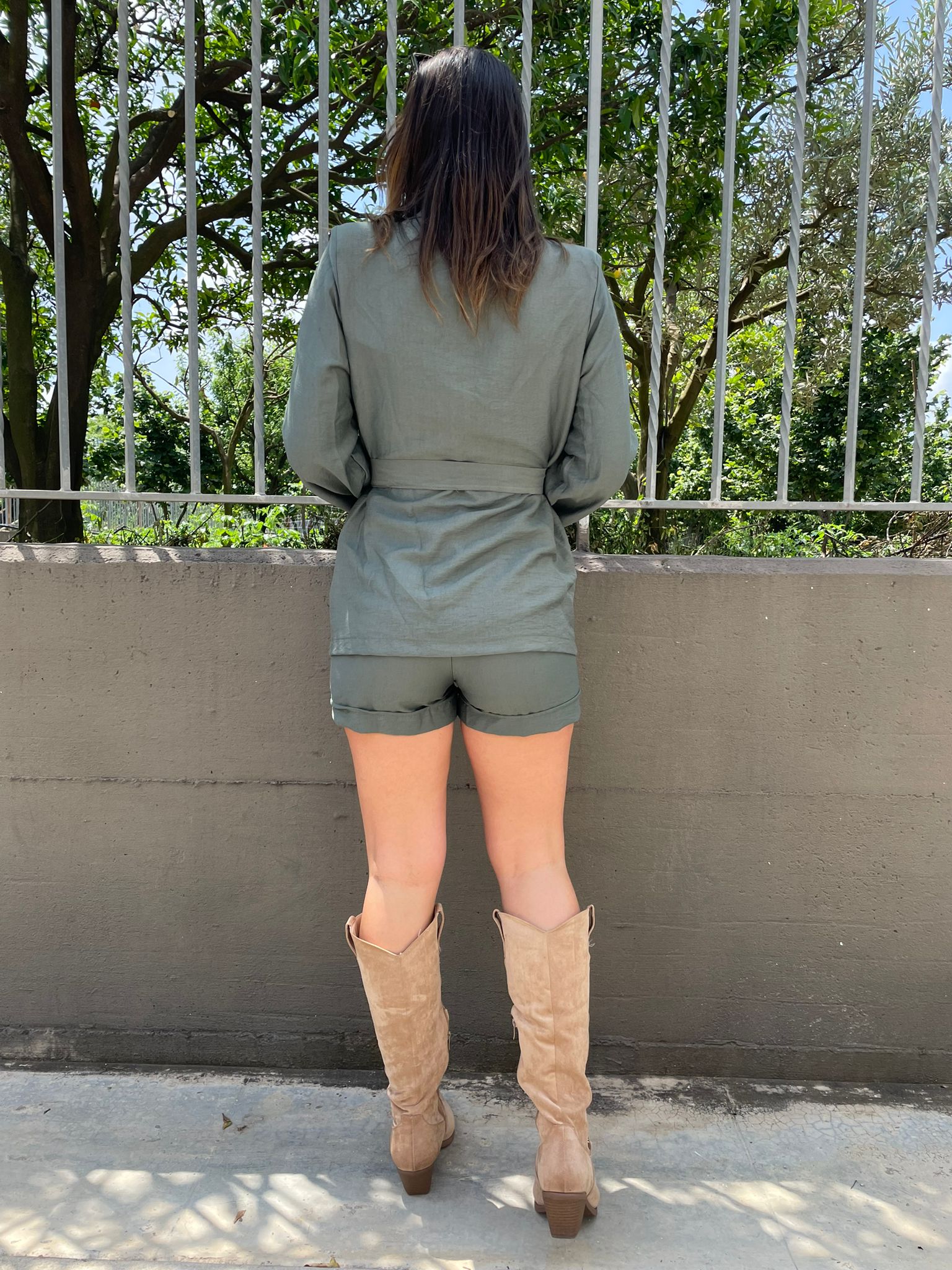 Coordinato 3 pezzi effetto lino con pantaloncino e top swarovski