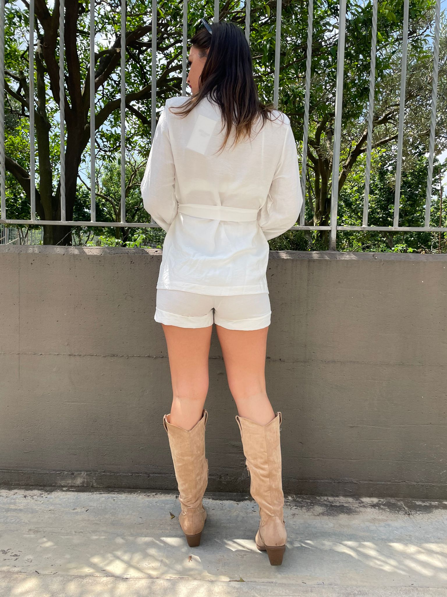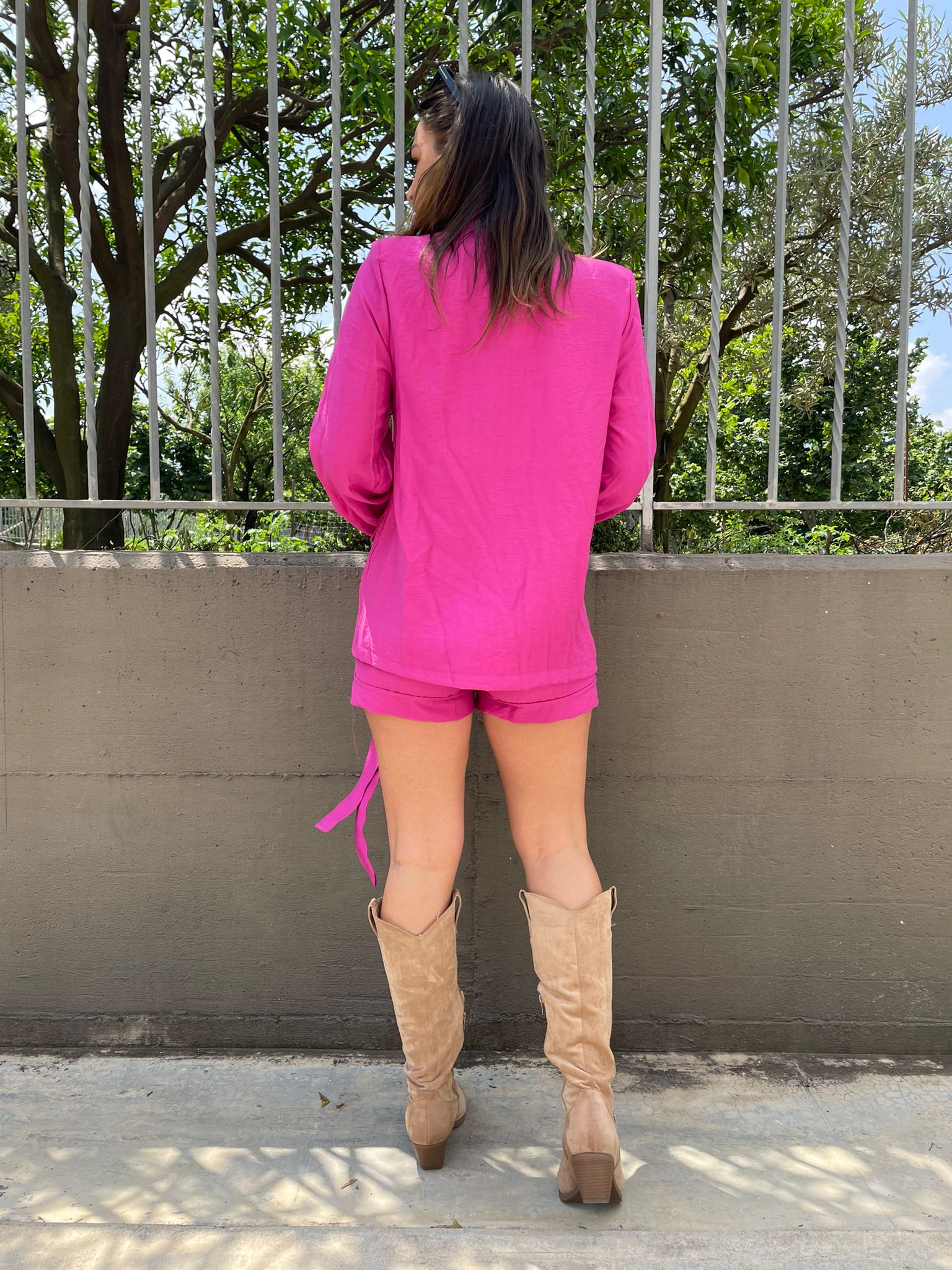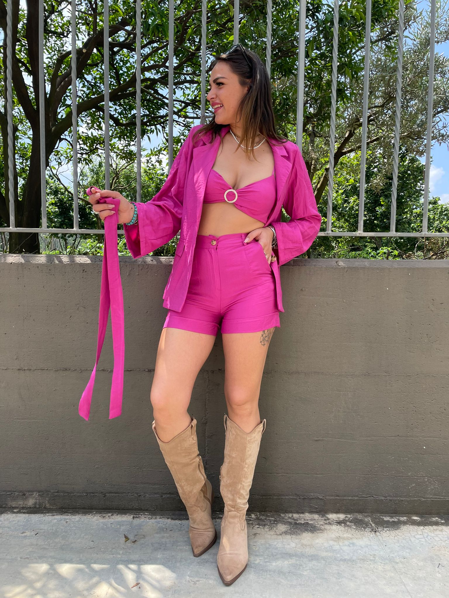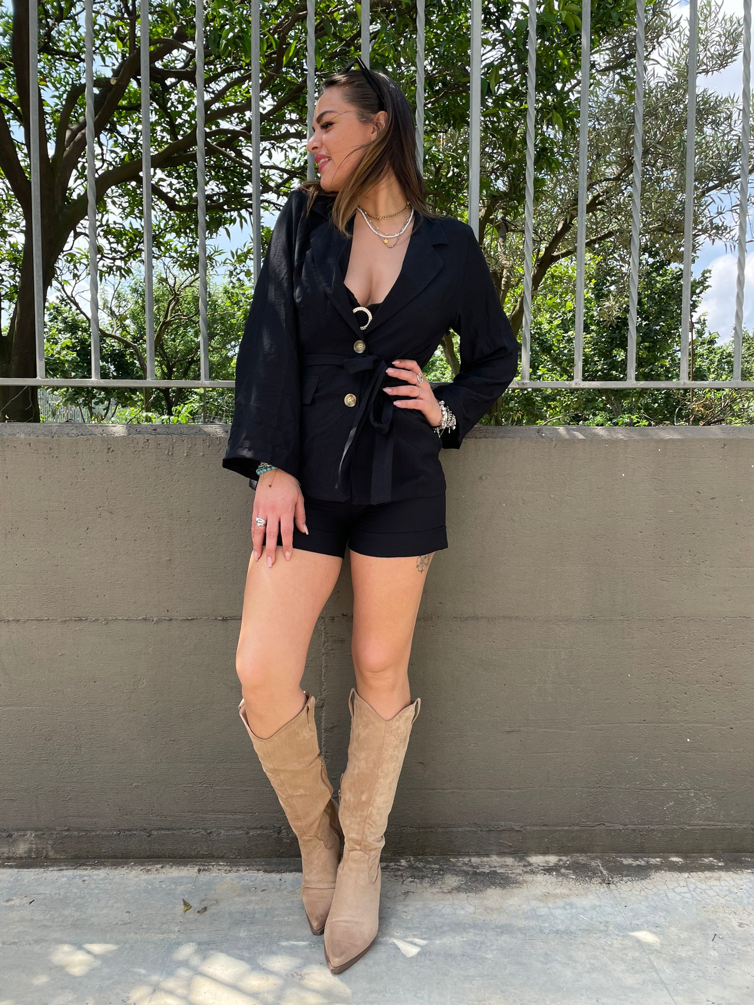 Coordinato 3 pezzi effetto lino con pantaloncino e top swarovski