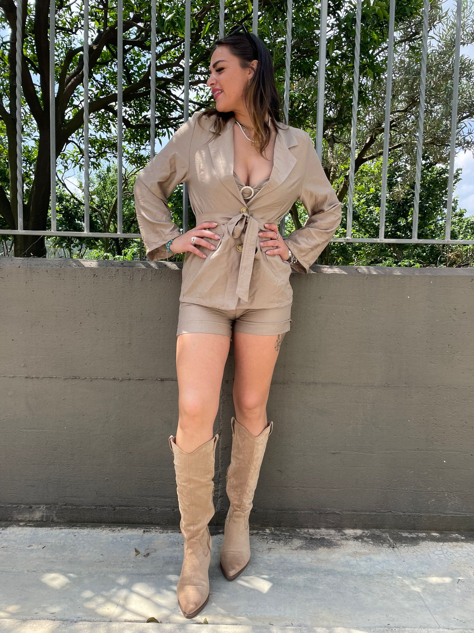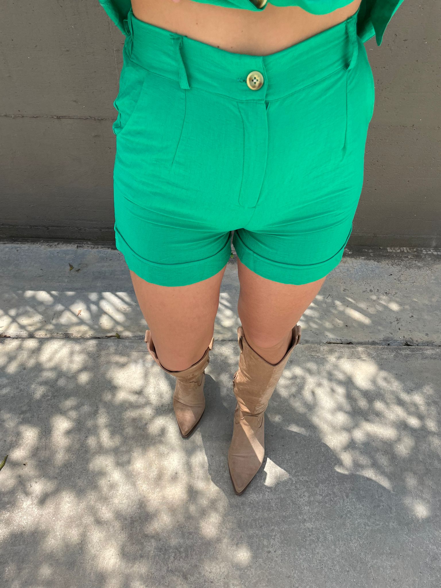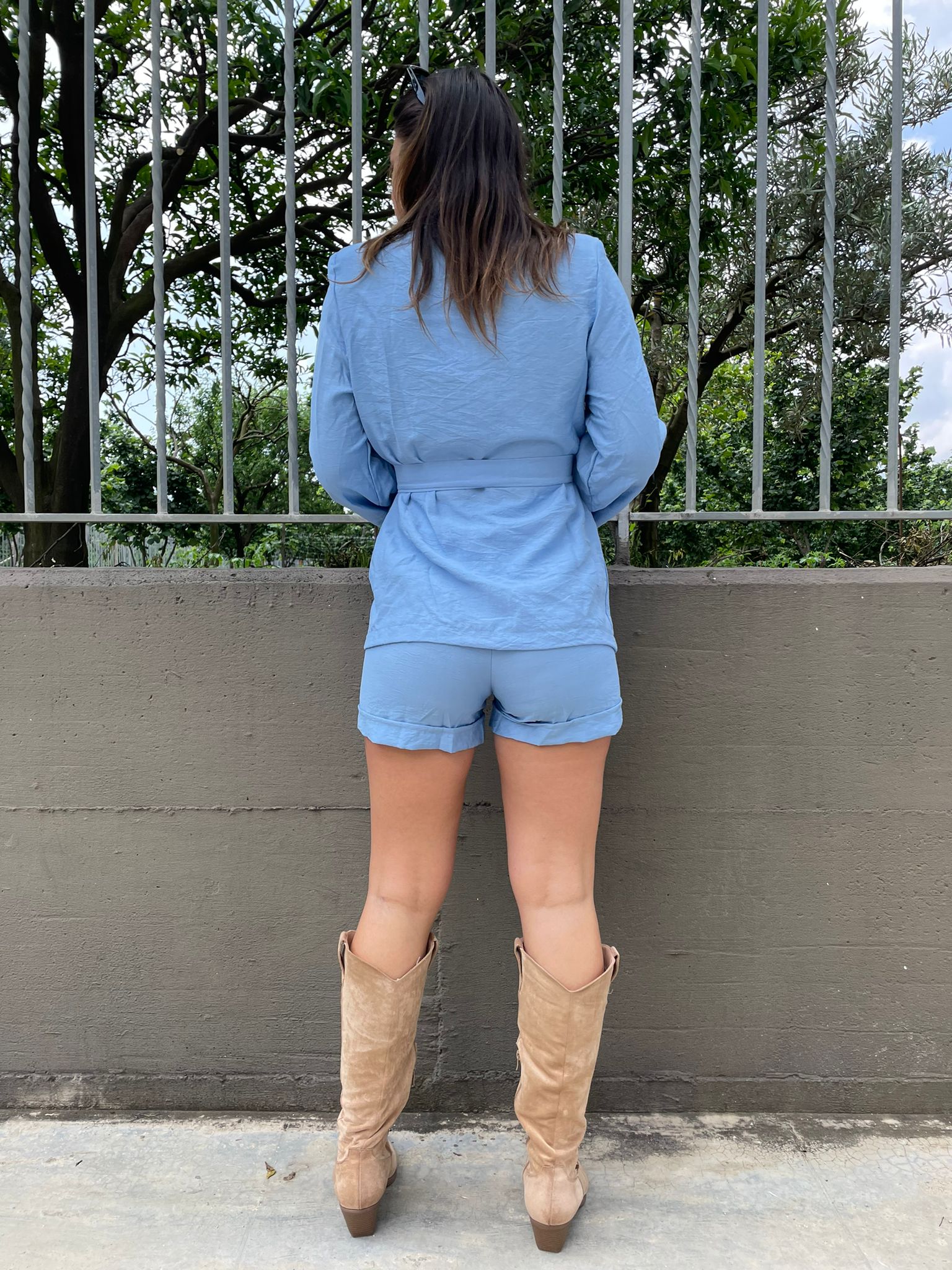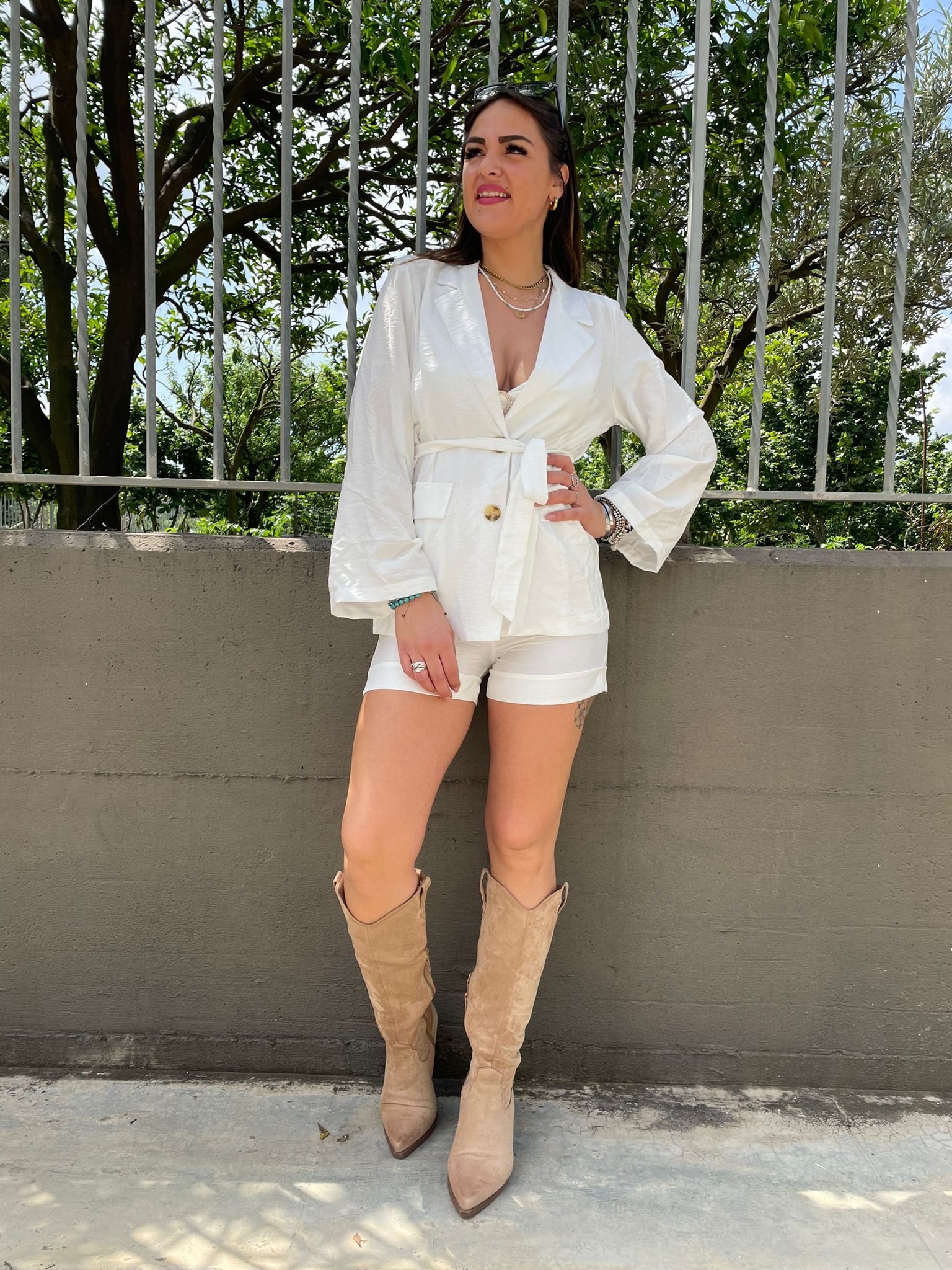 Coordinato 3 pezzi effetto lino con pantaloncino e top swarovski