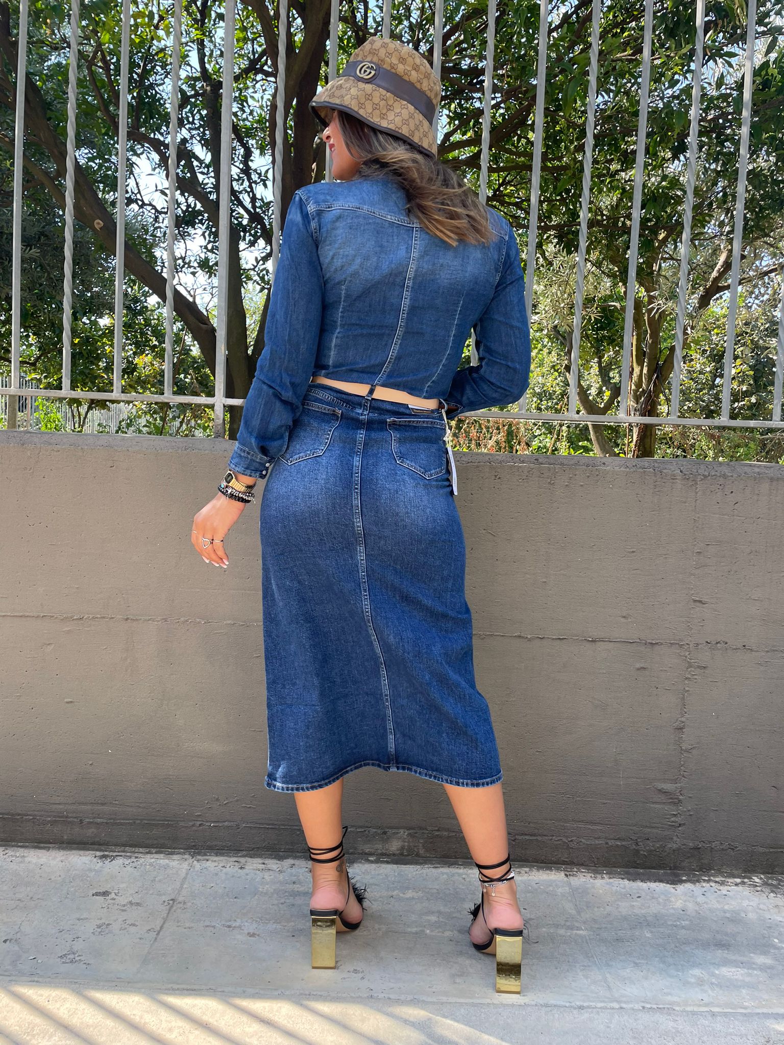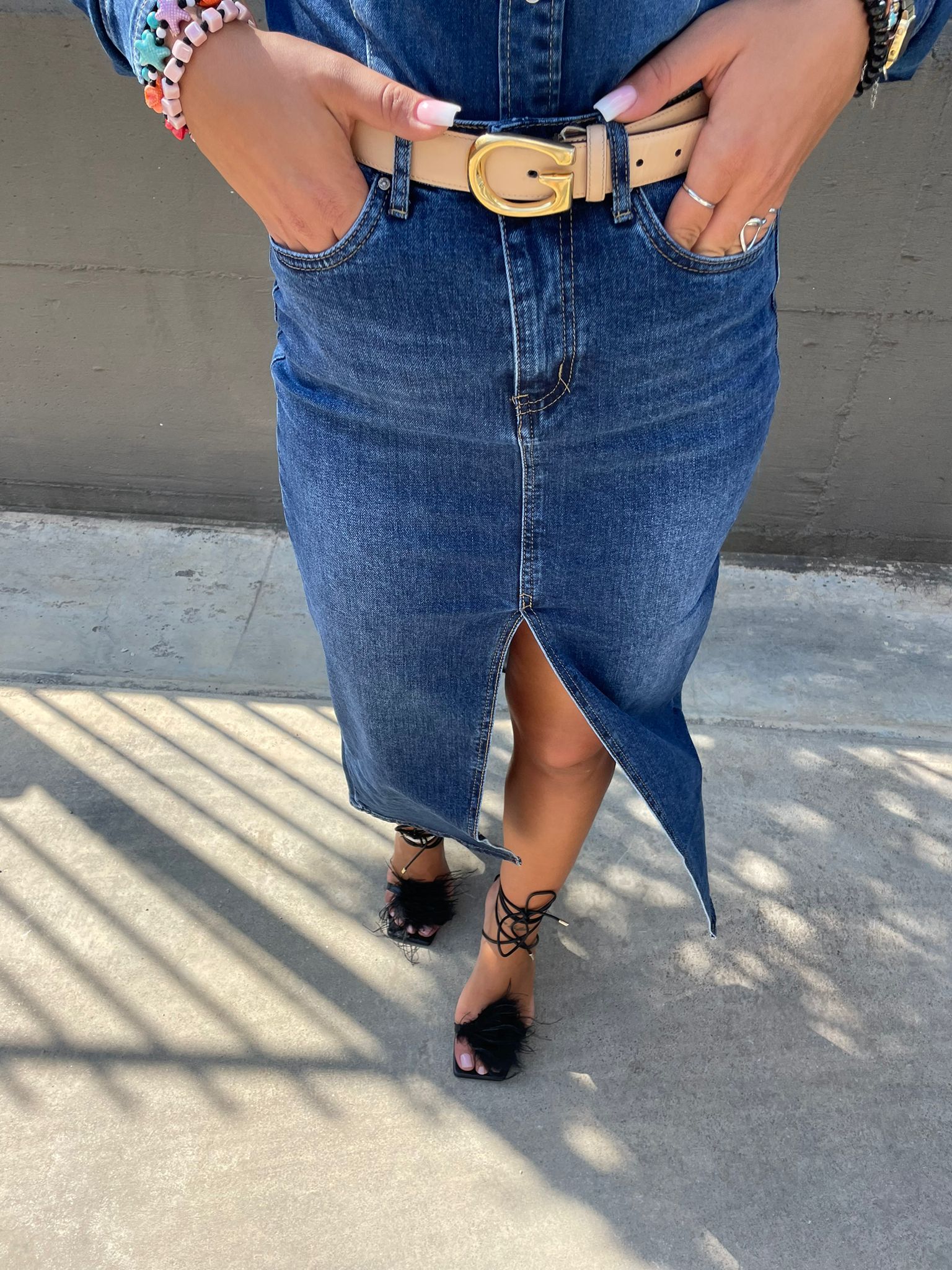 Gonna lunga di jeans lavaggio scuro con spacco centrale