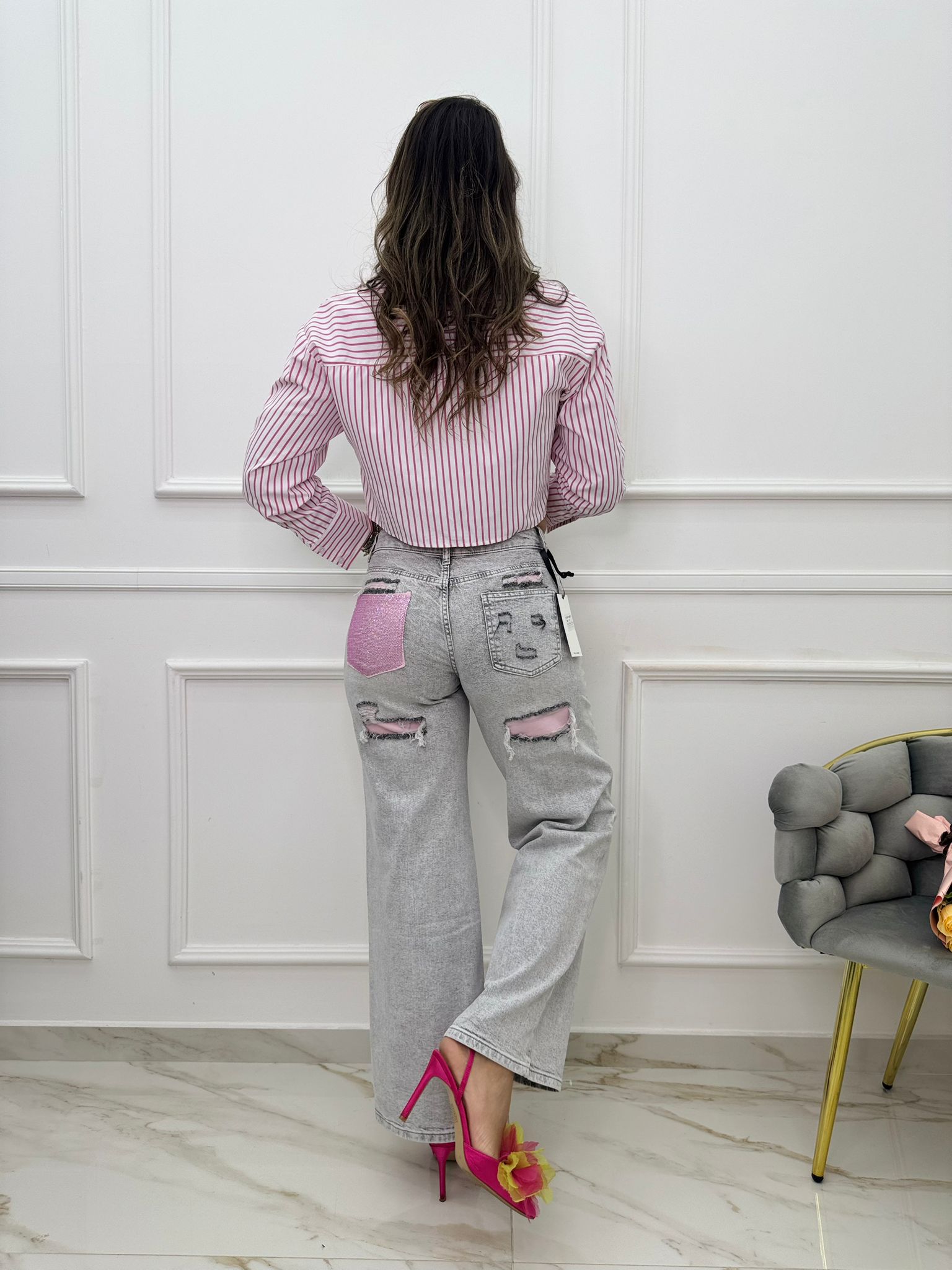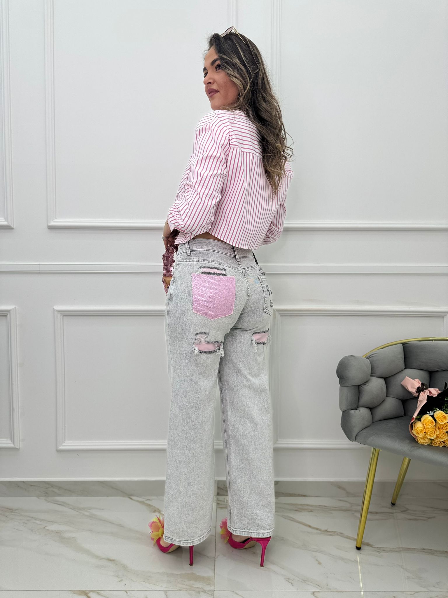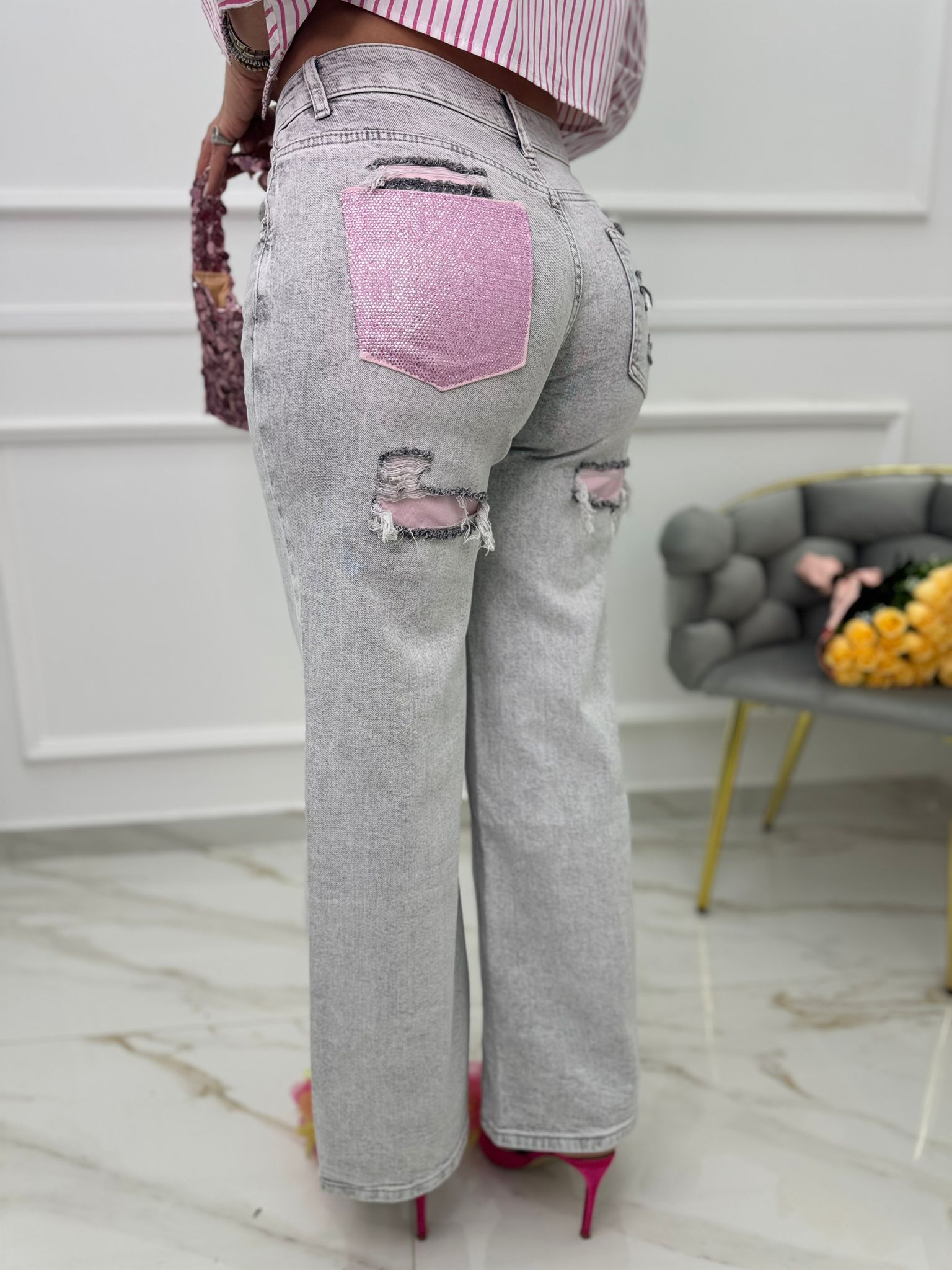 Jeans grigio palazzo con tasca rosa glitterata