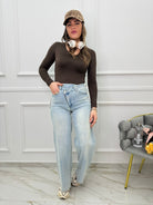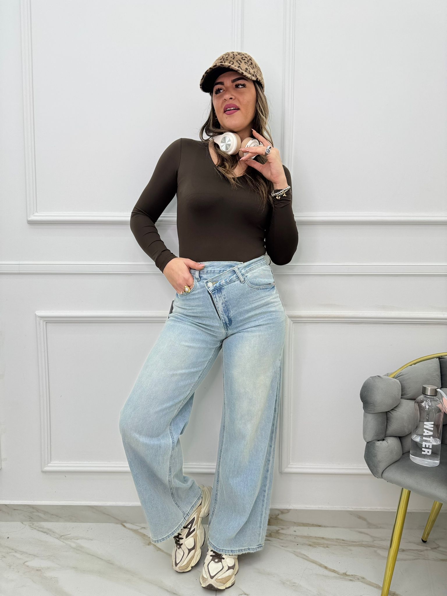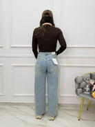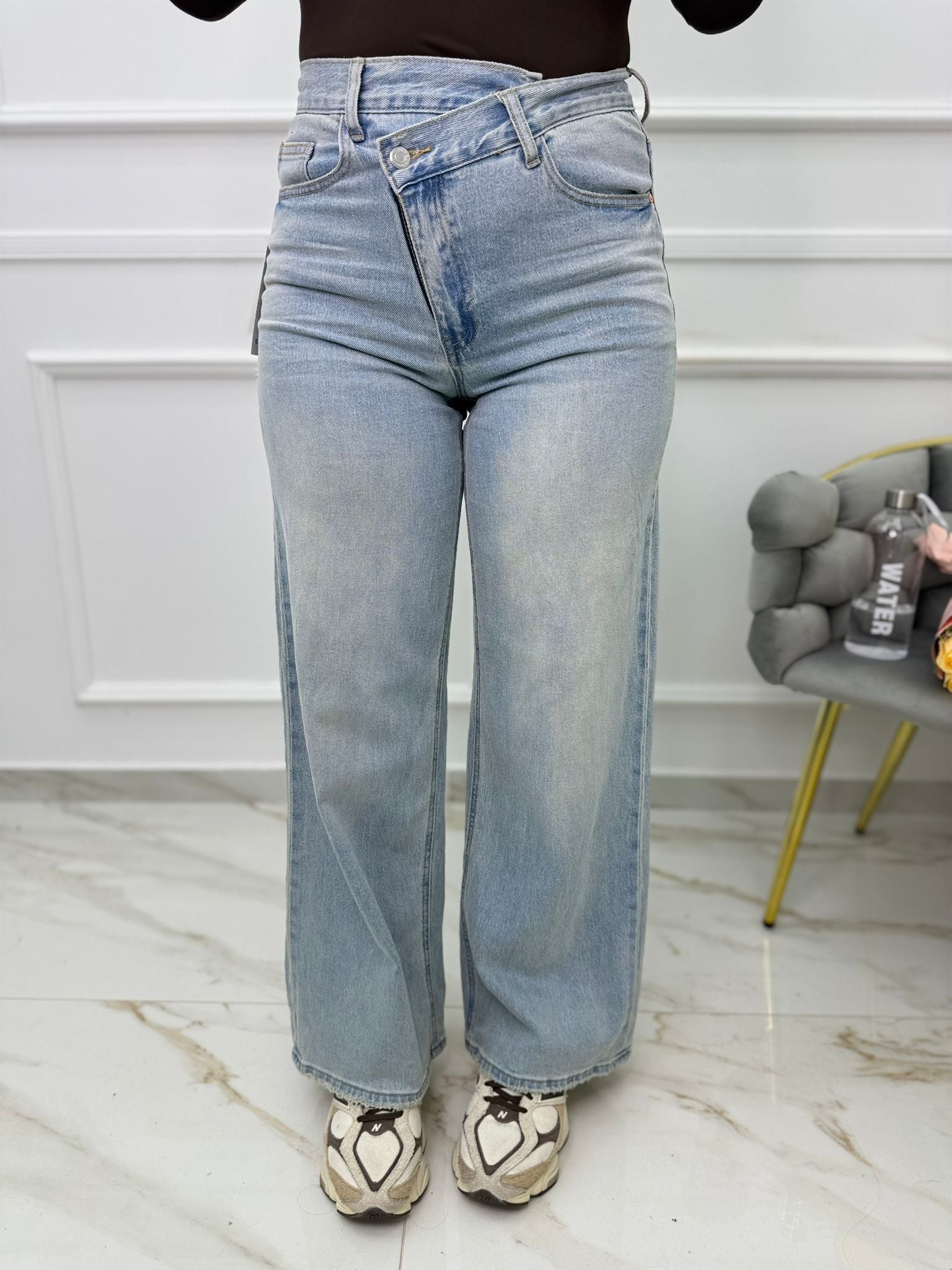 Jeans wide leg lavaggio chiaro con chiusura trsasversale