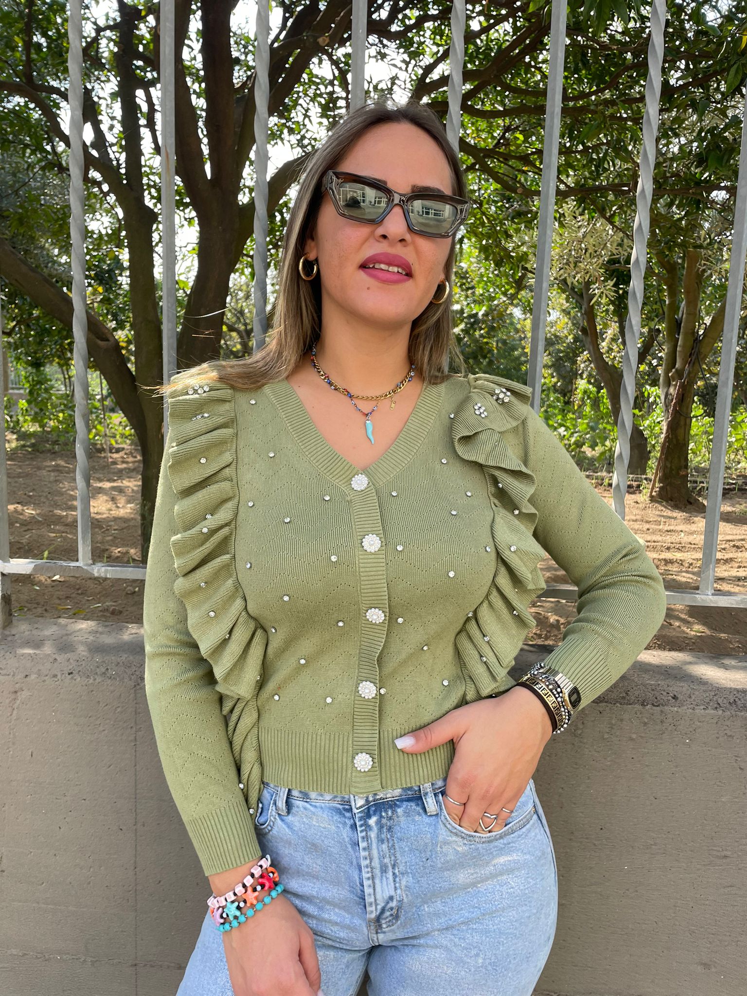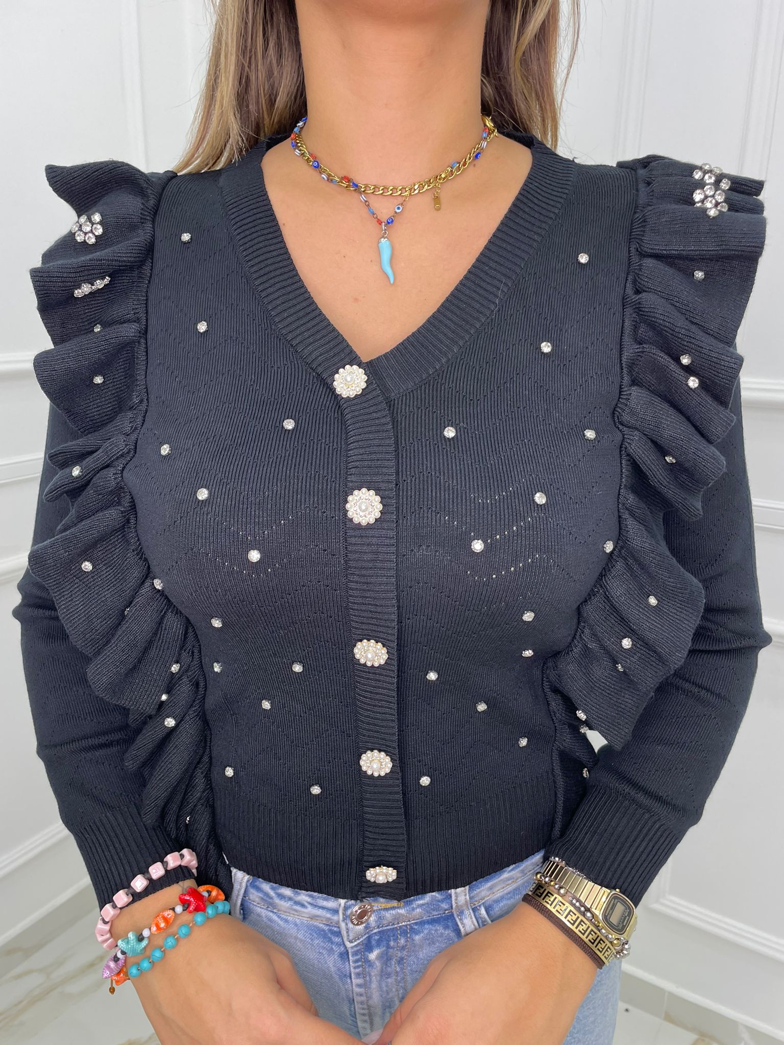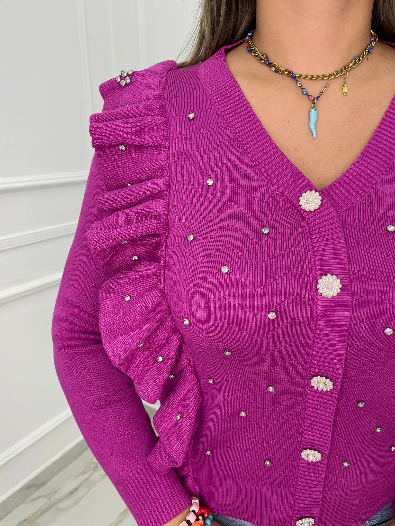Maglia finto cardigan con rouches
