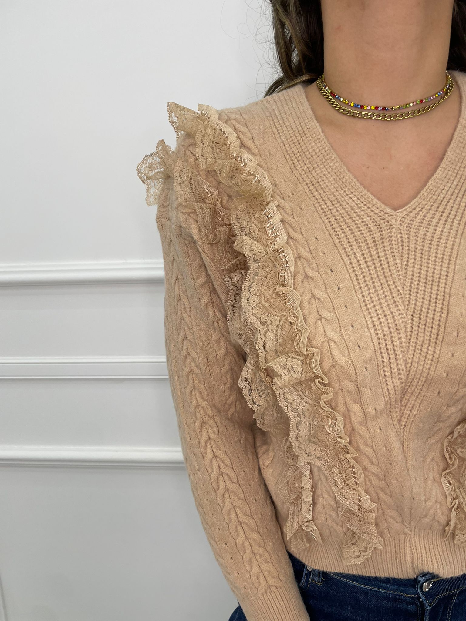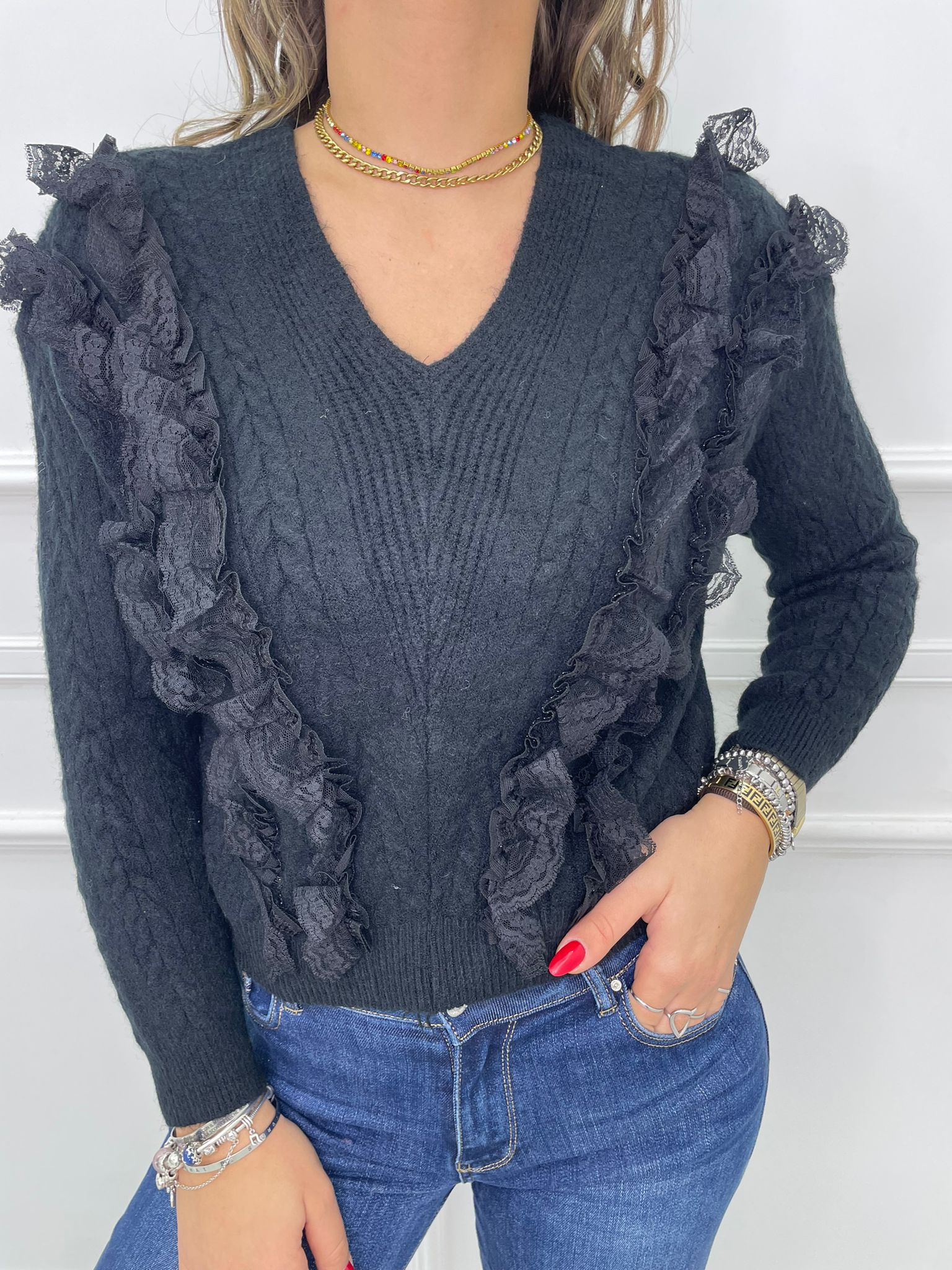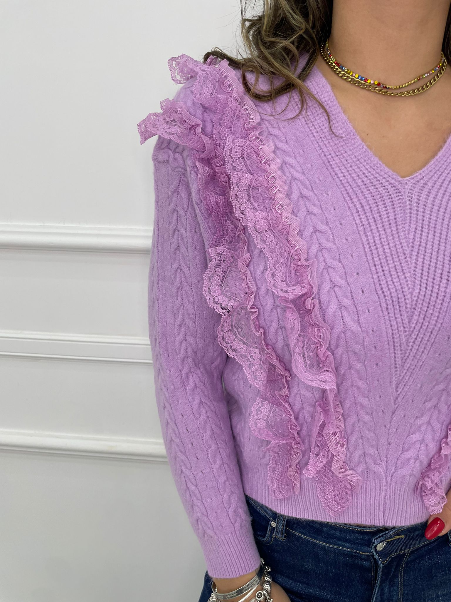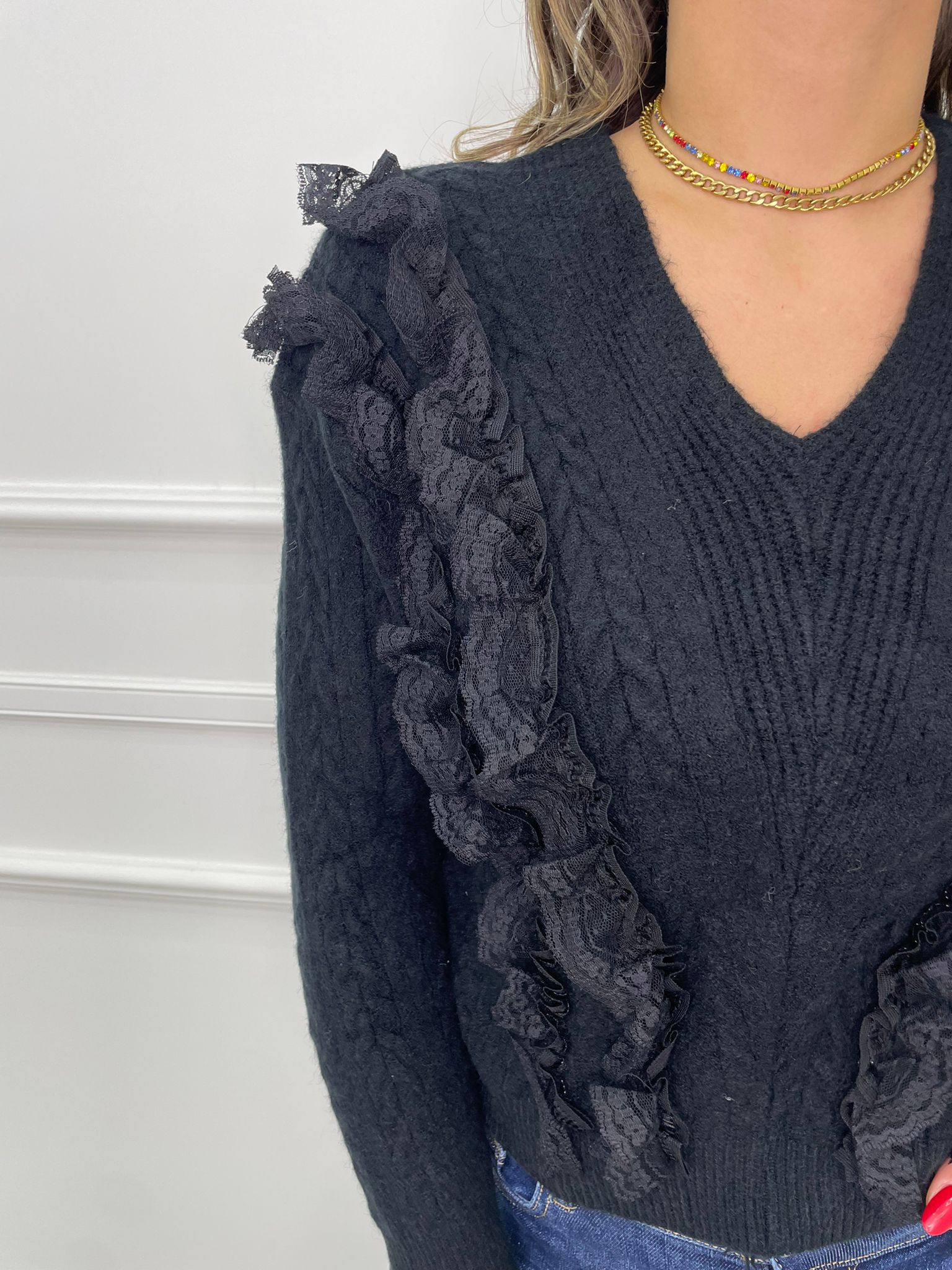 Maglia scollo a V con rouches in merletto