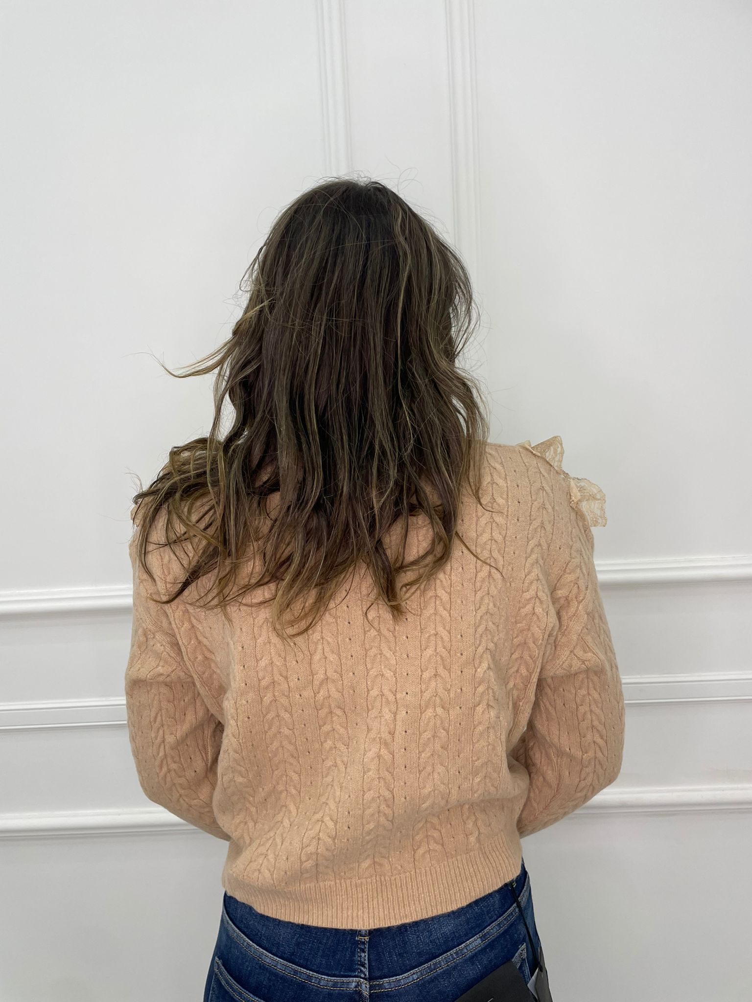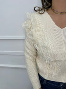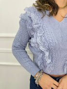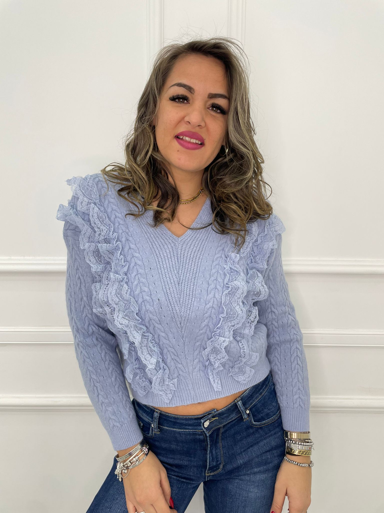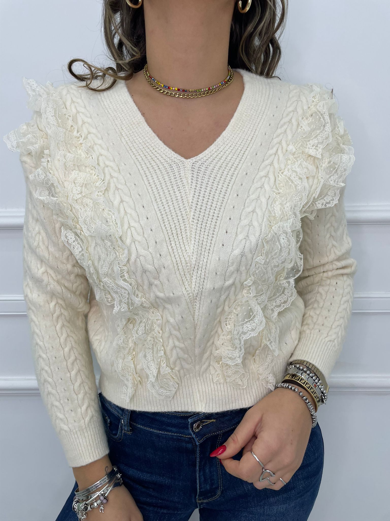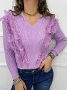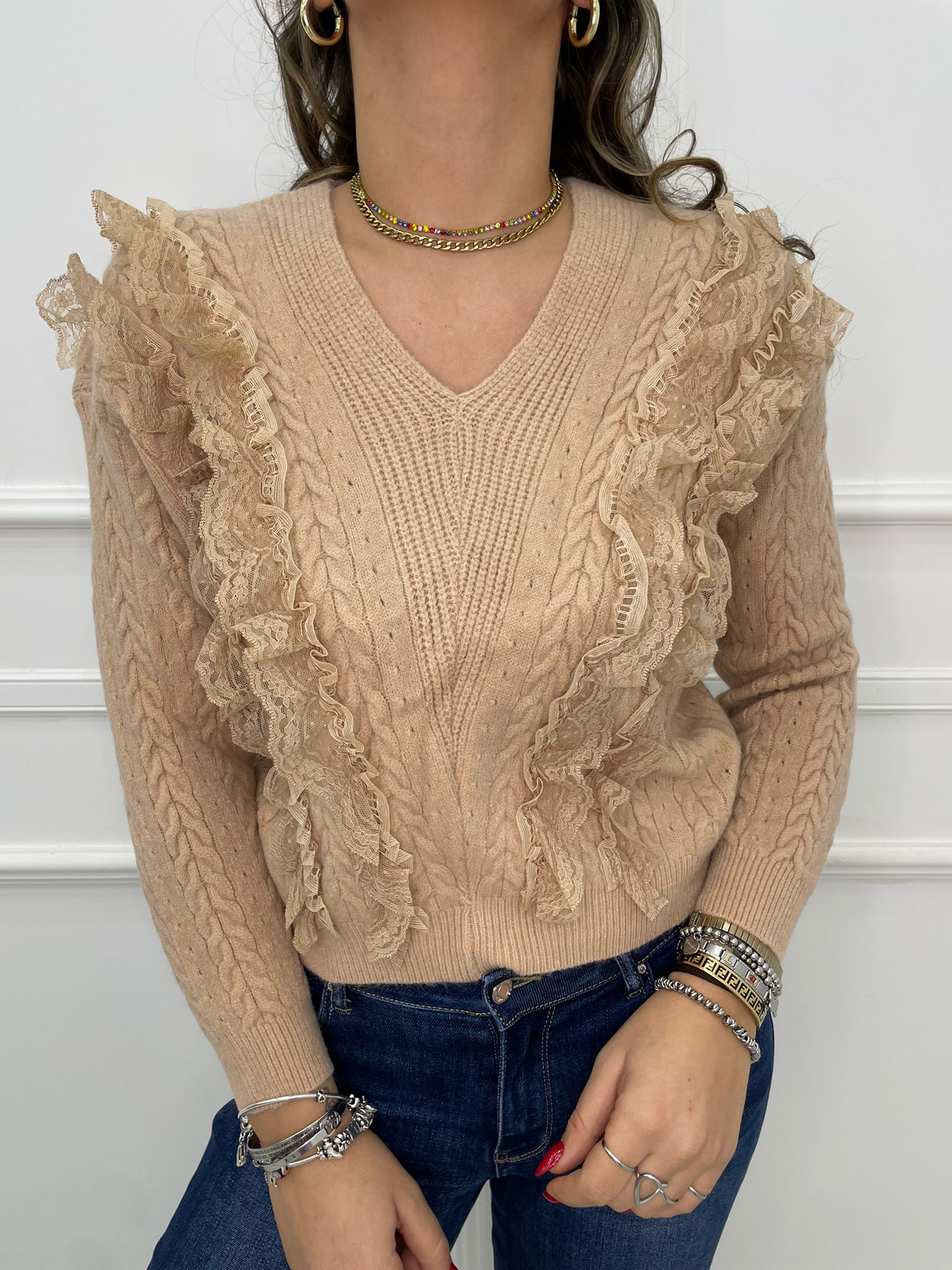 Maglia scollo a V con rouches in merletto