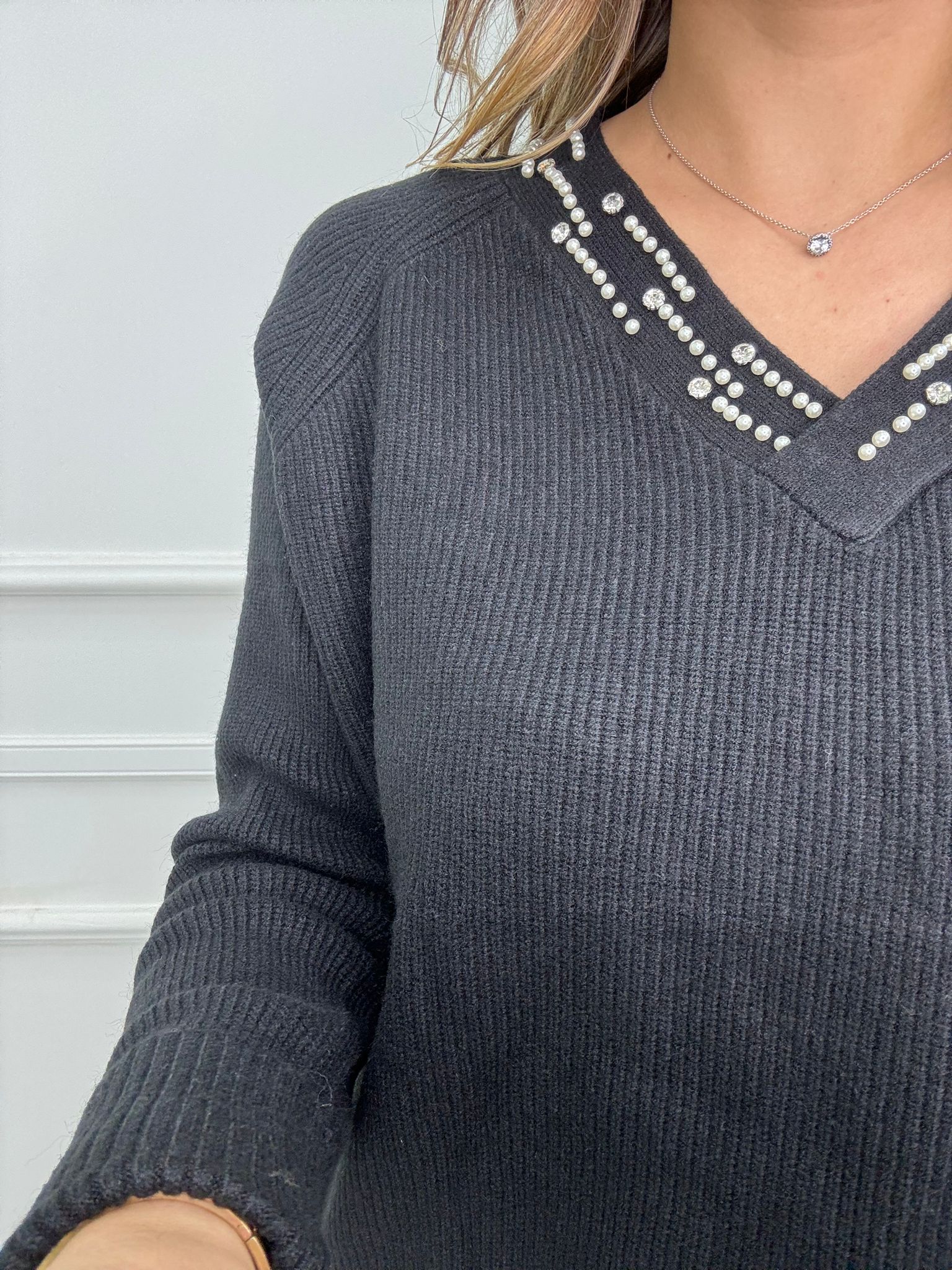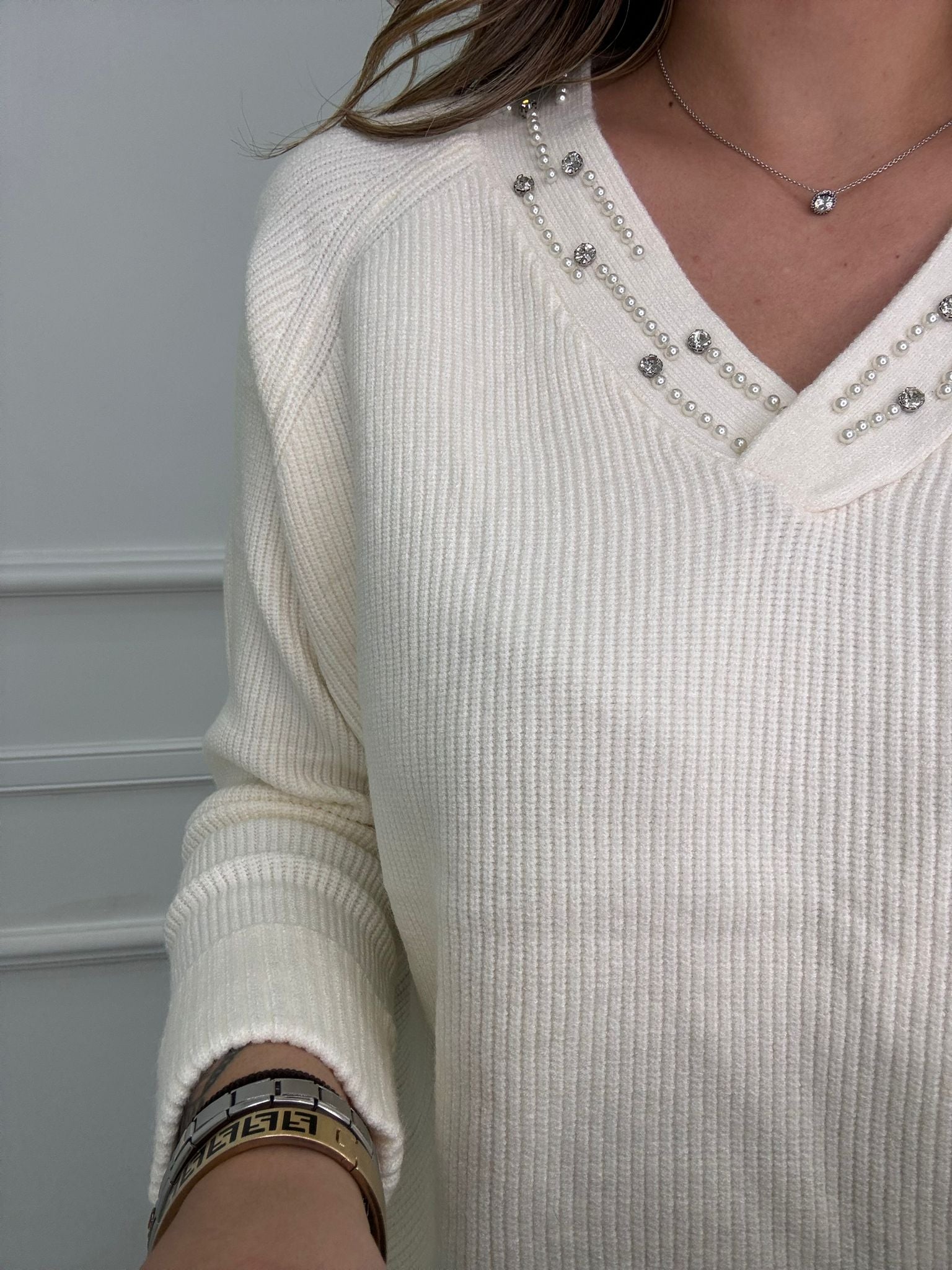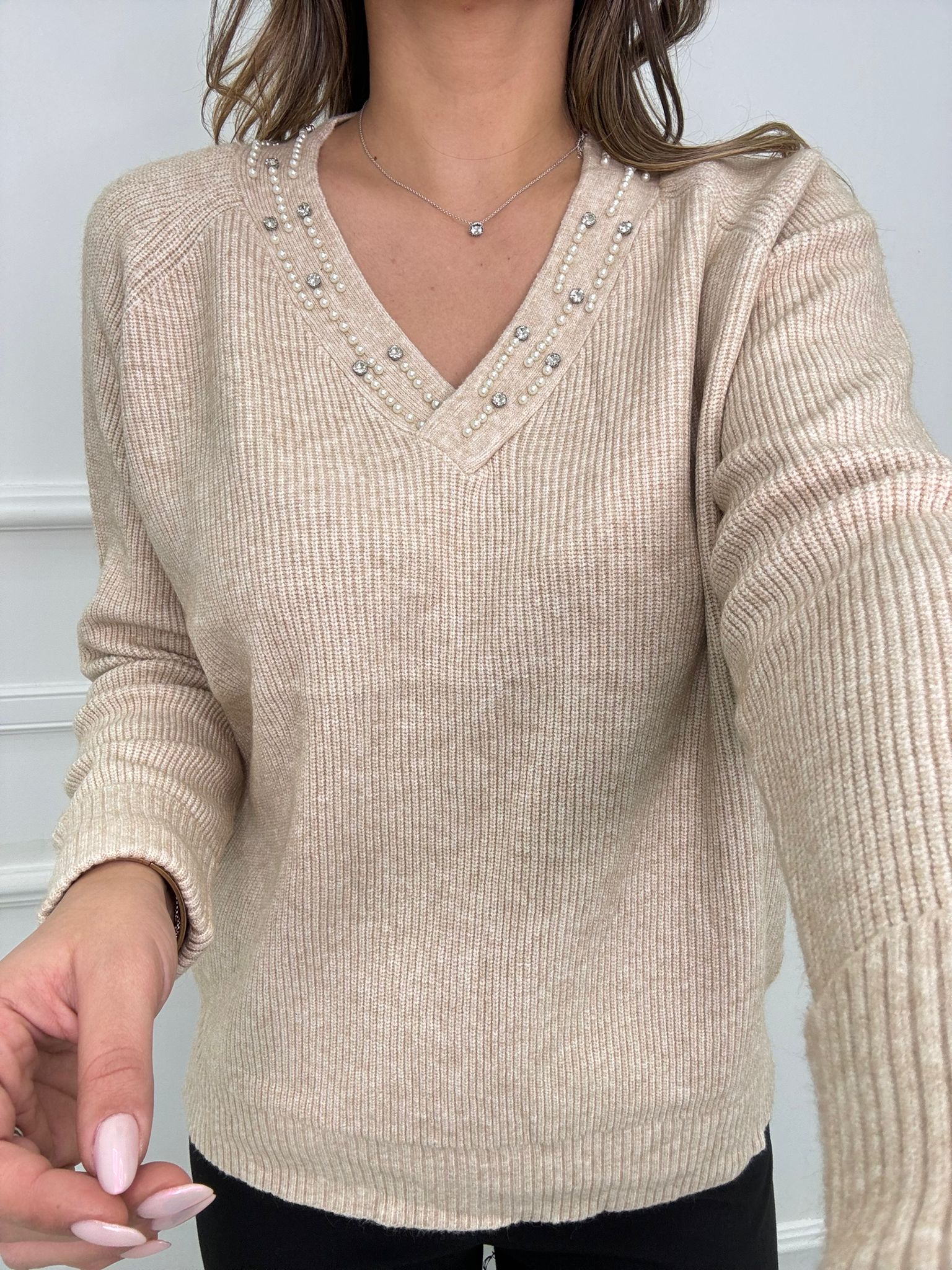 Maglione a coste scollo a V con perle