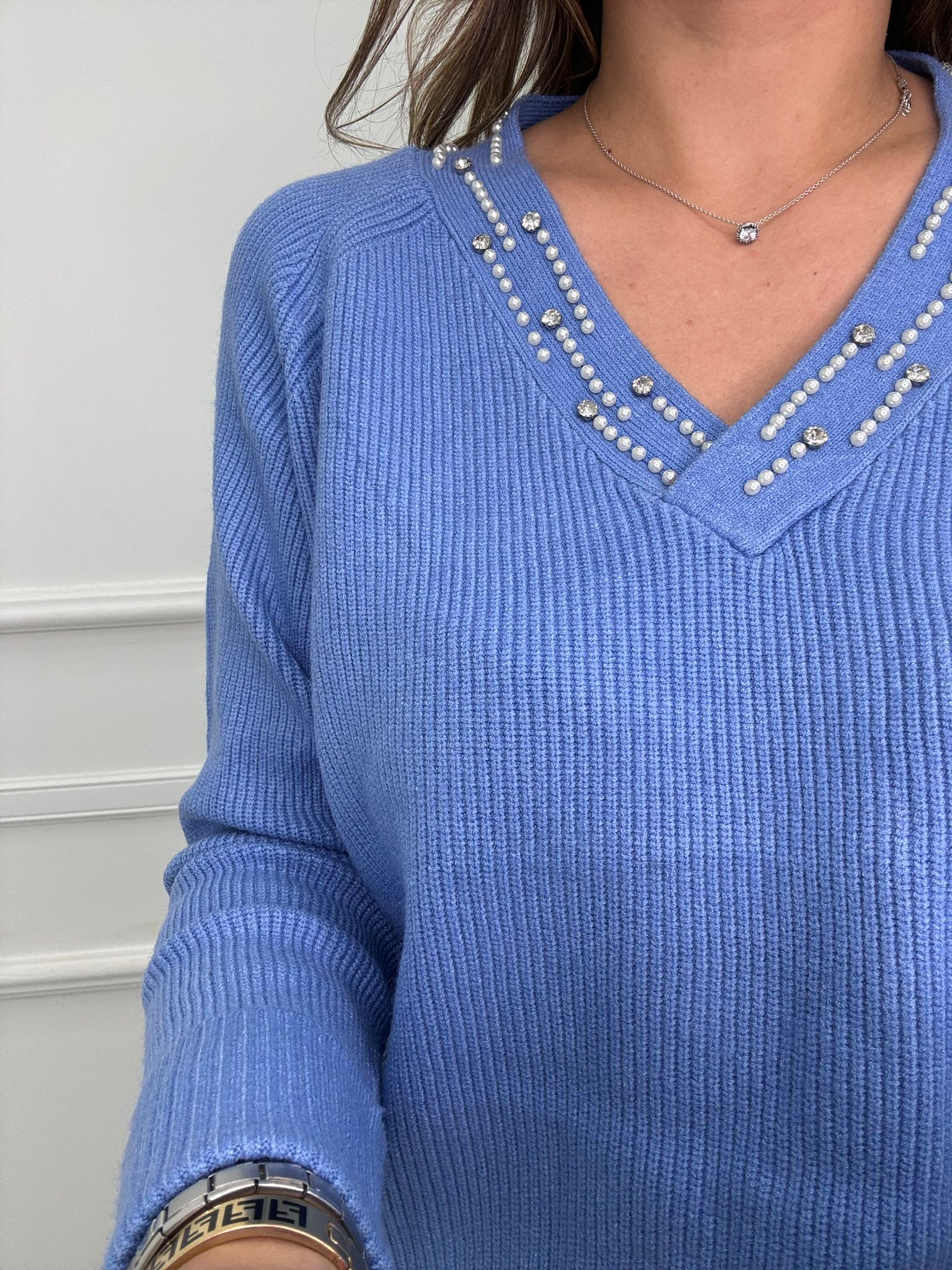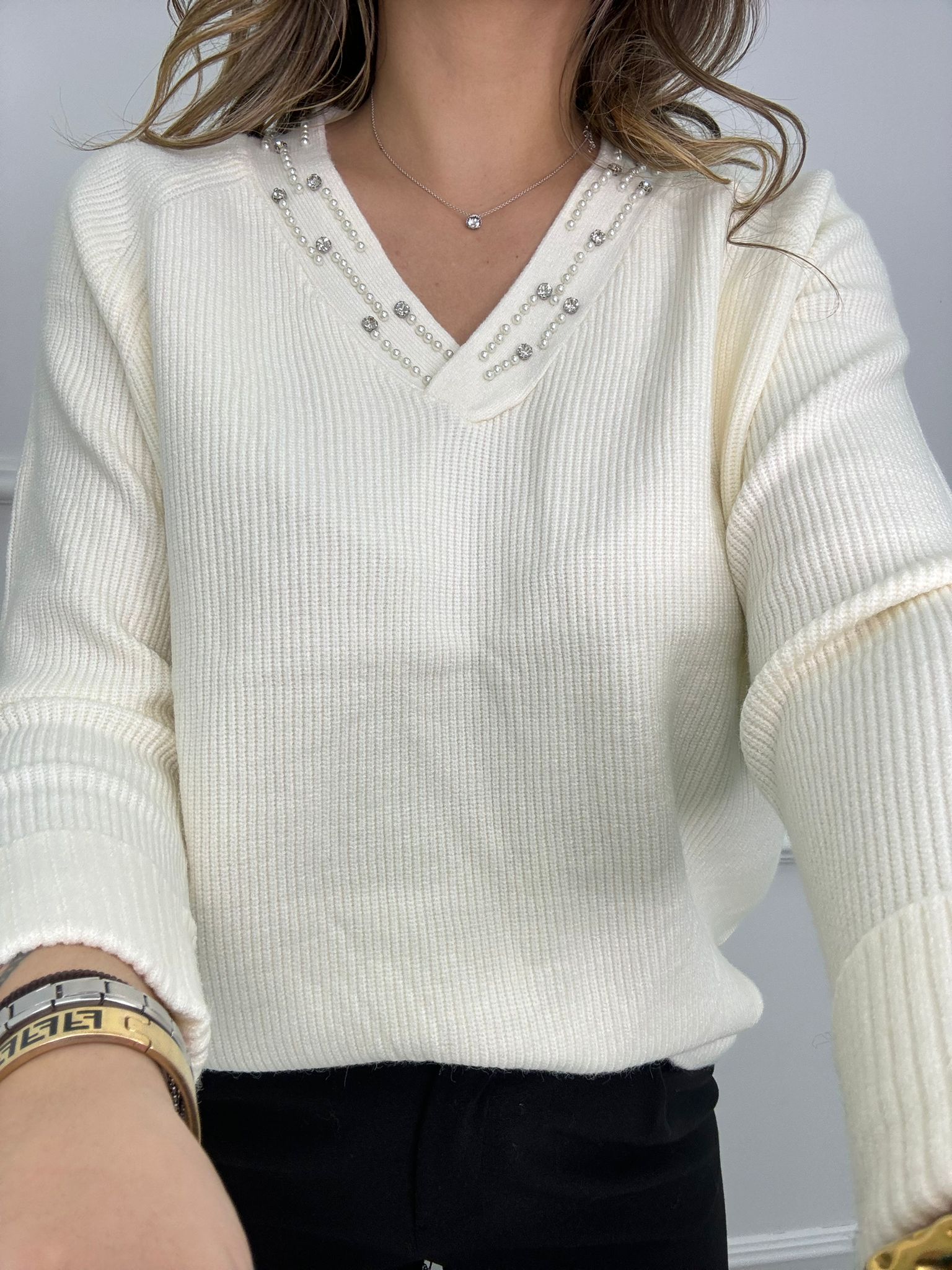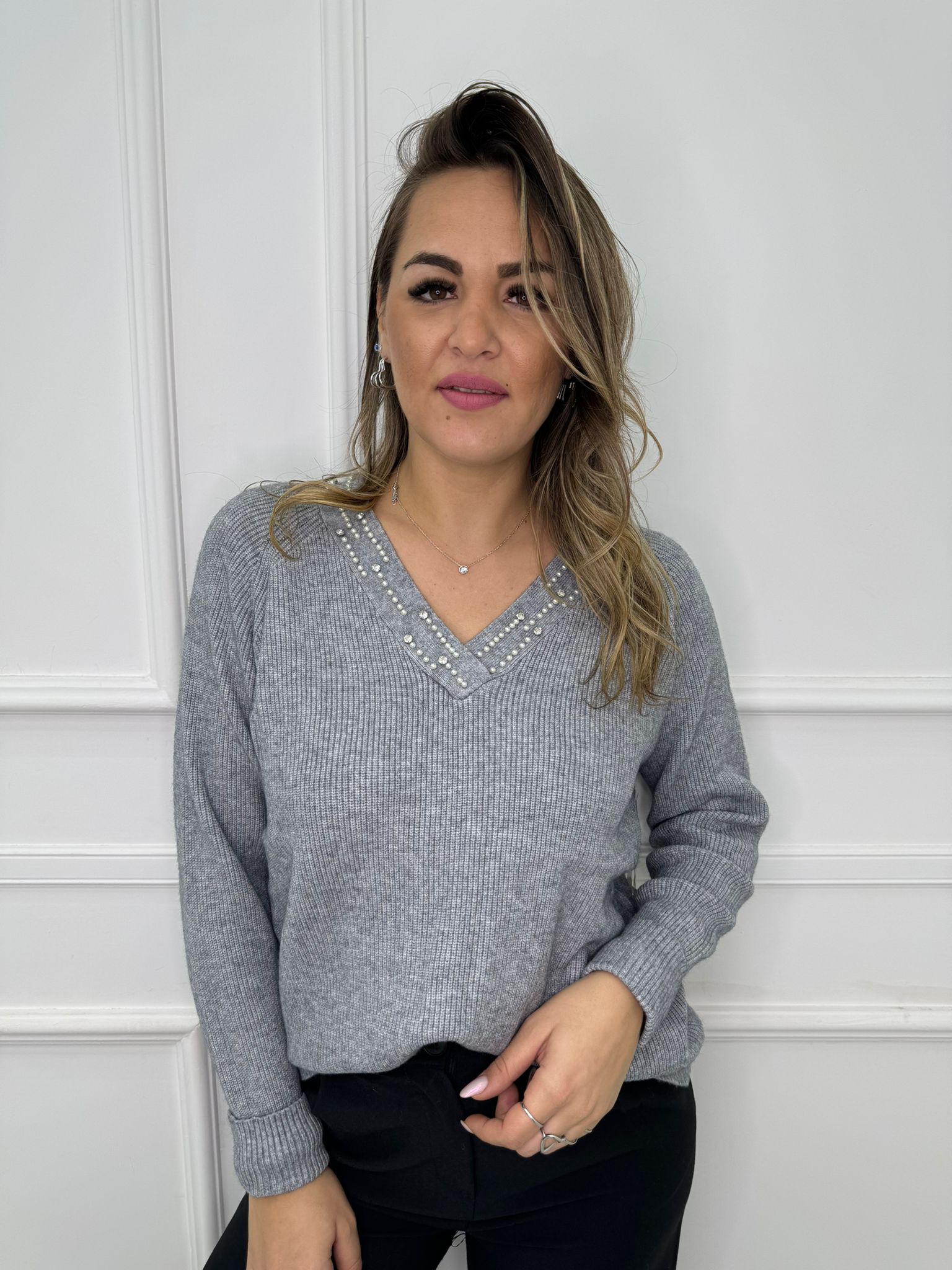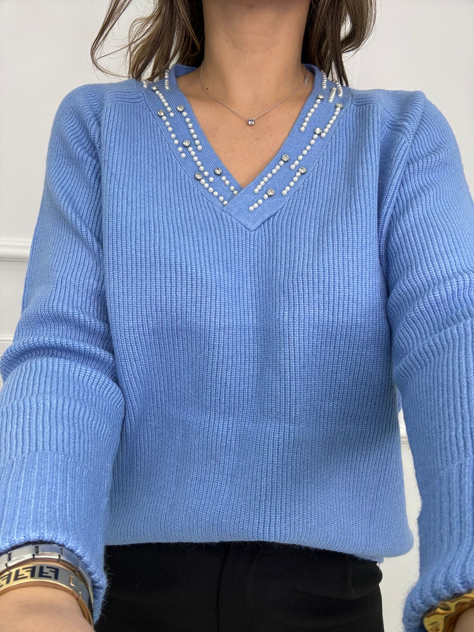 Maglione a coste scollo a V con perle
