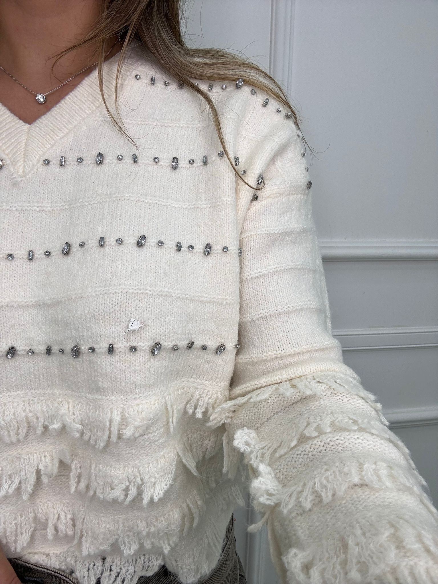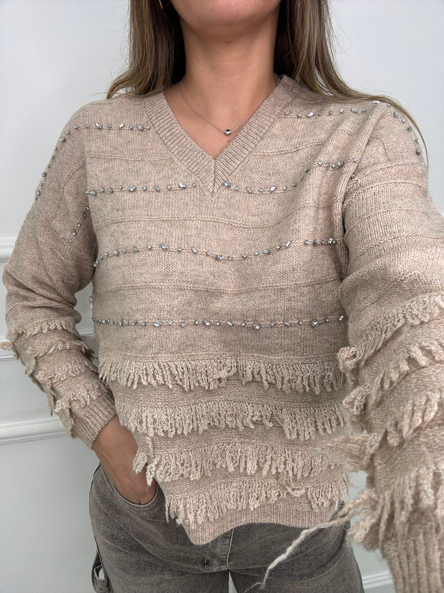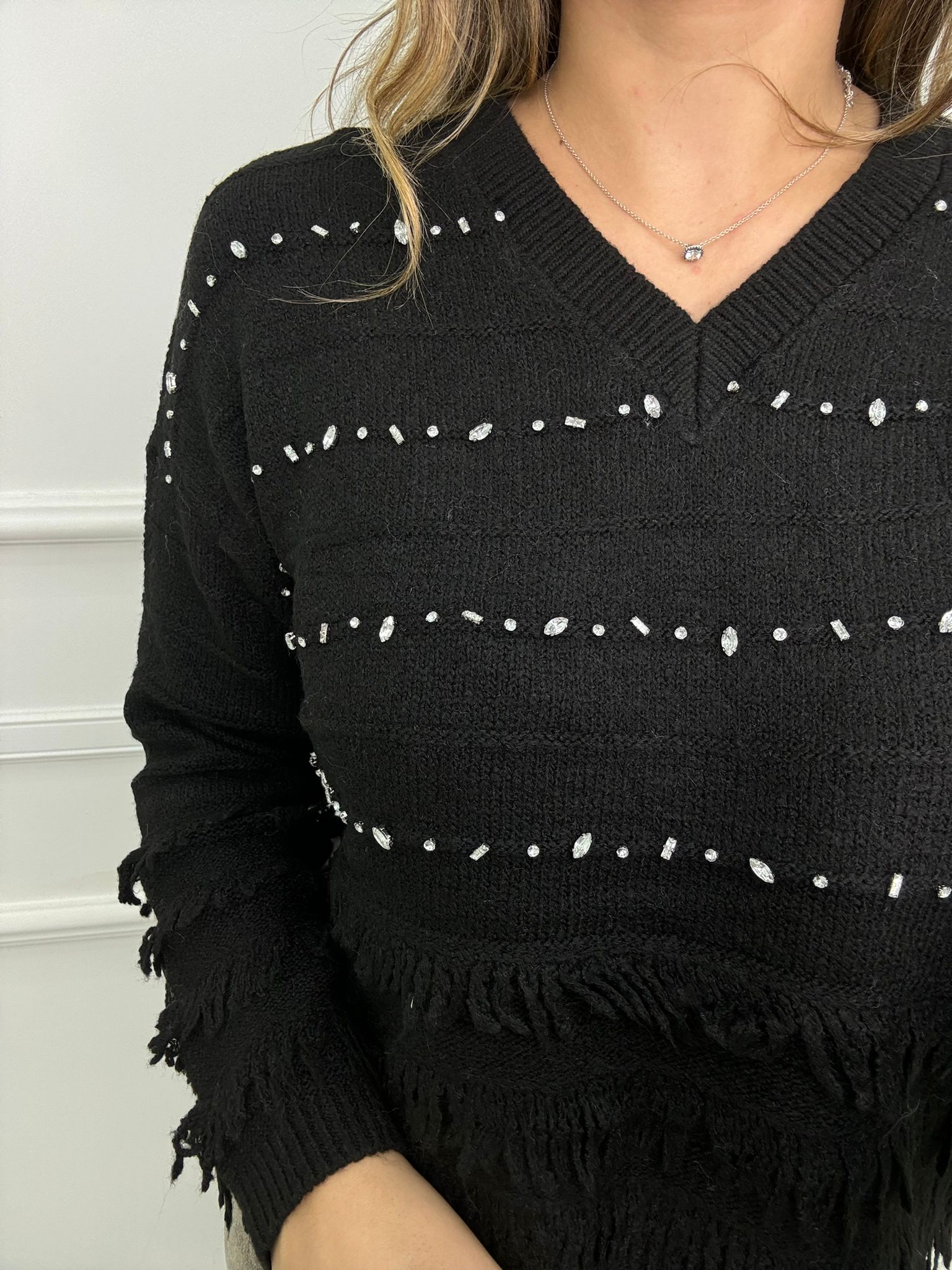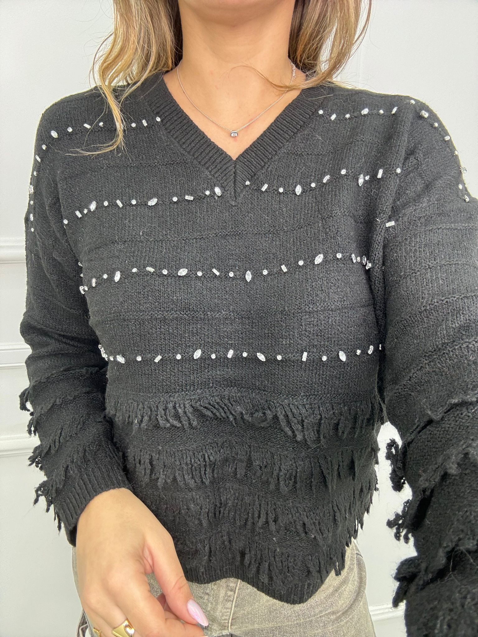 Maglione scollo a V con frange e swarovski