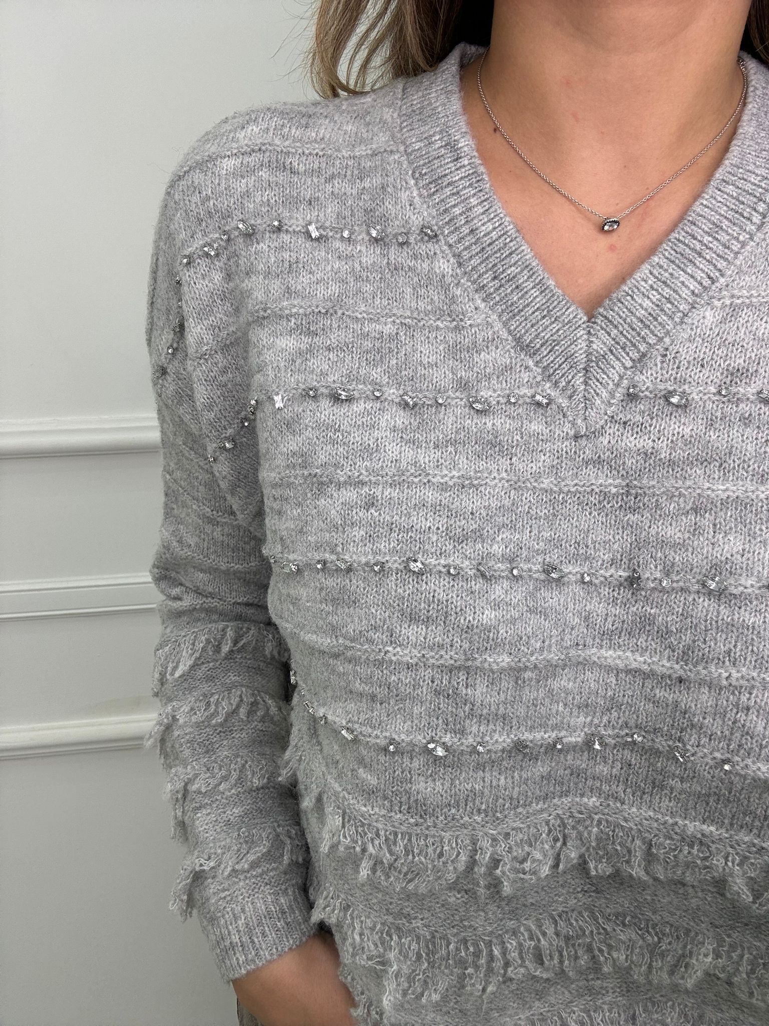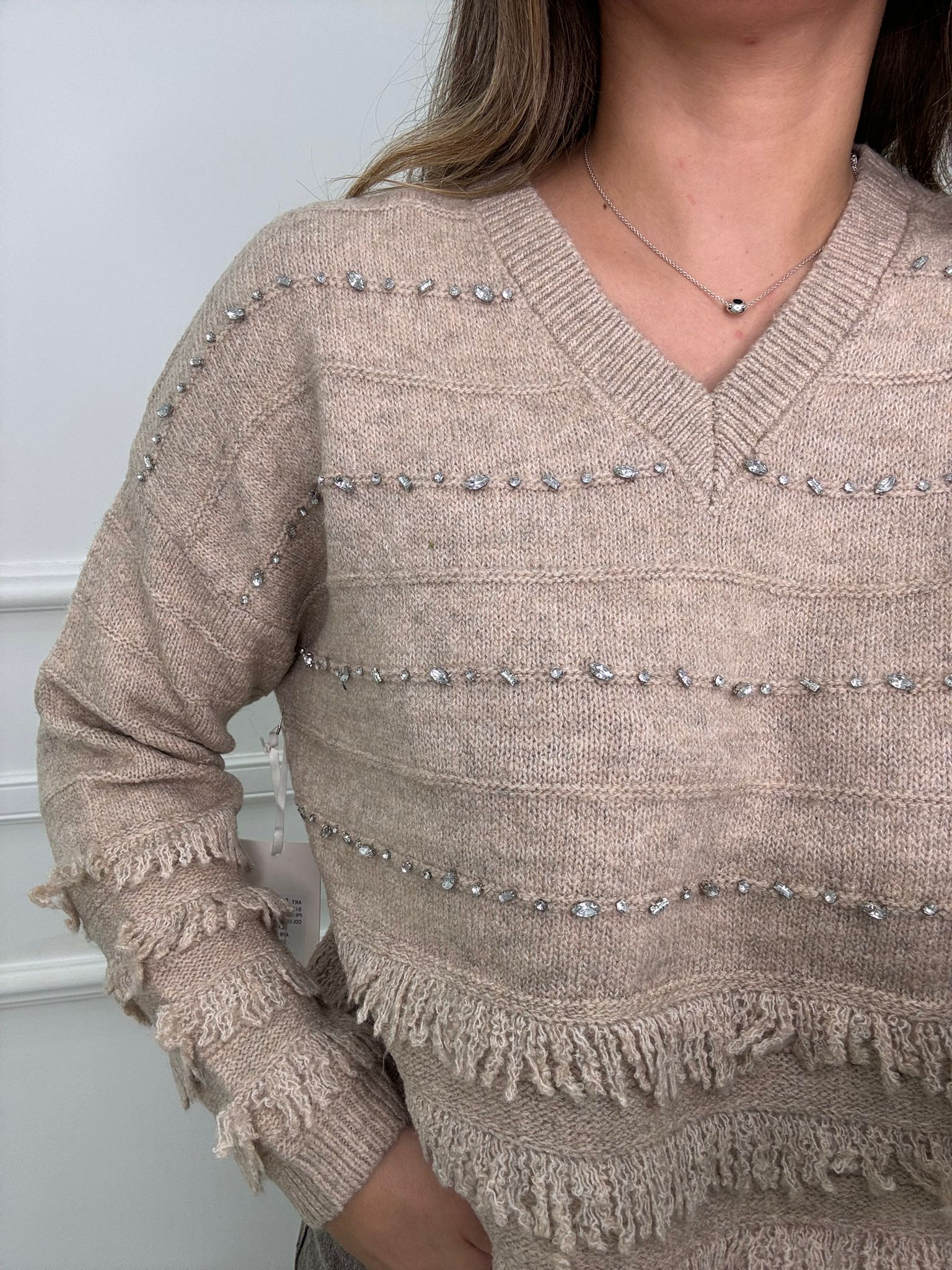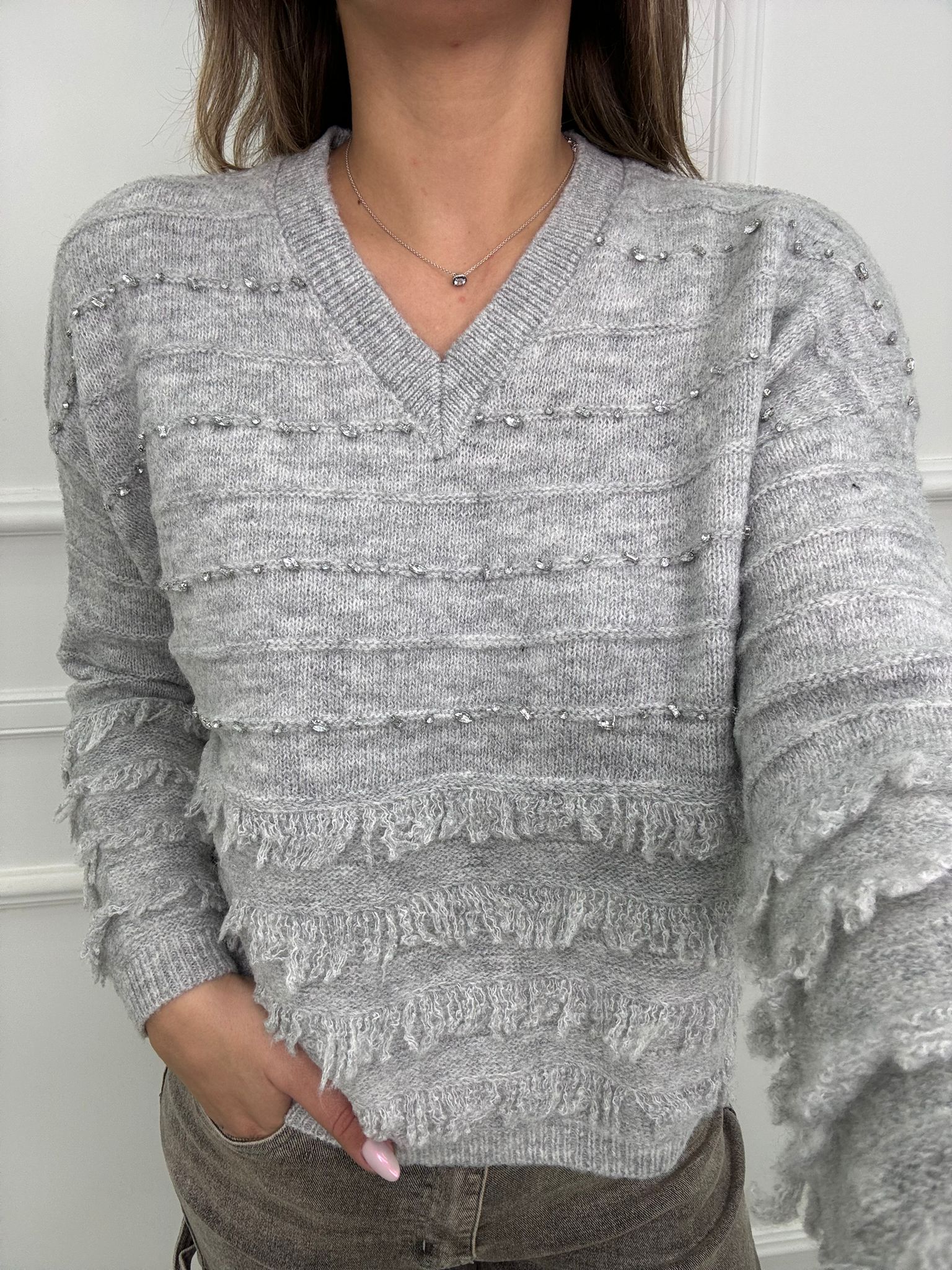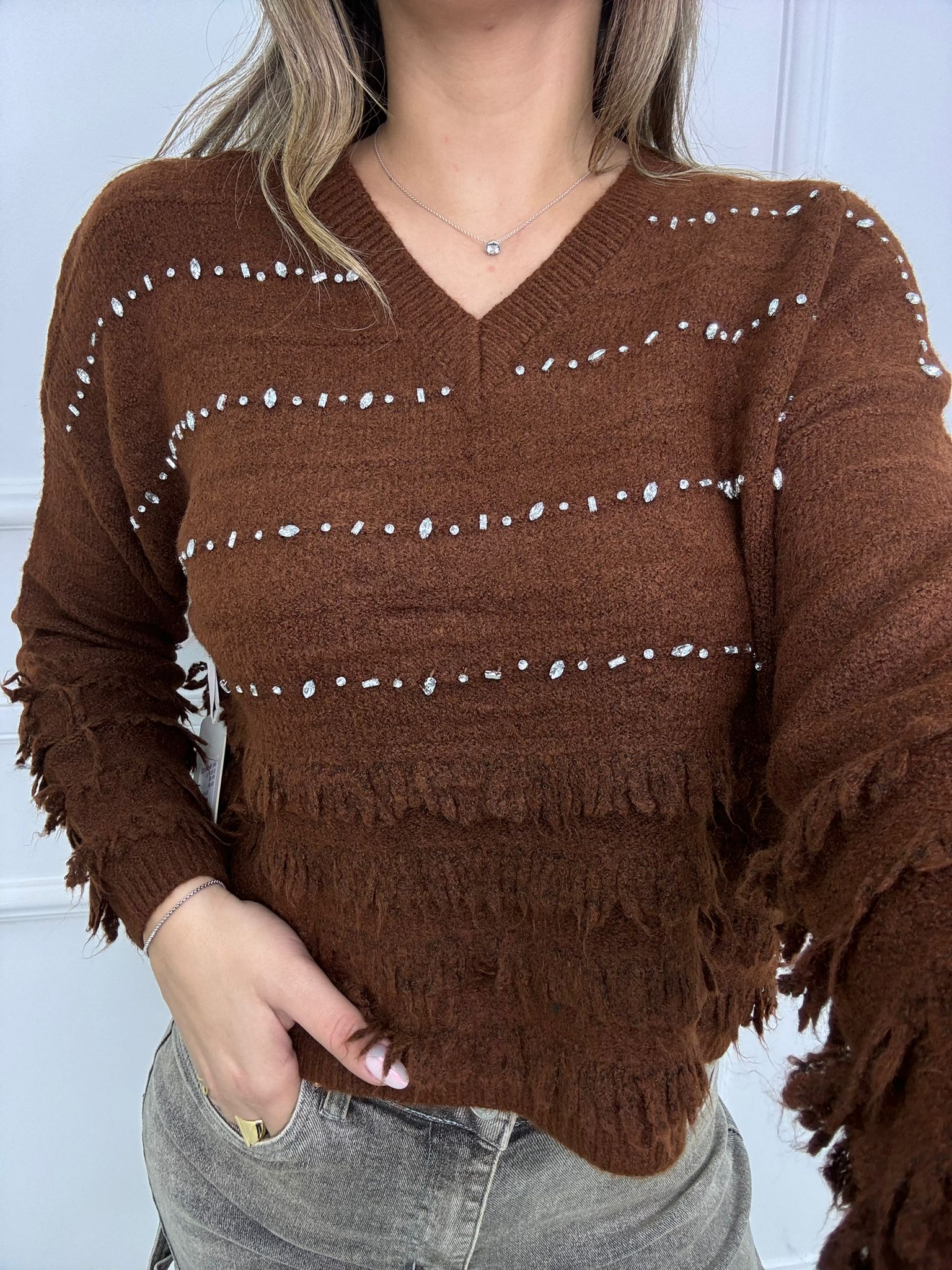 Maglione scollo a V con frange e swarovski