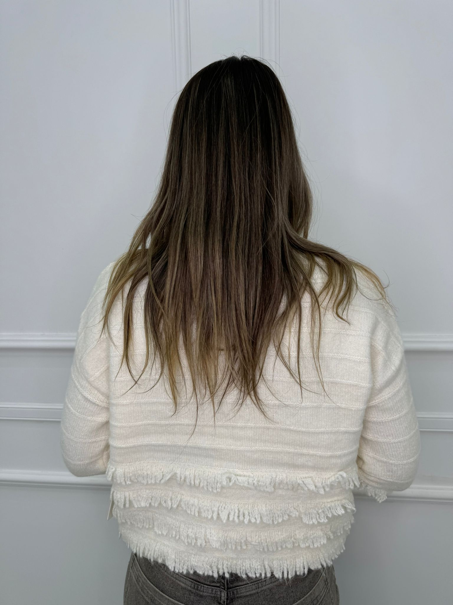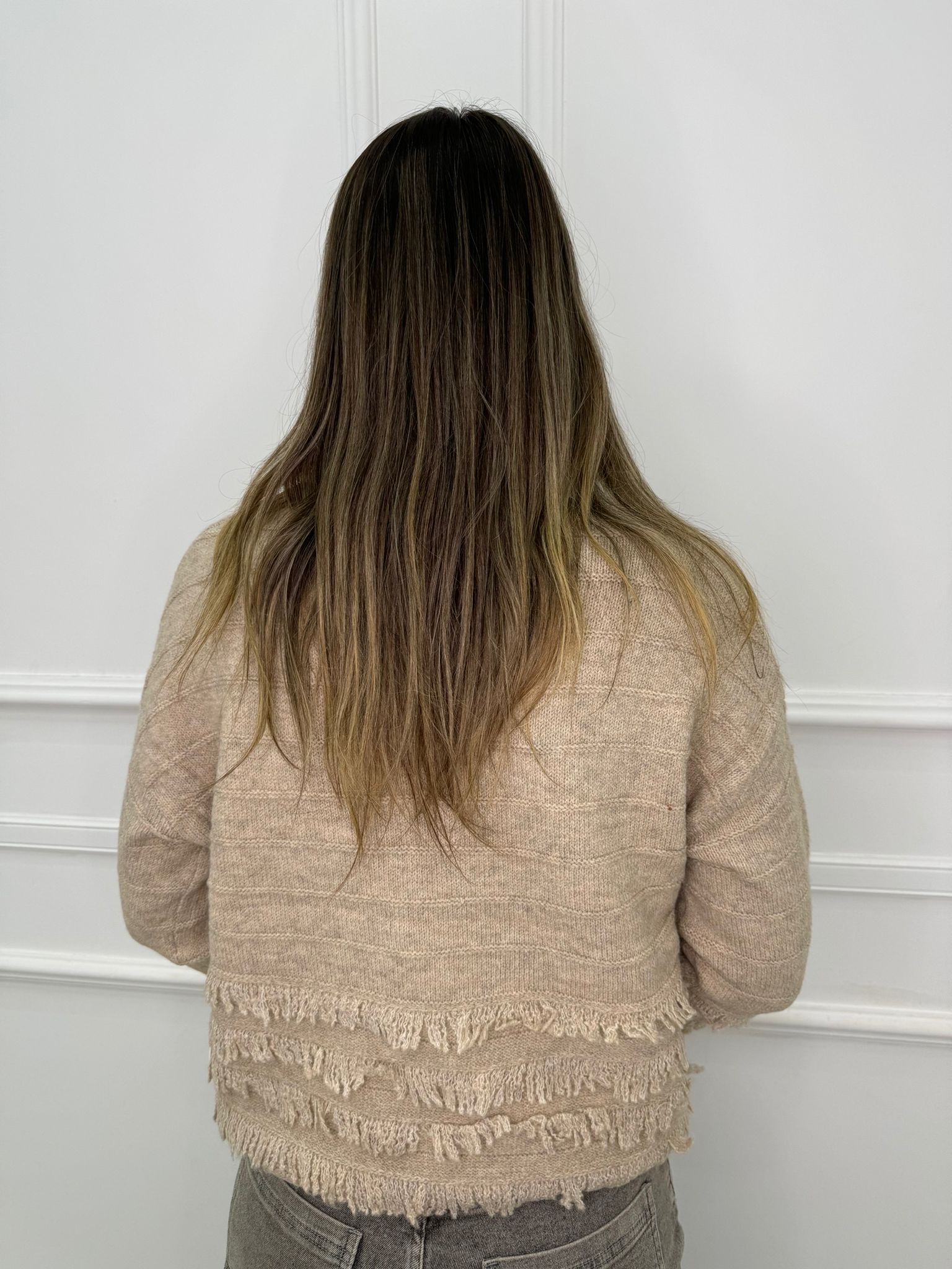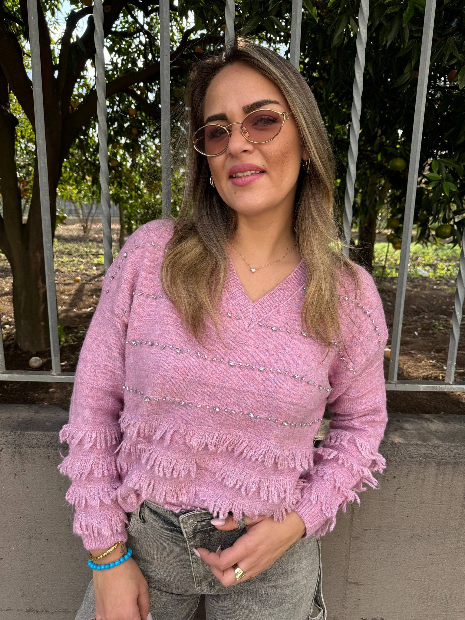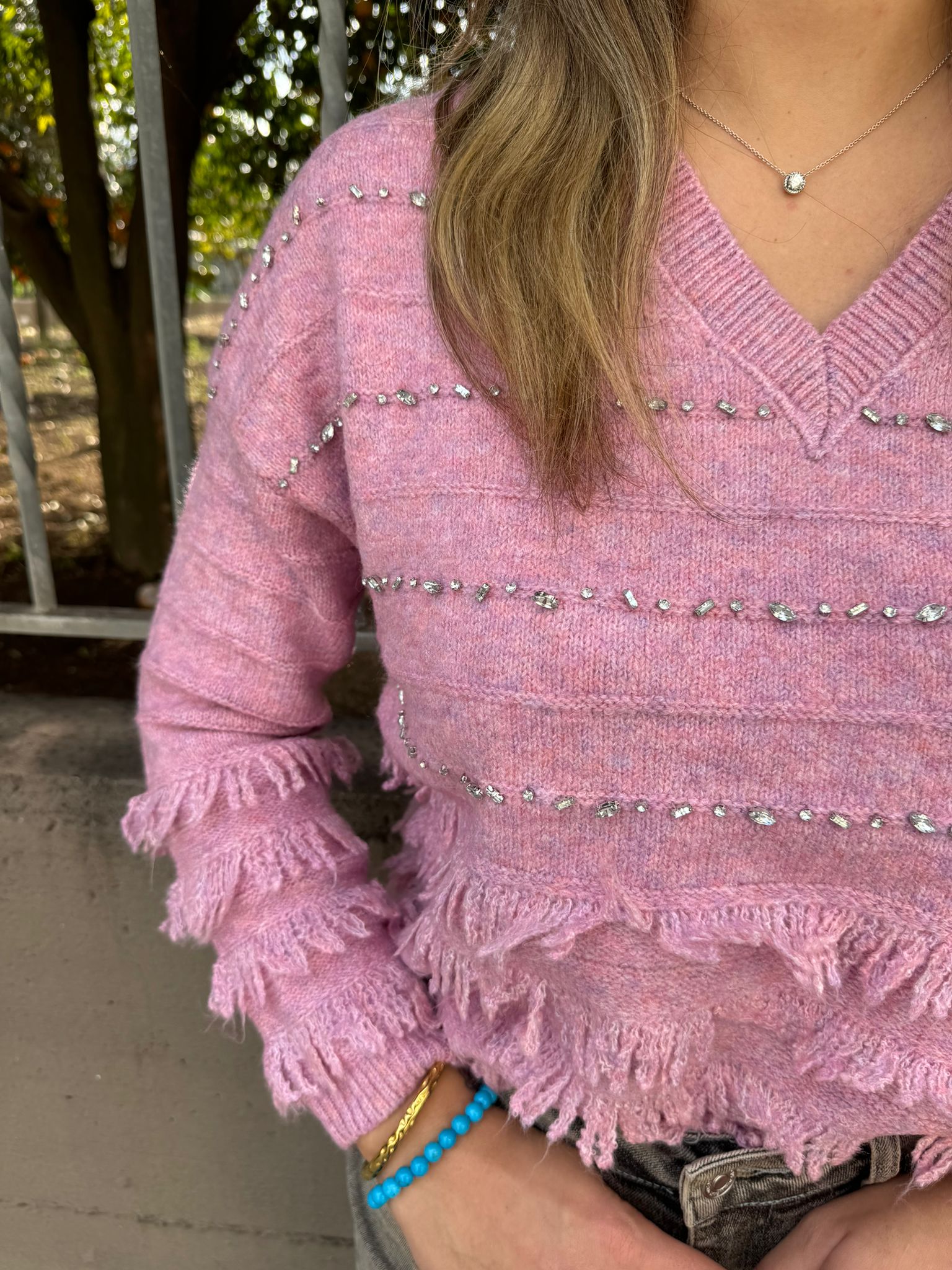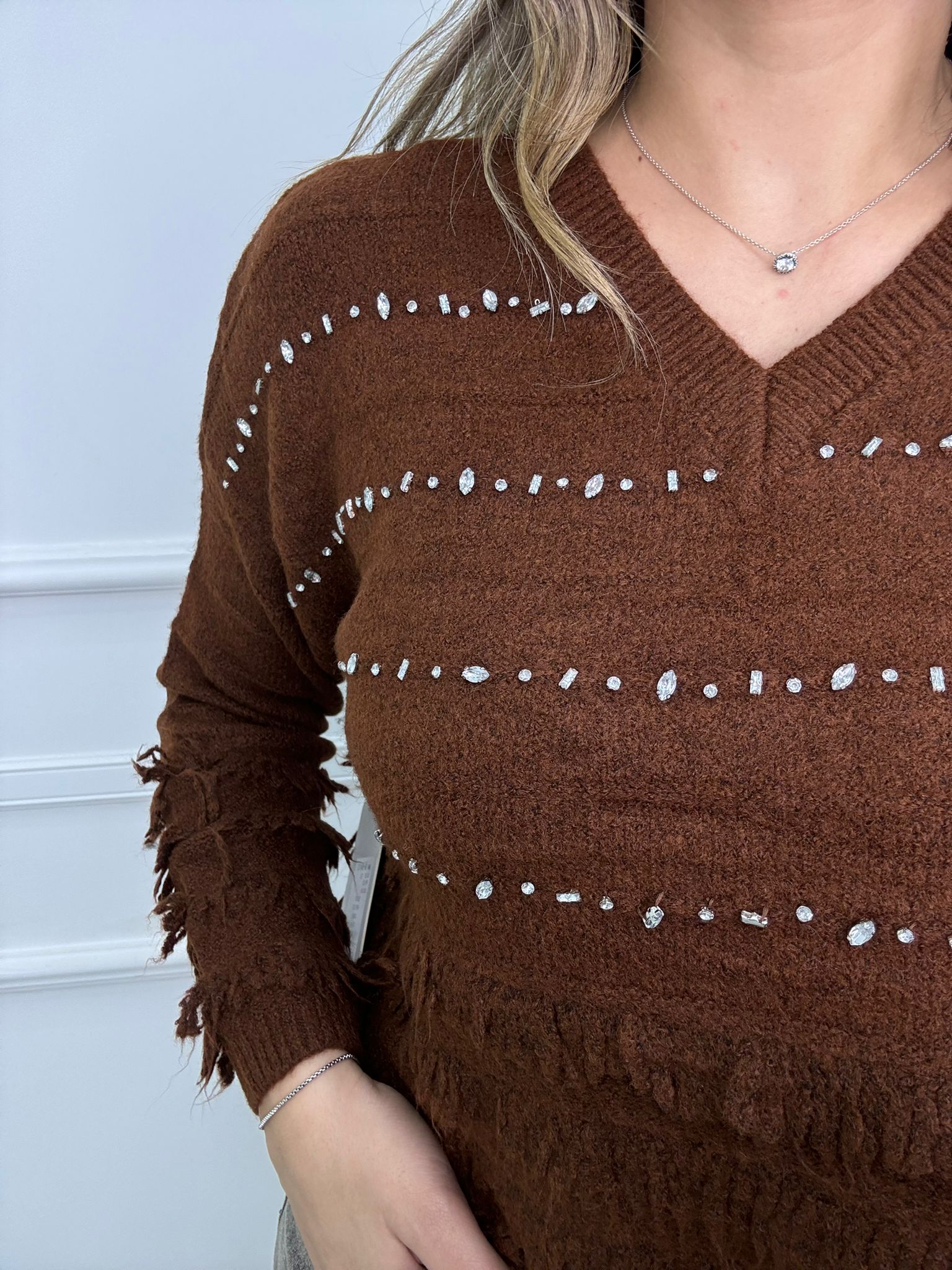 Maglione scollo a V con frange e swarovski