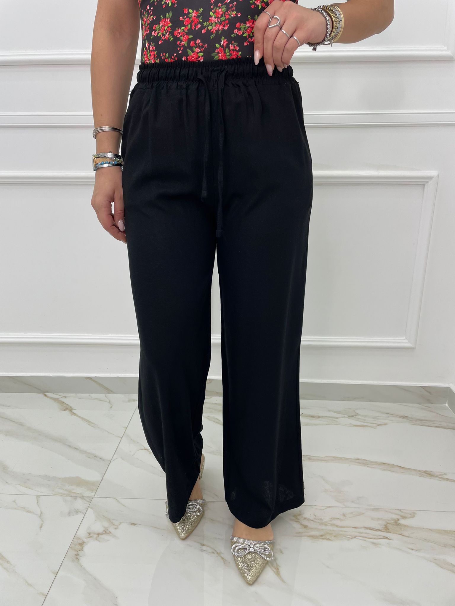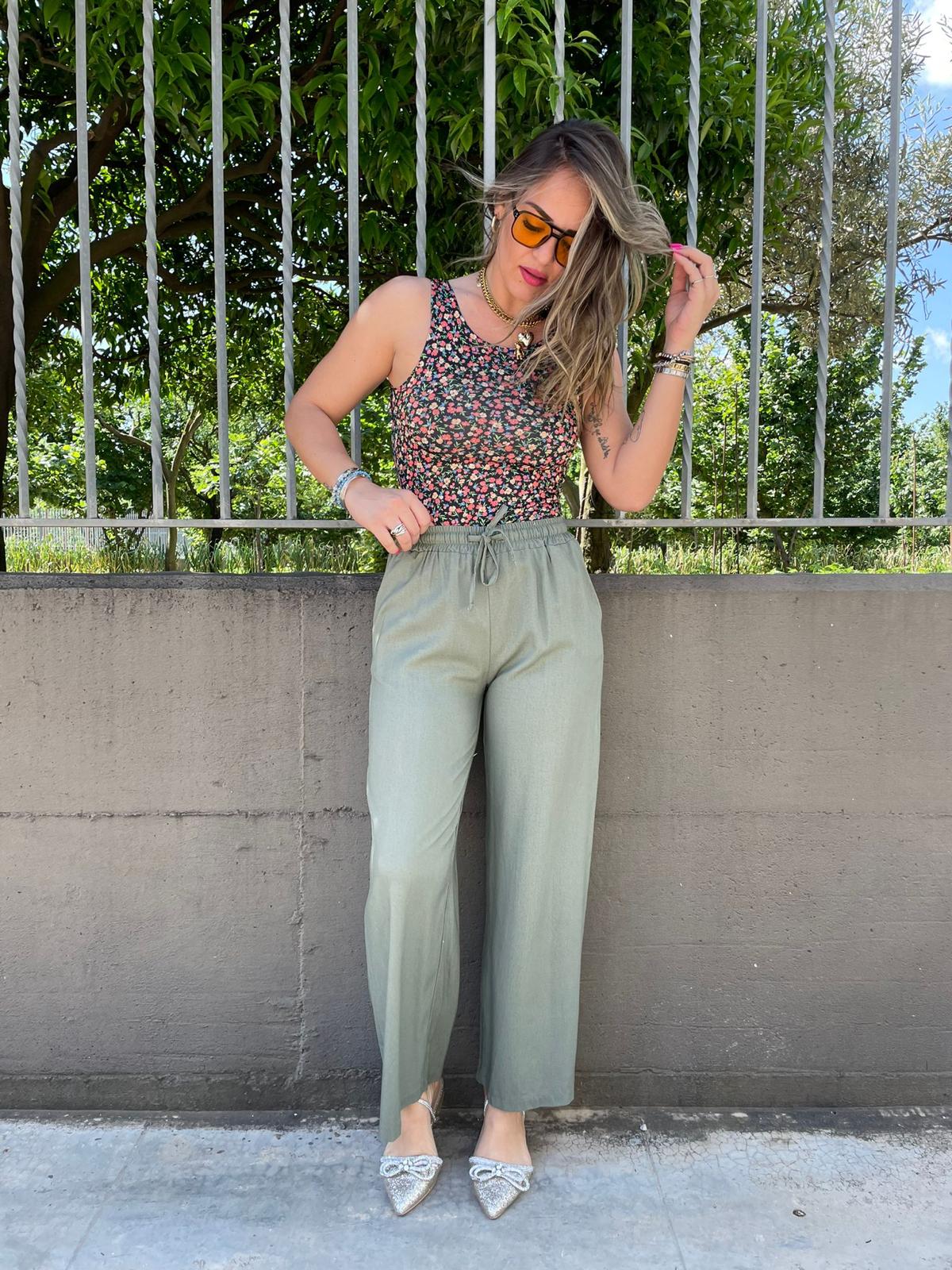 Pantalone palazzo in lino con elastico in vita