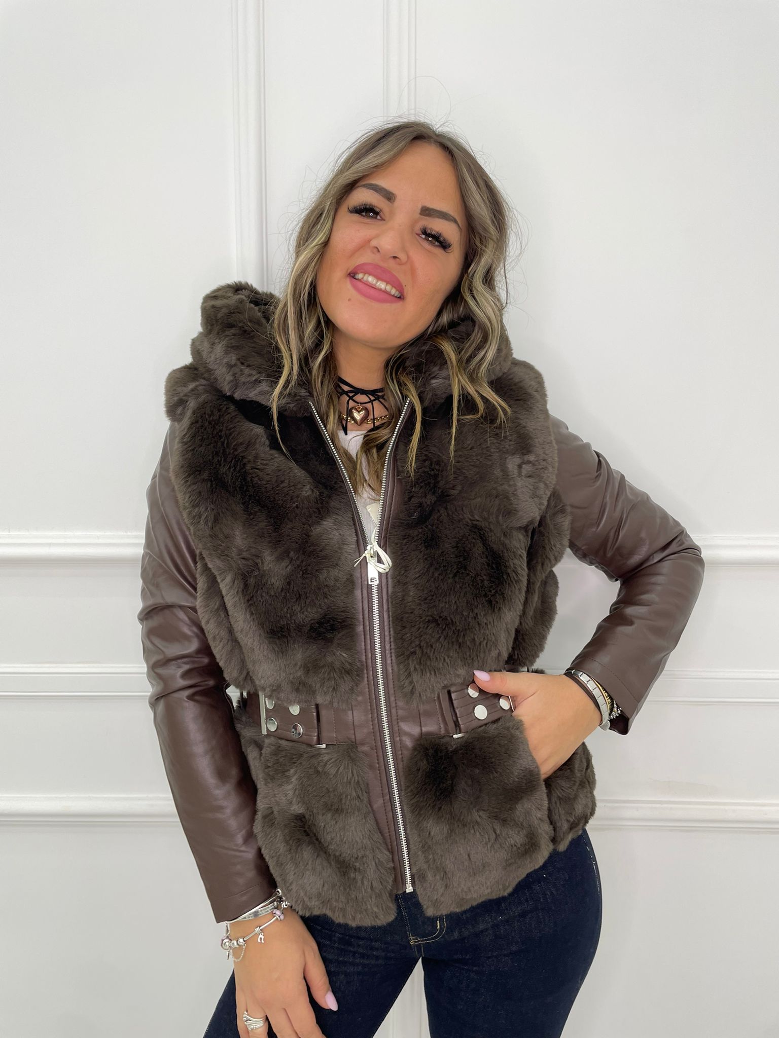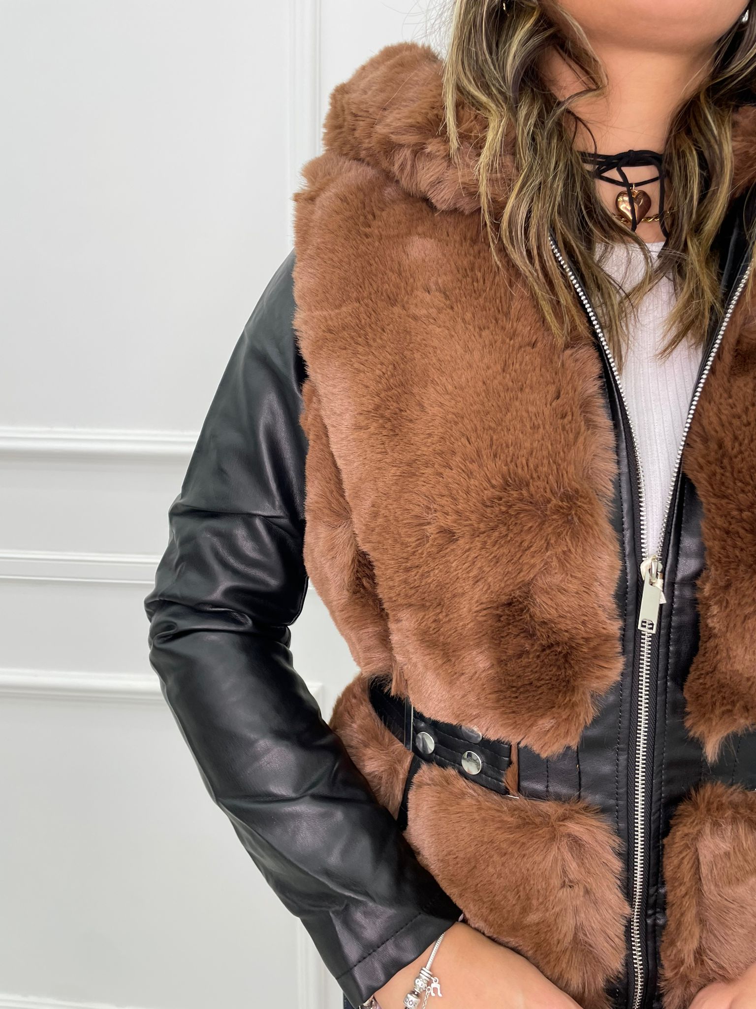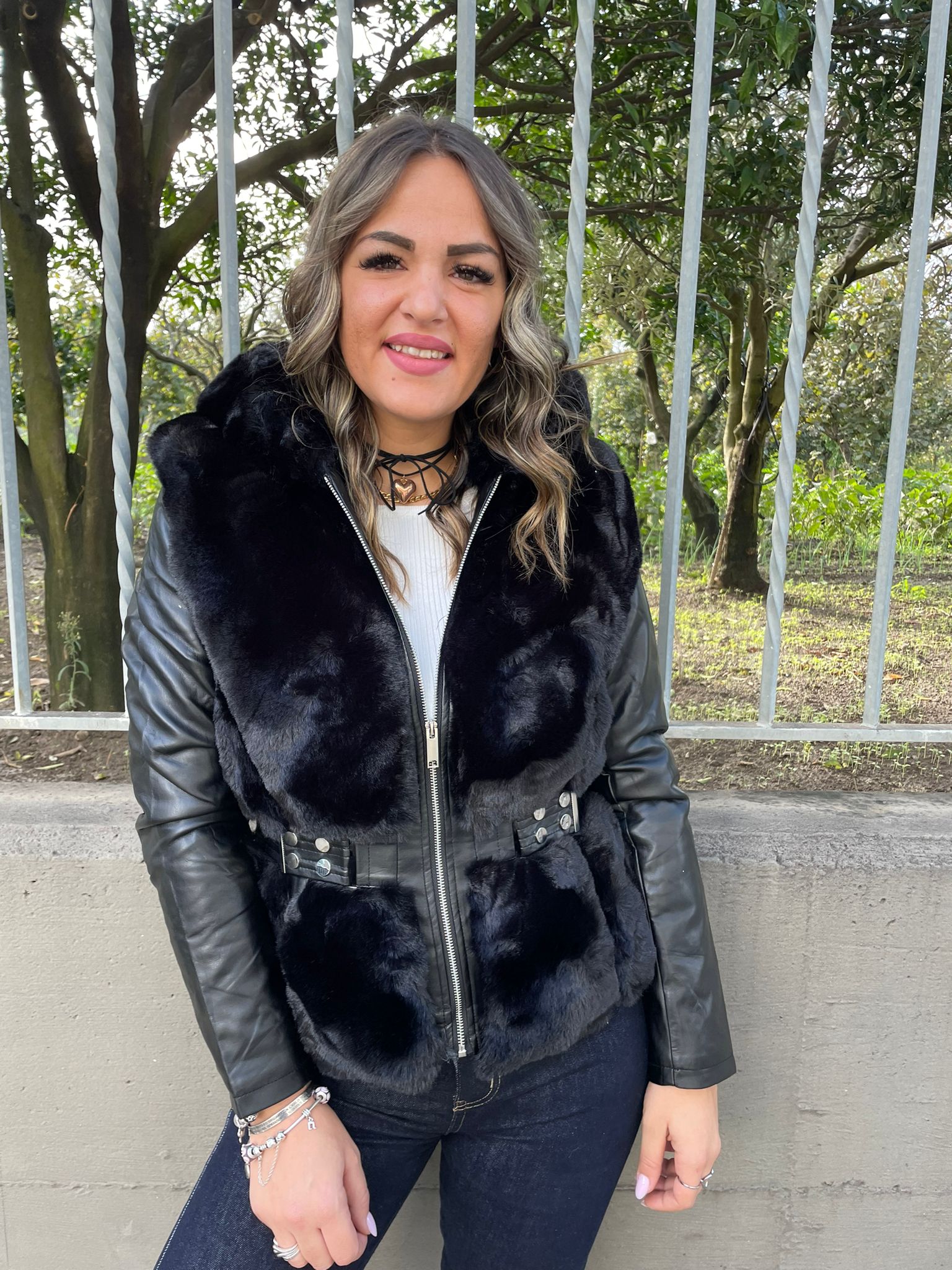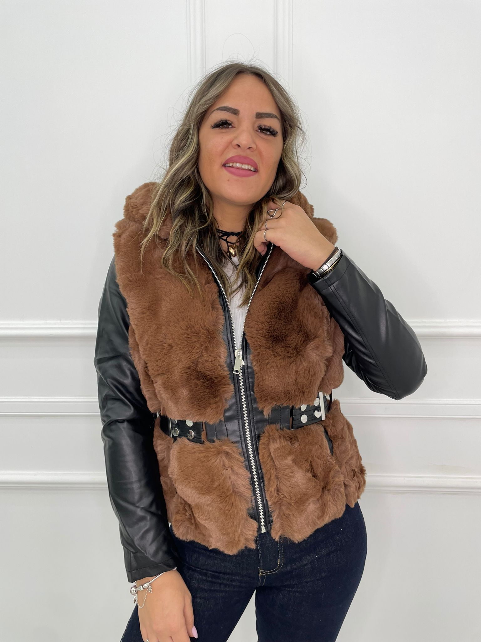 Pelliccia eco con maniche eco pelle e fibbie laterali