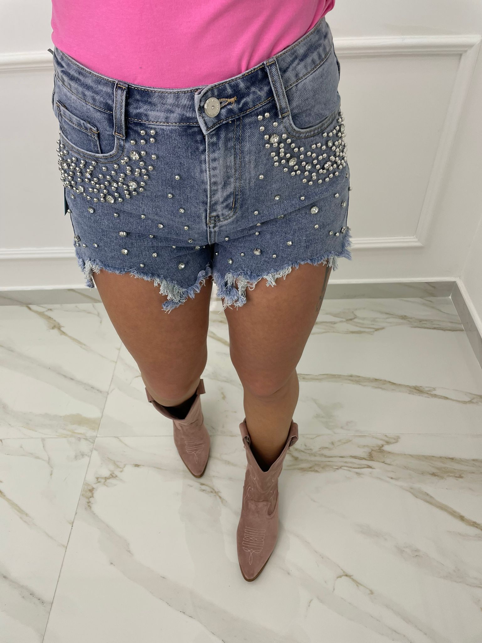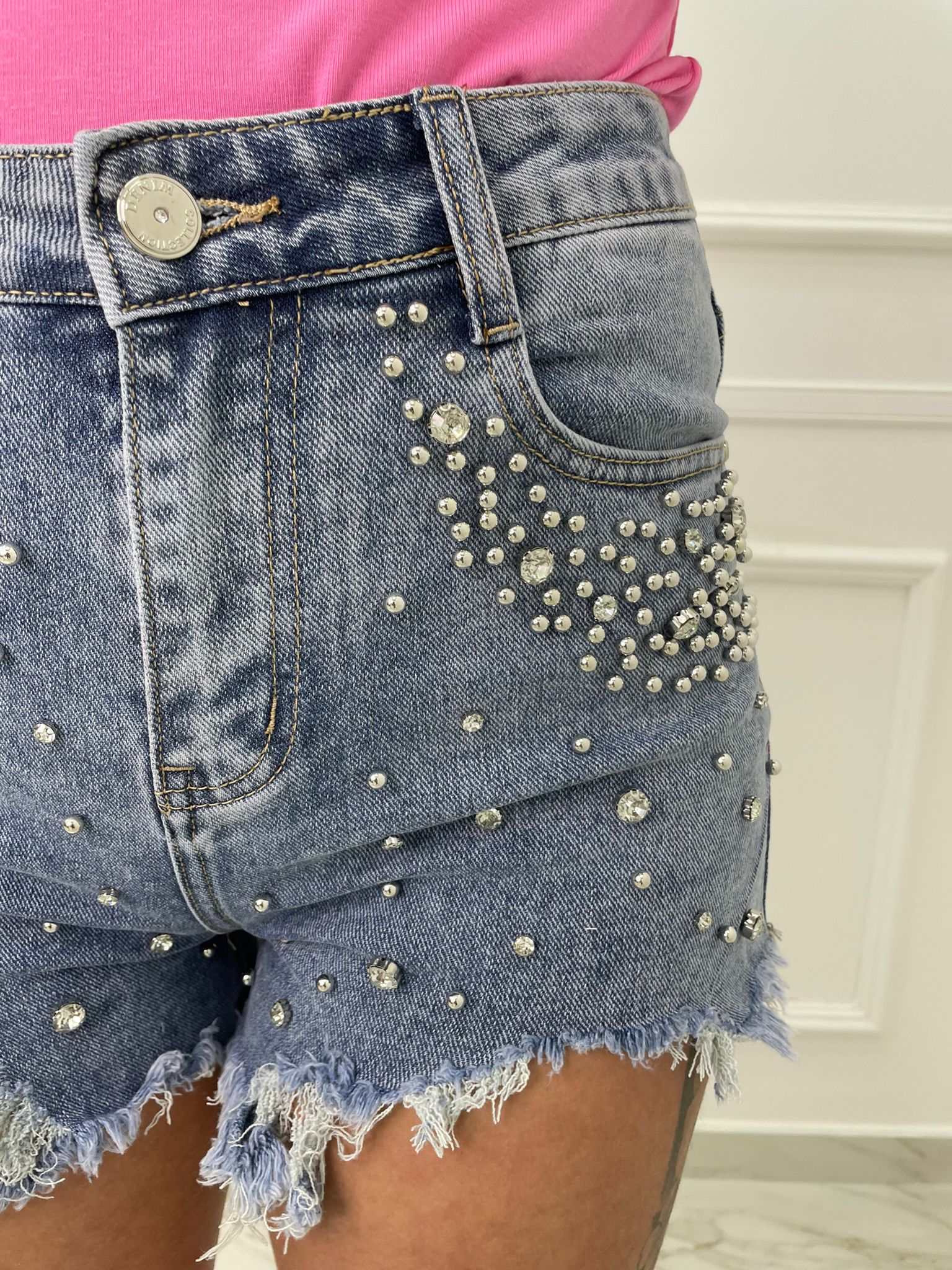 Shorts di jeans con borchie e swarovski