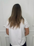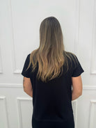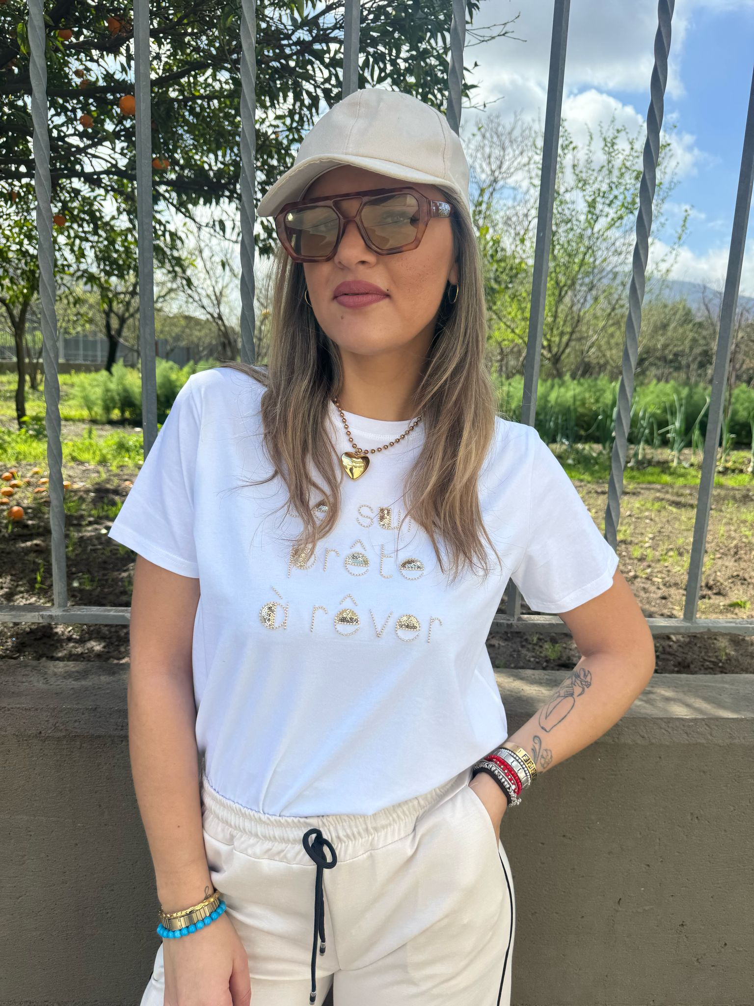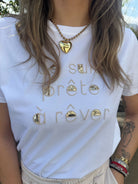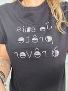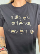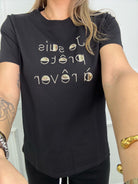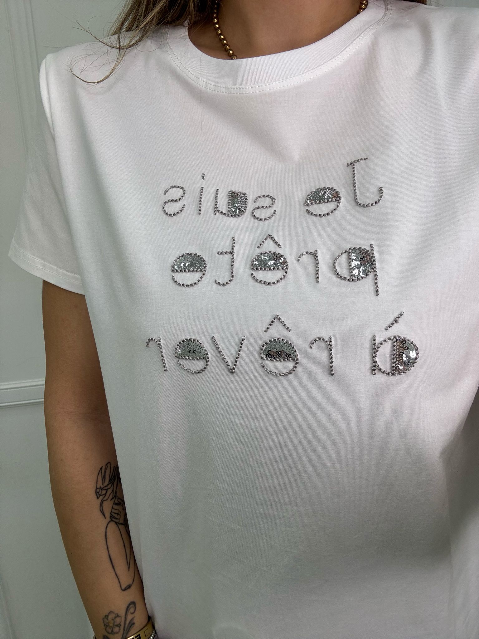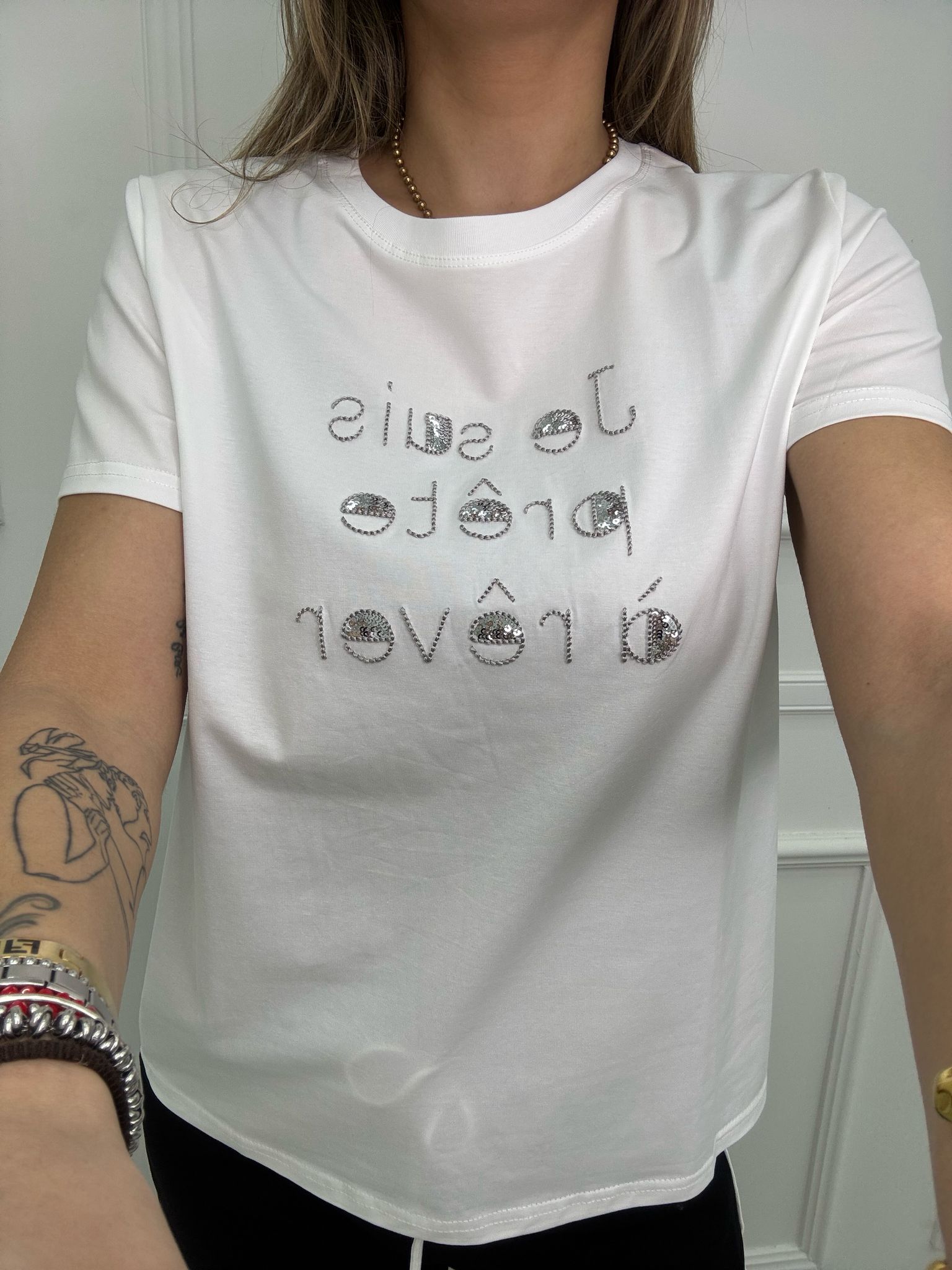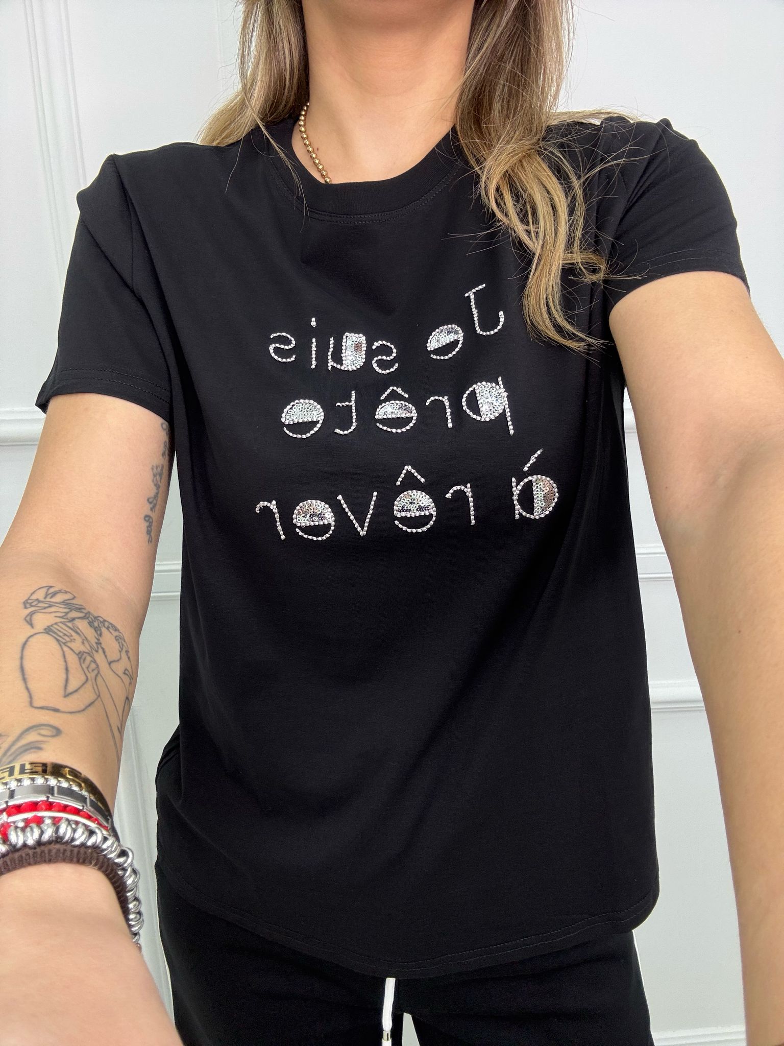 T-shirt con scritta avanti e paillettes