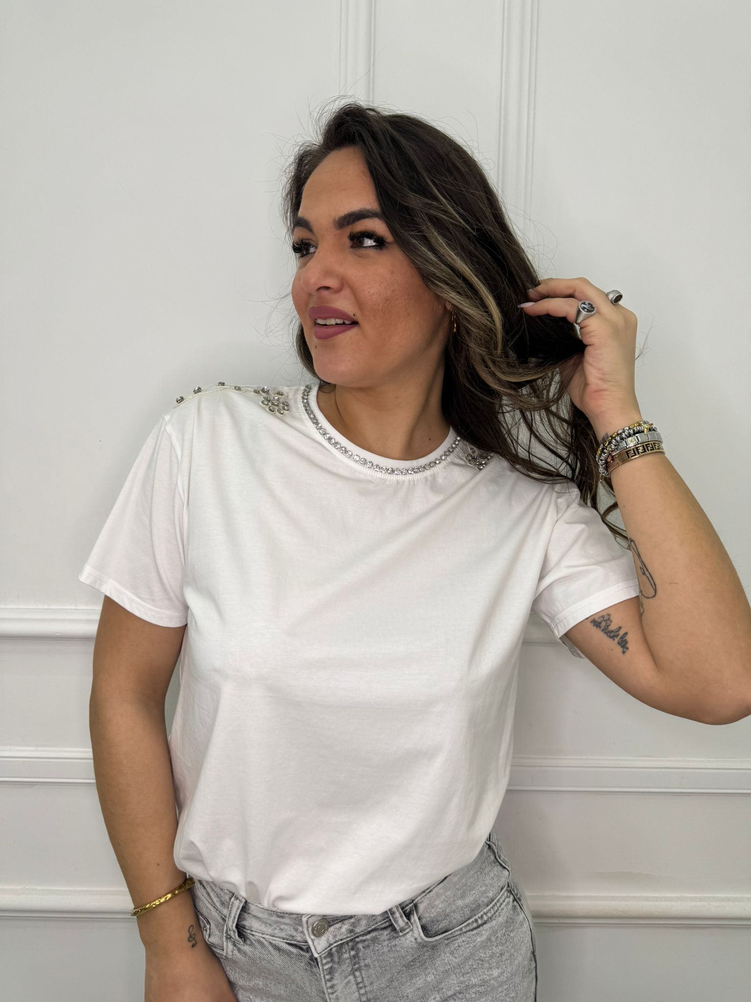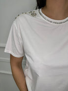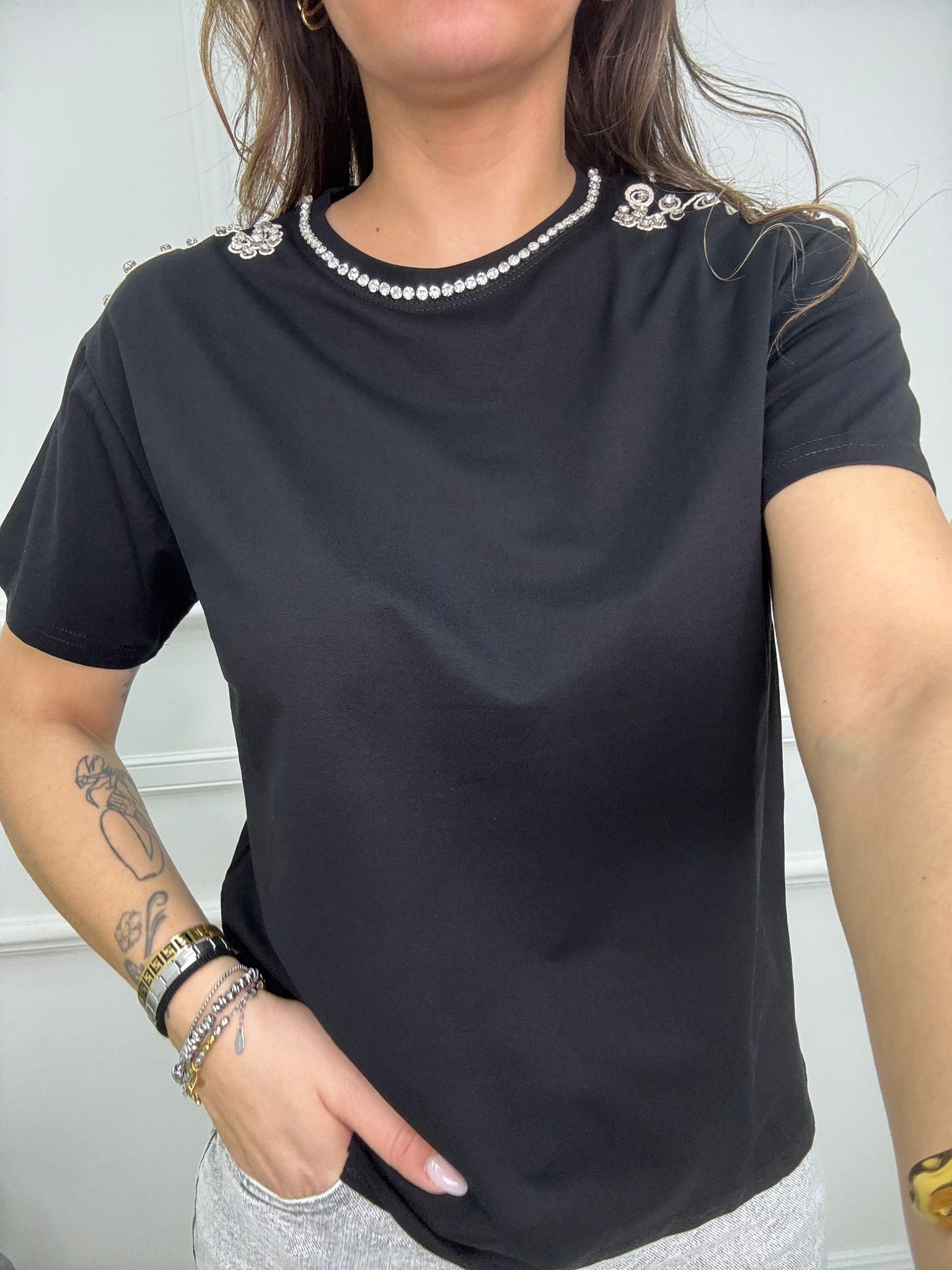 T-shirt tinta unita con giro collo swarovski