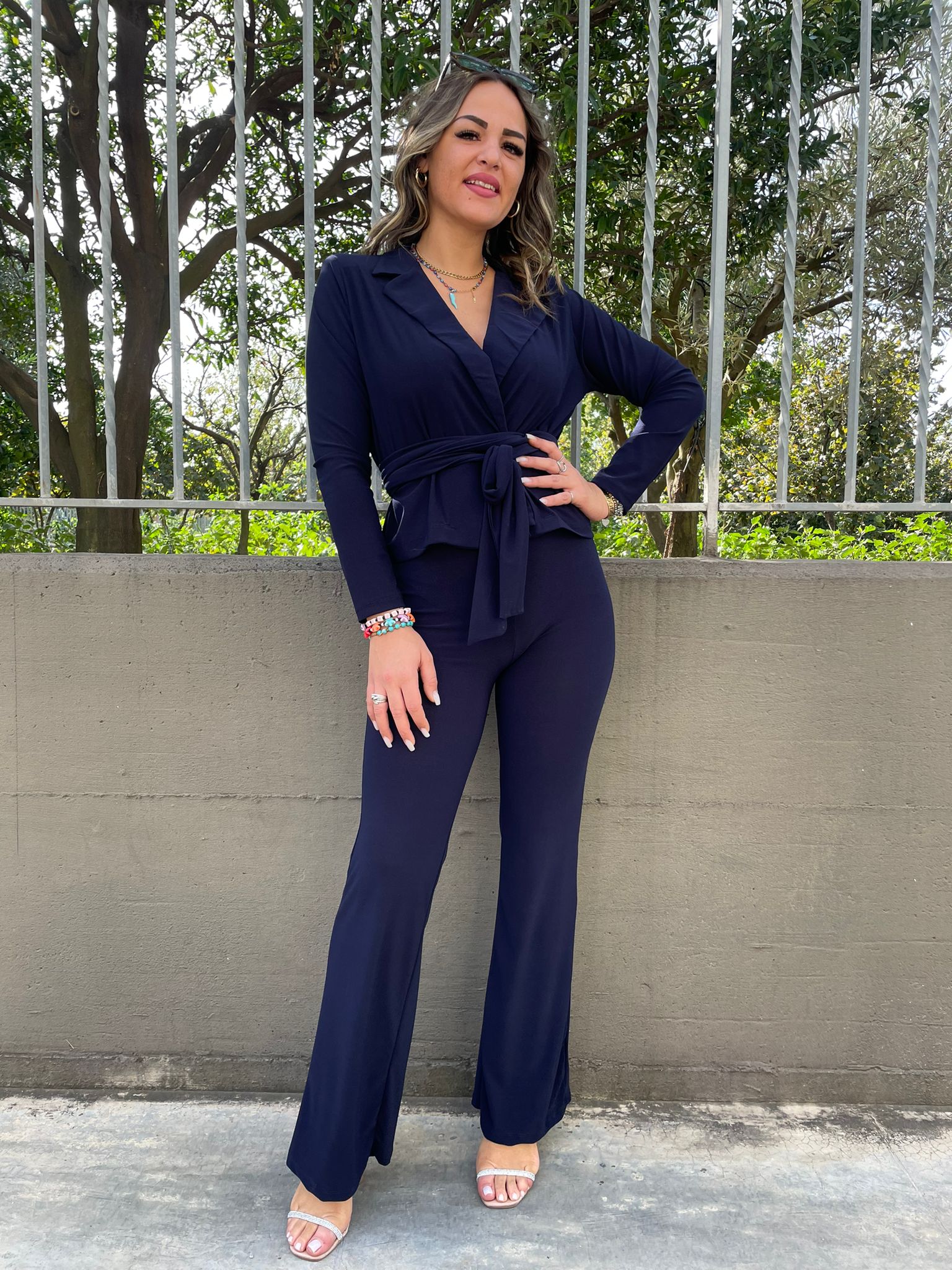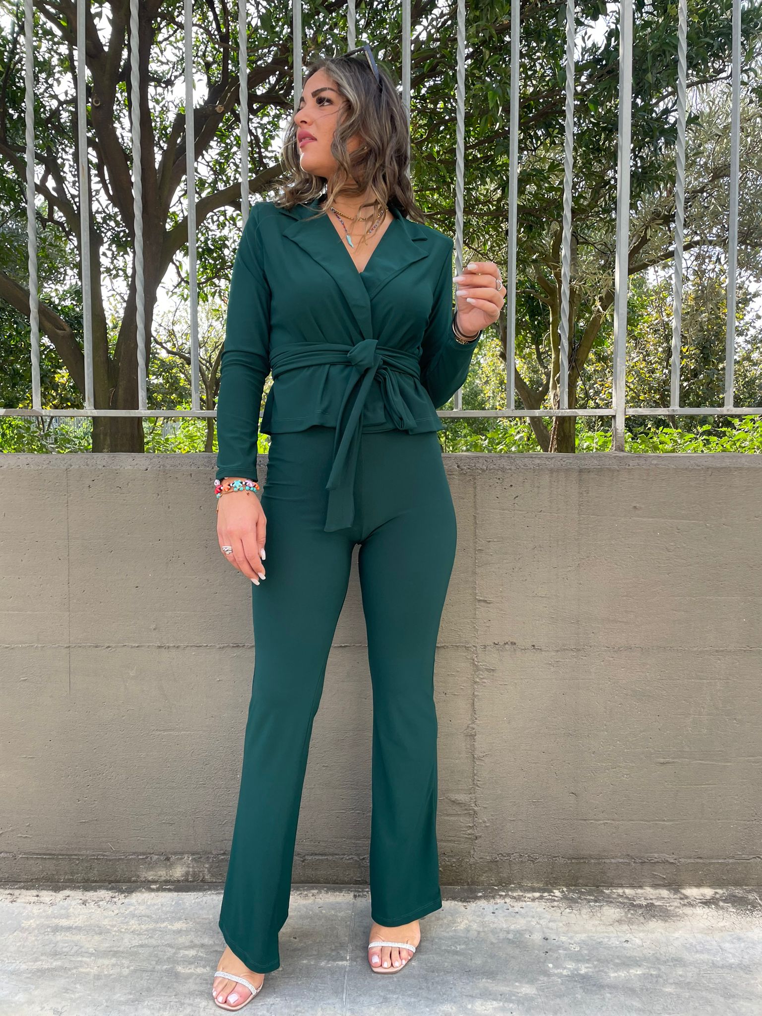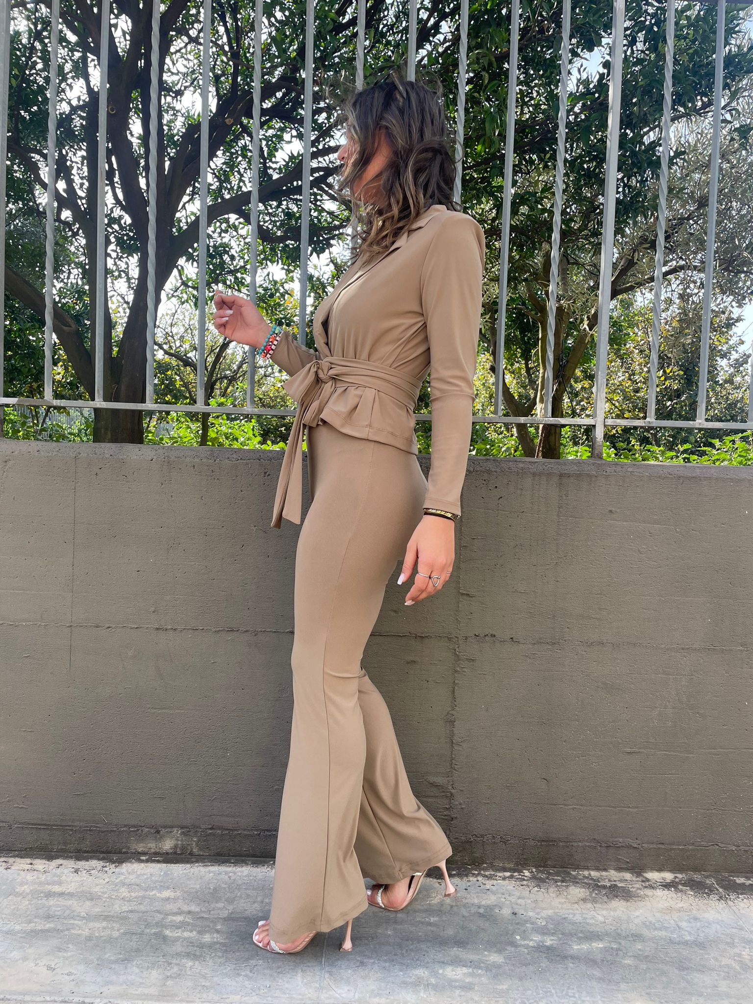 Tailleur con pantalone a zampa e giacca corta con cintura