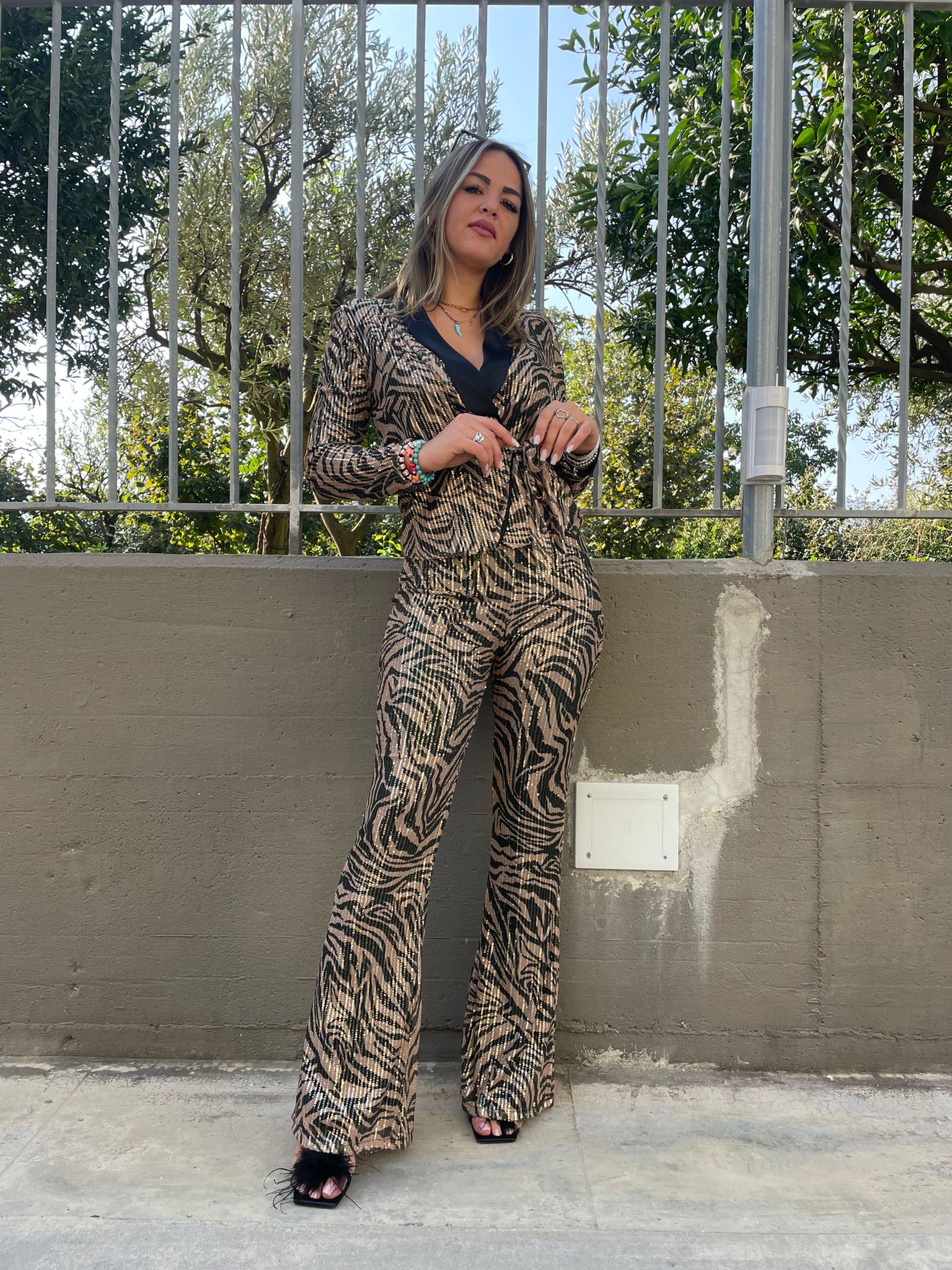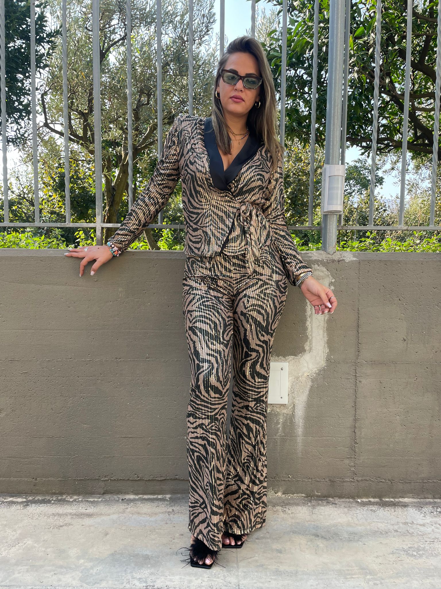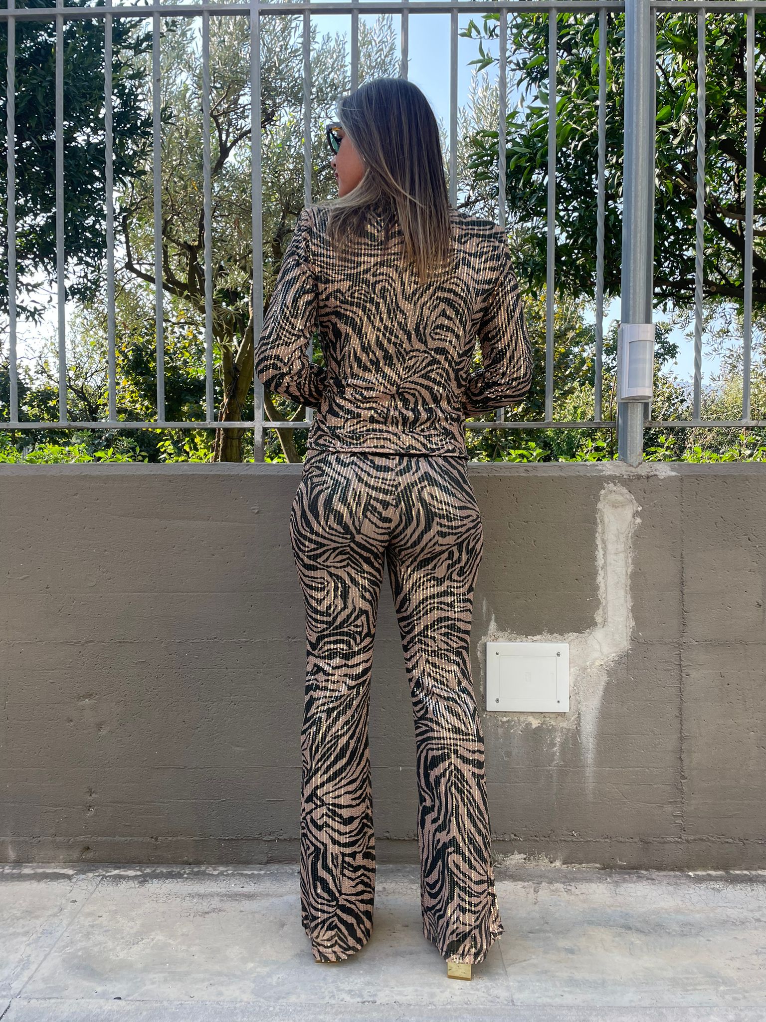 Tailleur in paillettes con pantalone a zampa