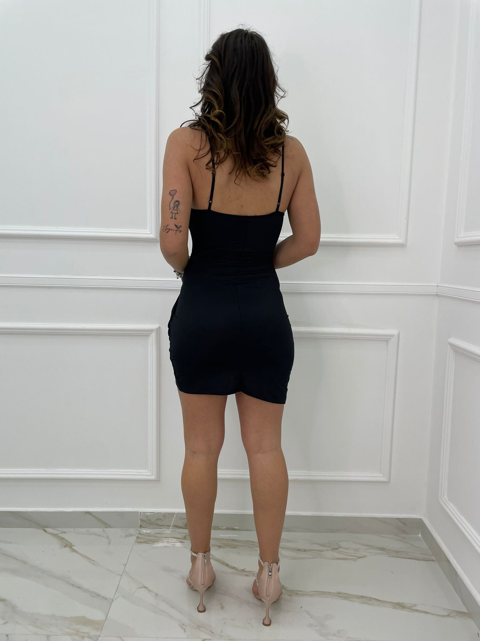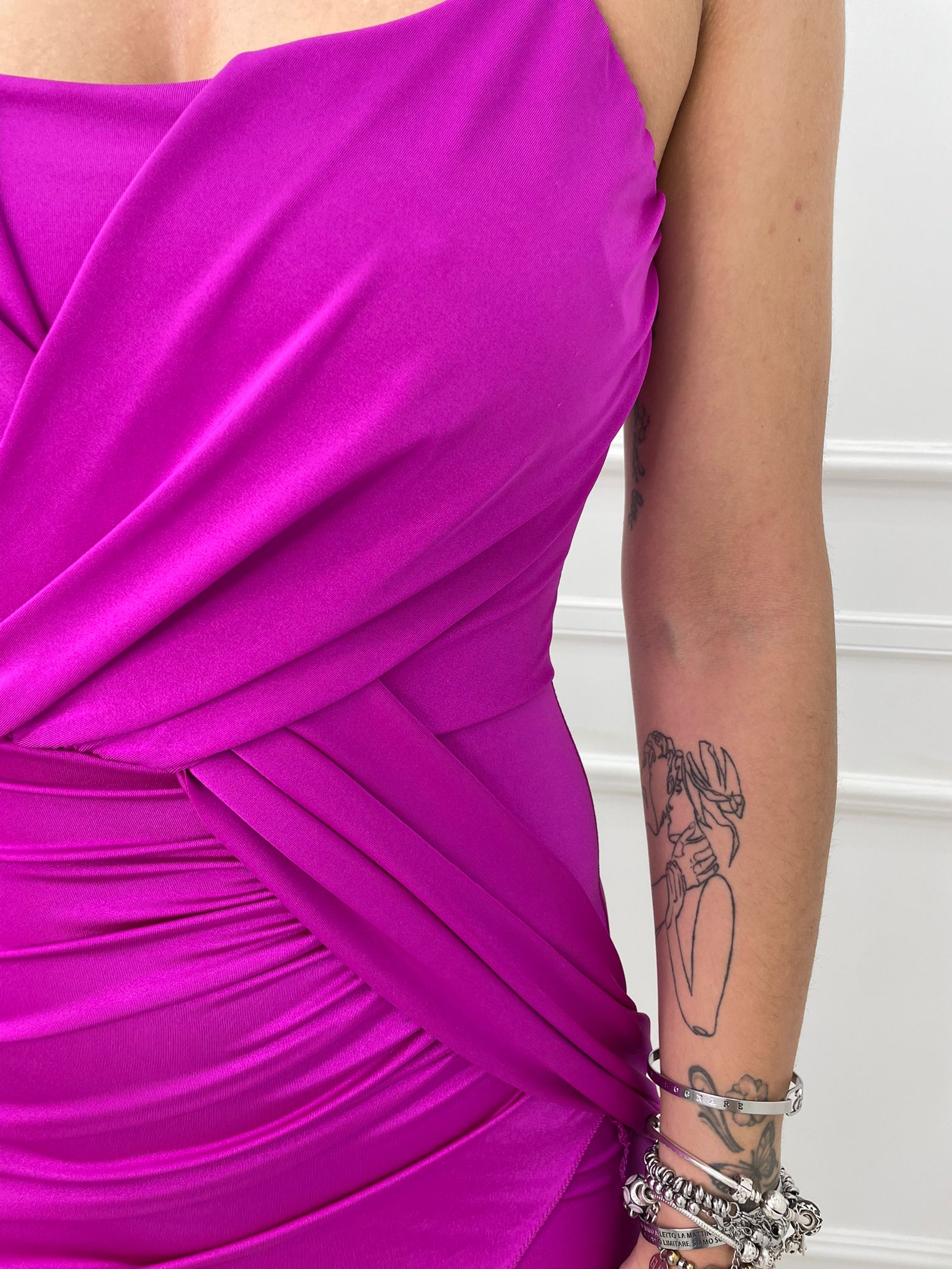 Vestitino tinta unita in simil raso con drappeggio avanti