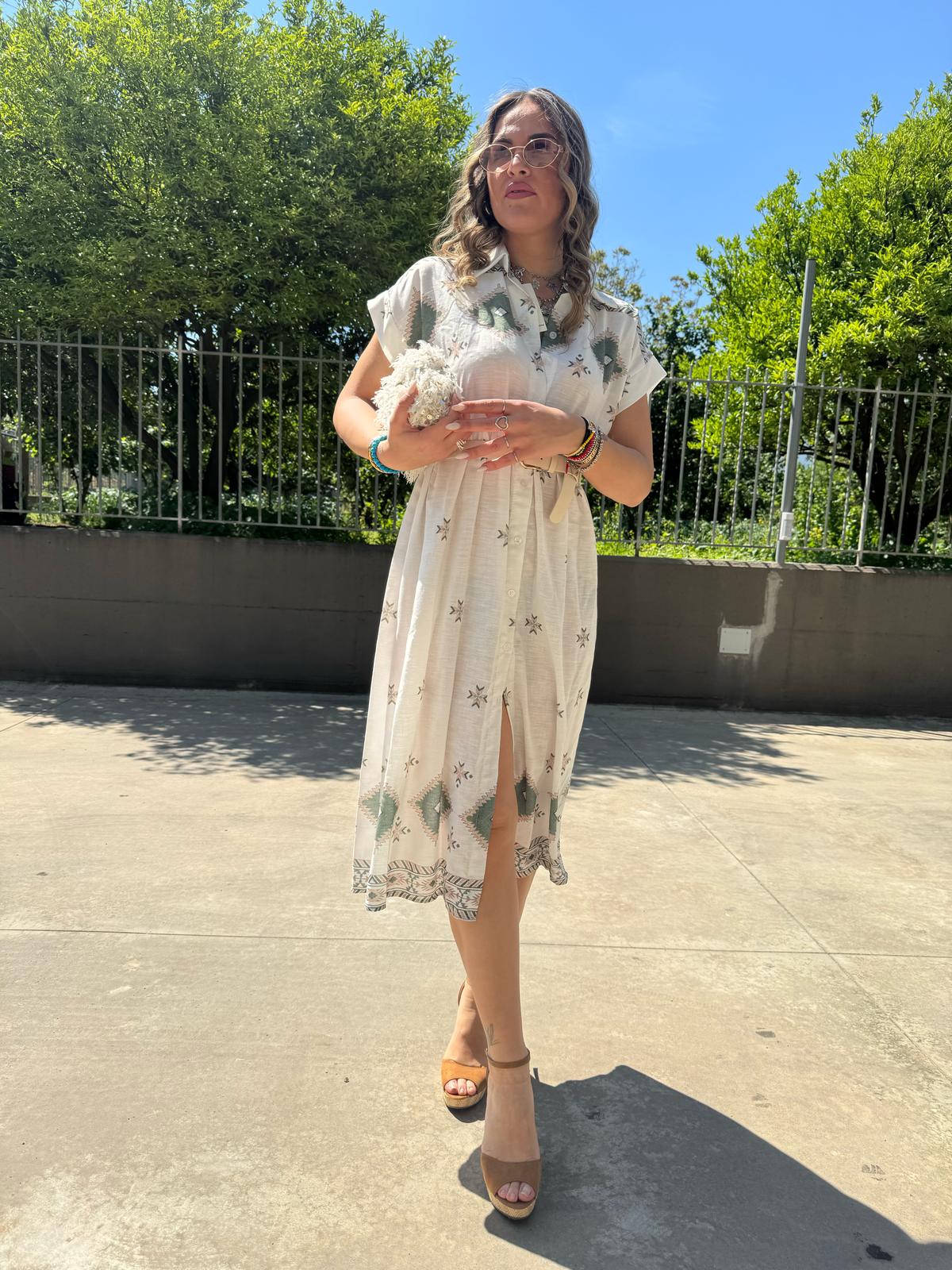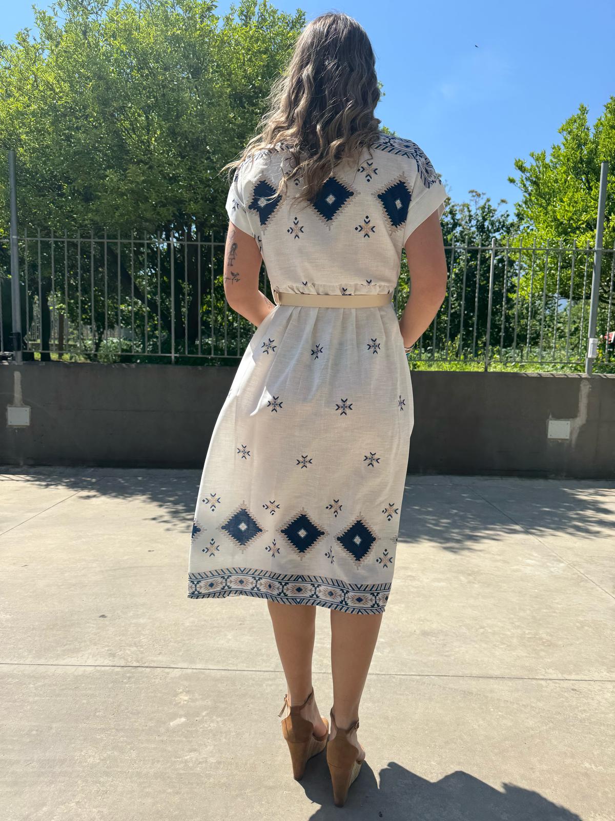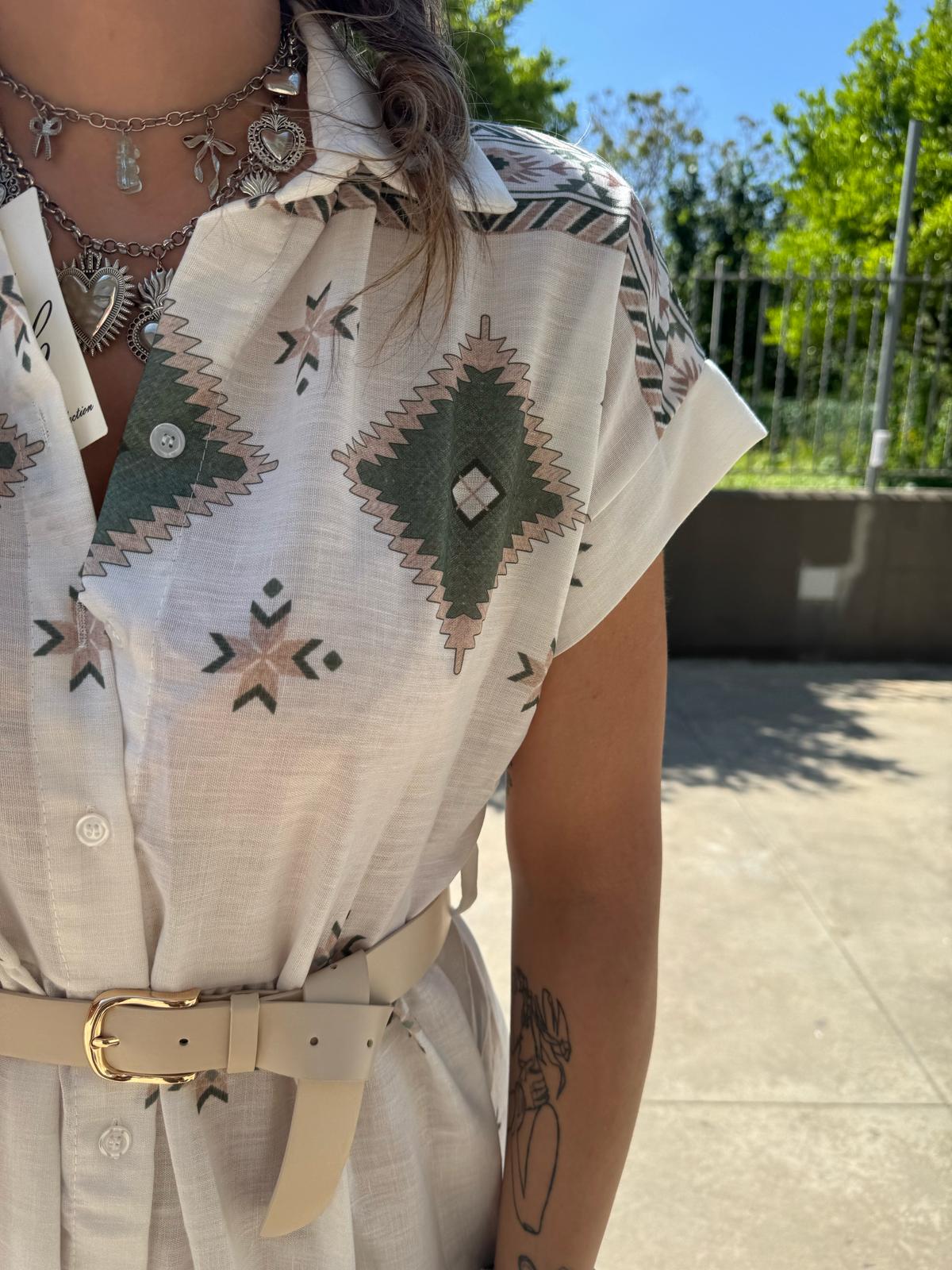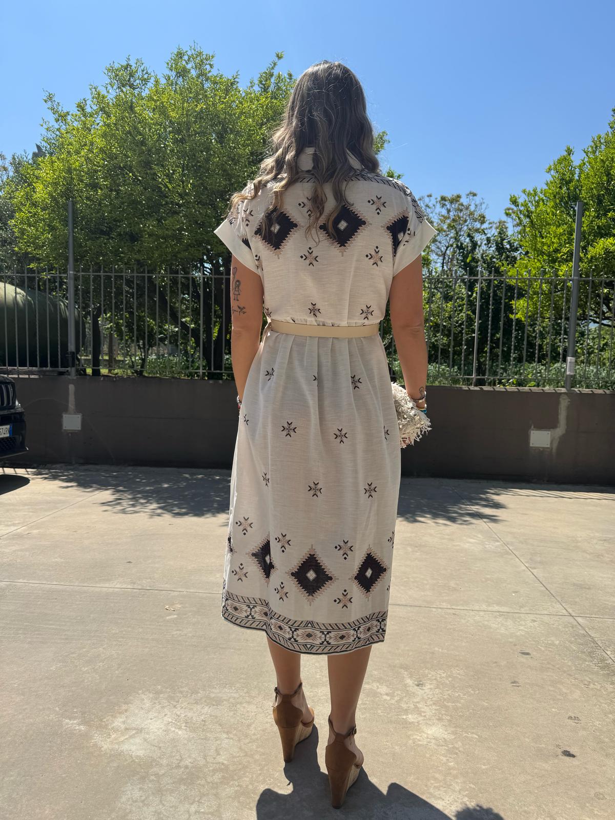 Vestito a camicia in simil lino fantasia geometrica