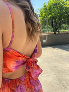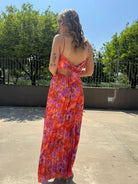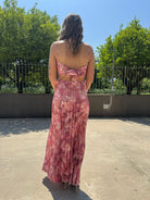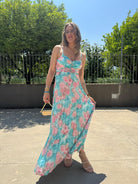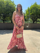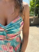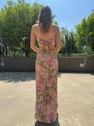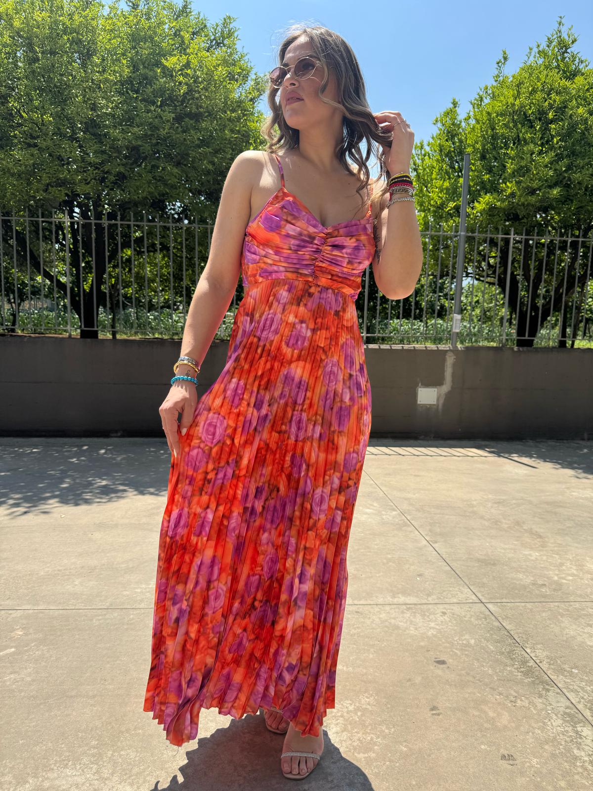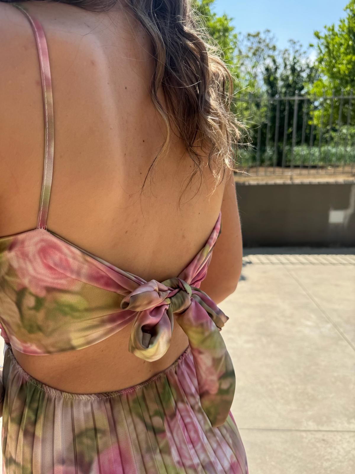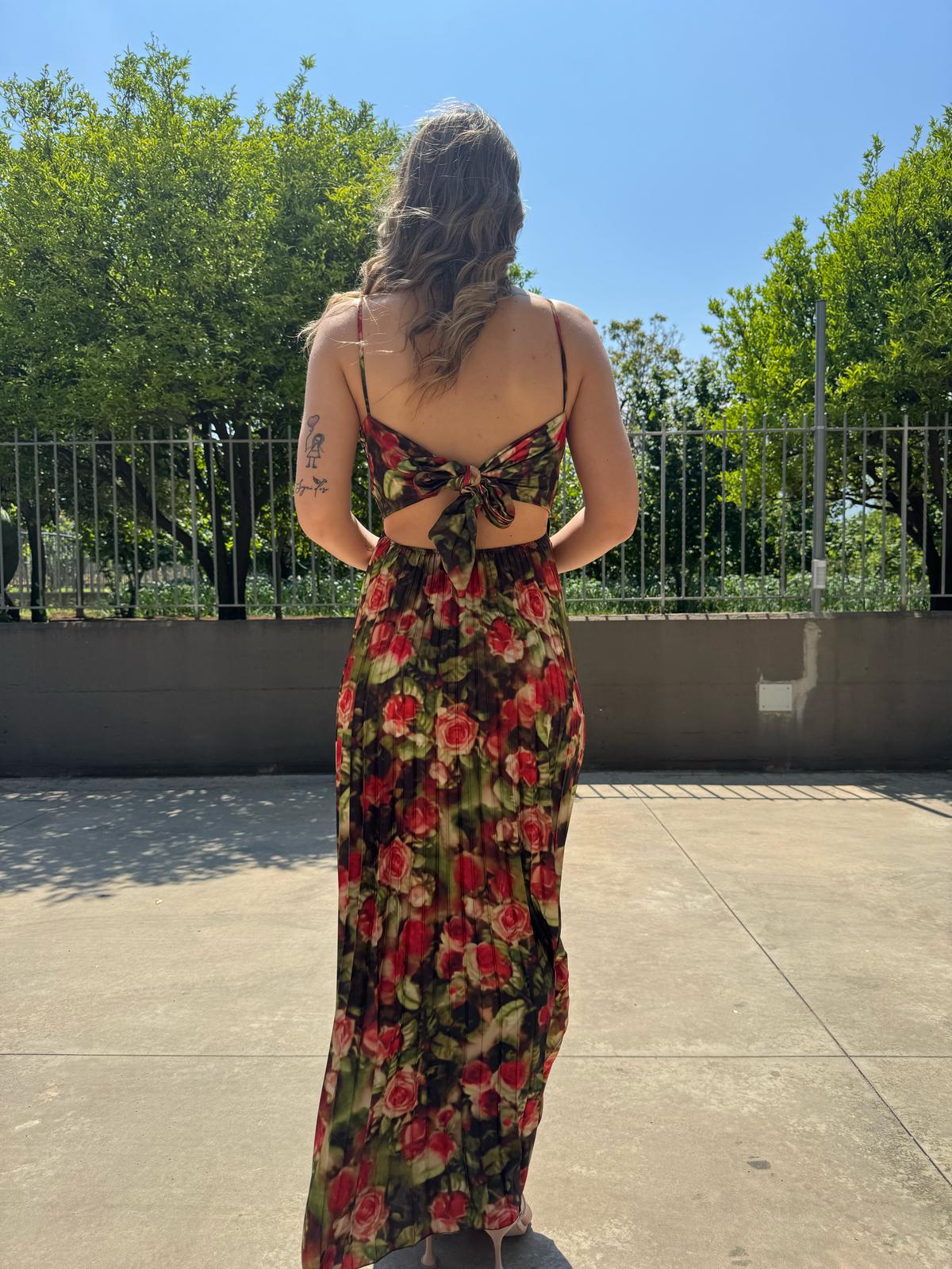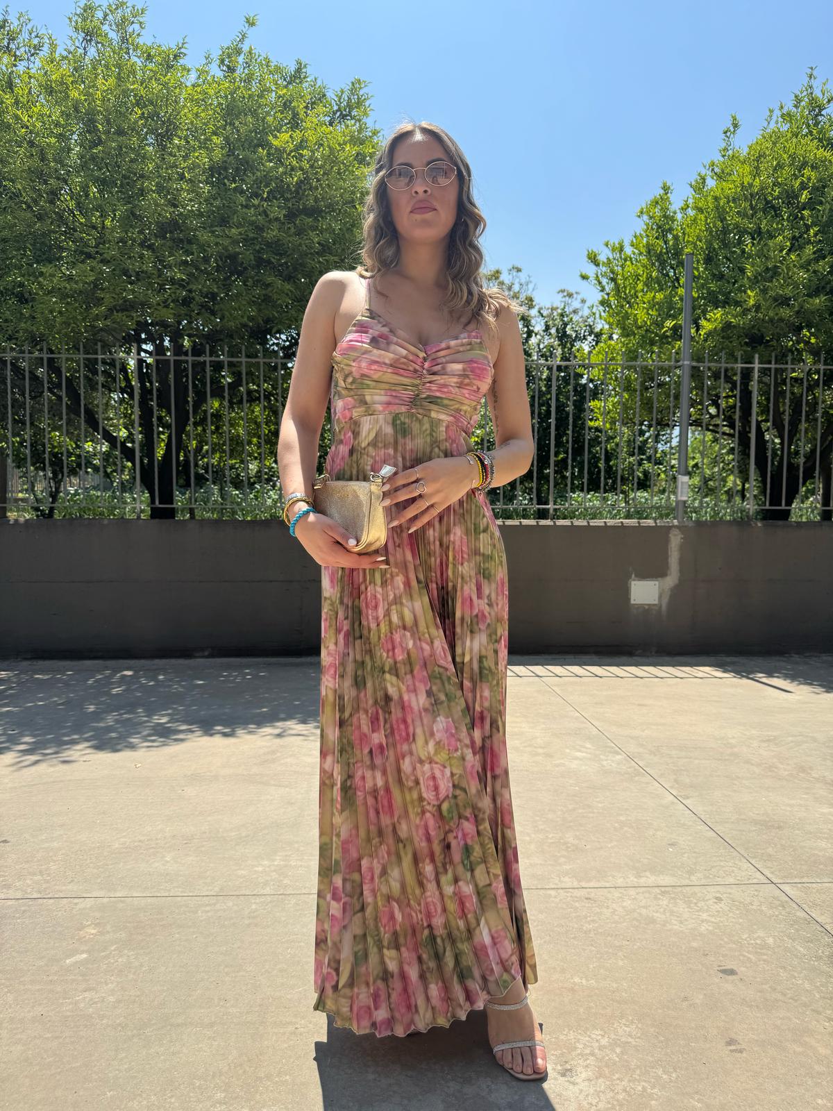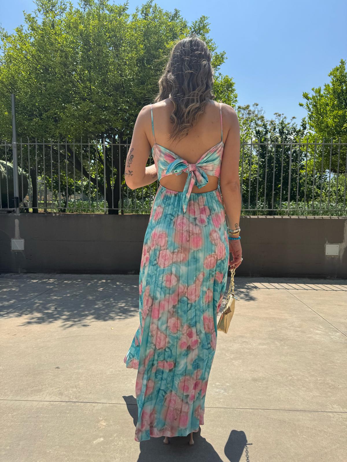 Vestito lungo plissettato a fantasia con fiocco dietro