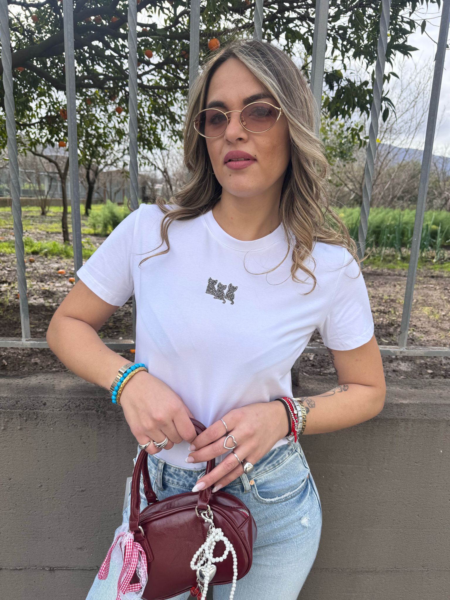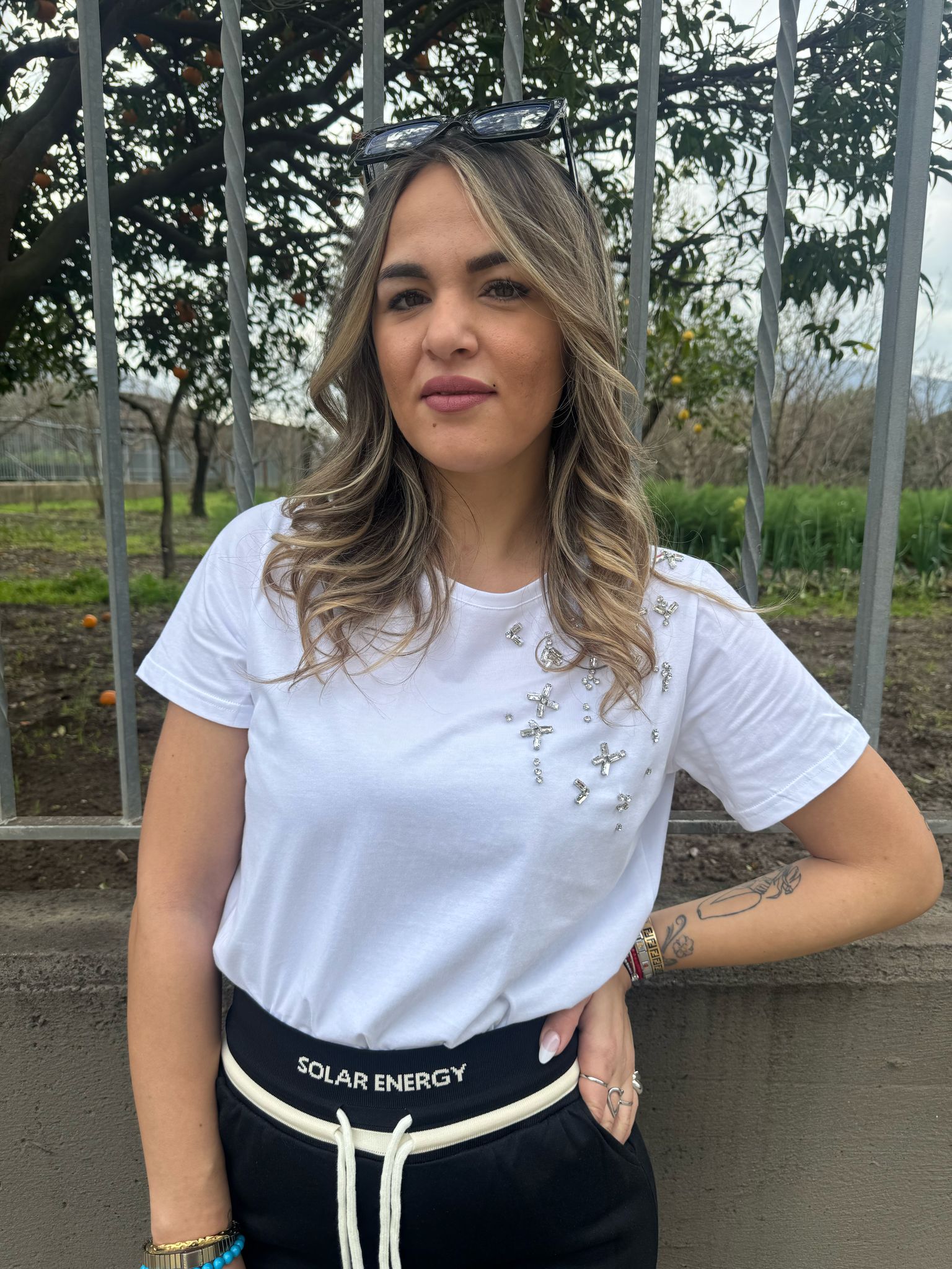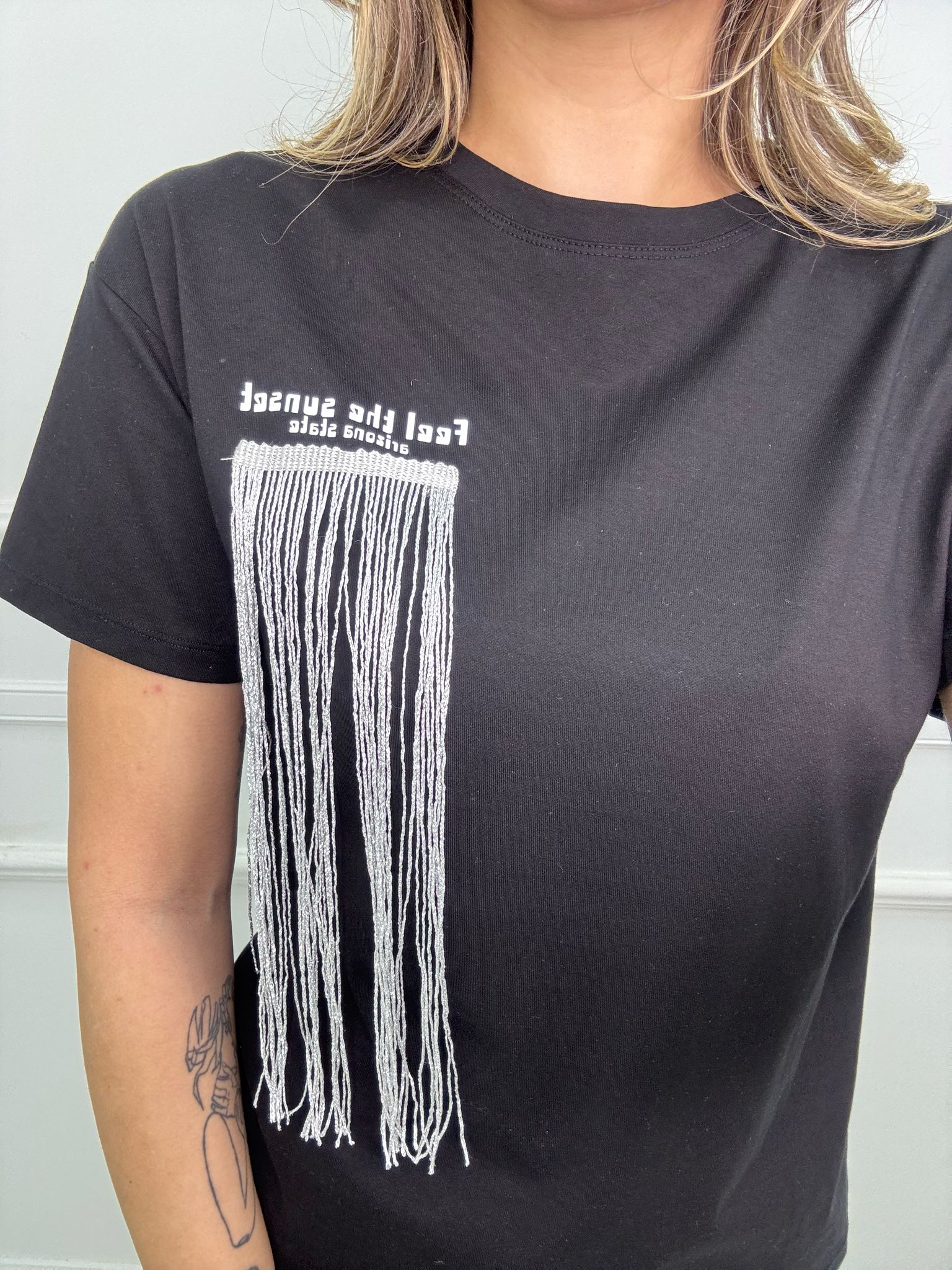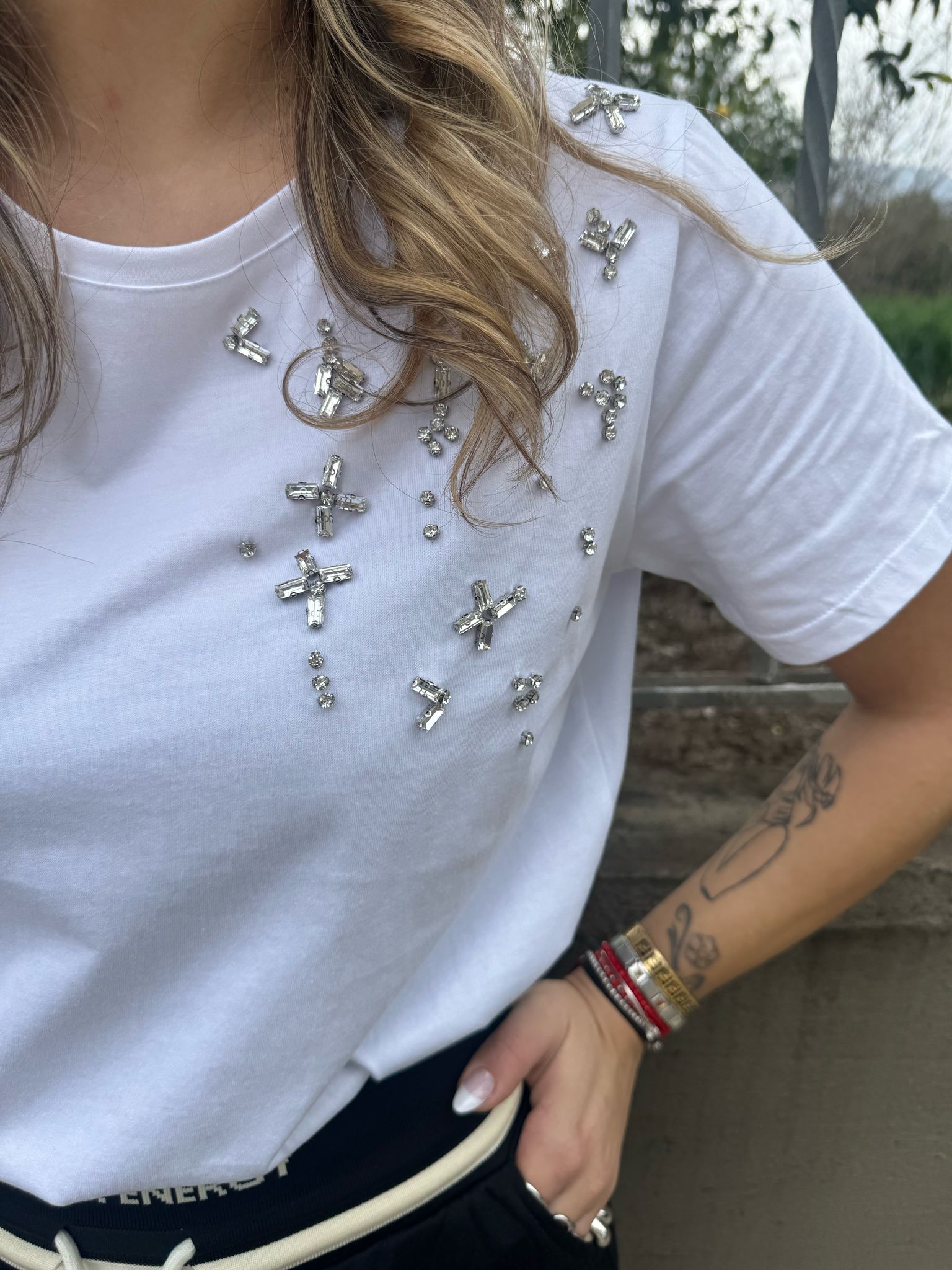 T-shirt tinta unita con swarovski laterali