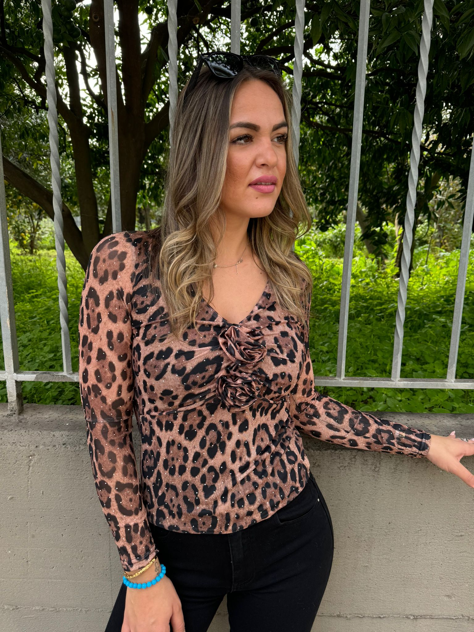 Maglia animalier con brillantini e fiori avanti
