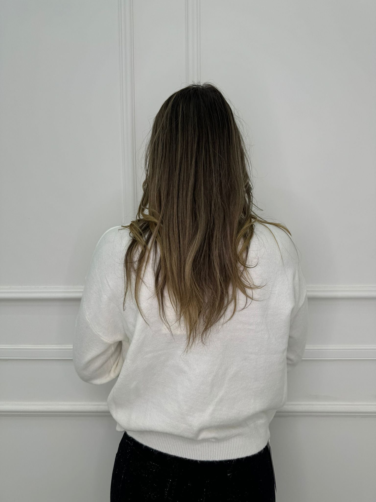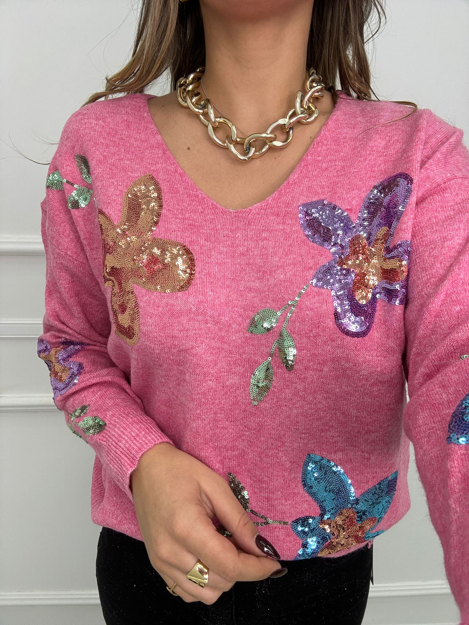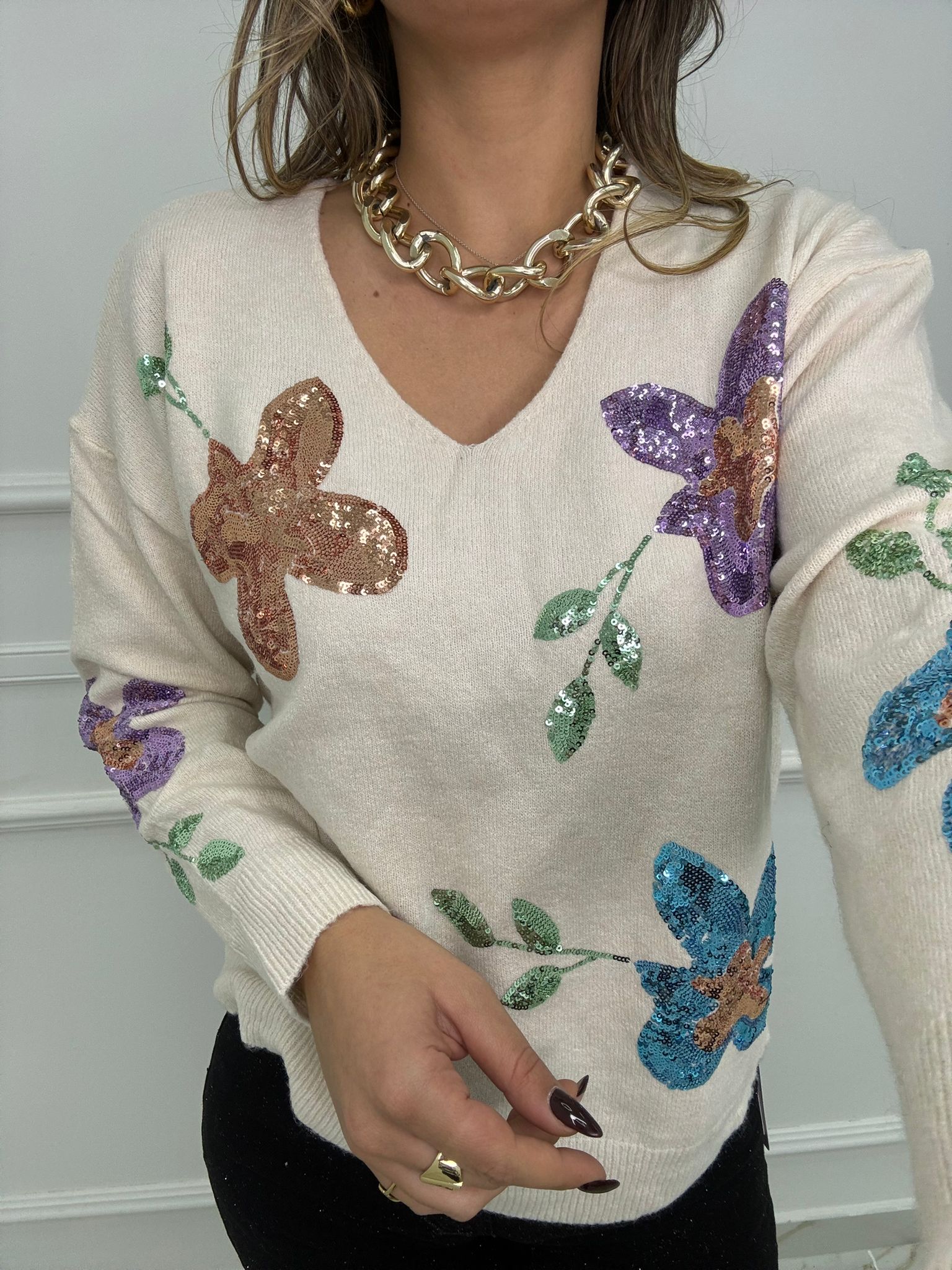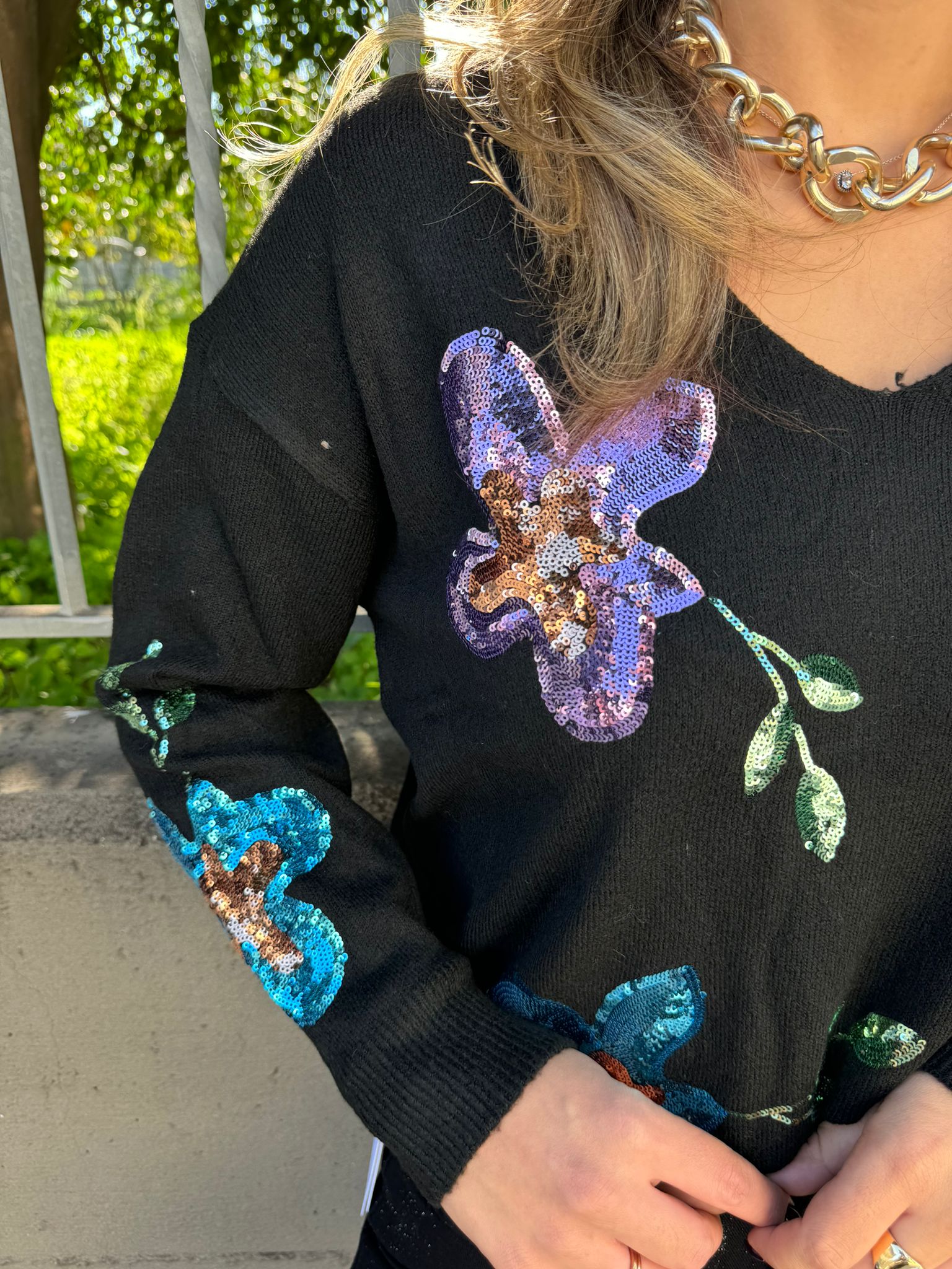 Maglione con scollo a V e fiori in paillettes