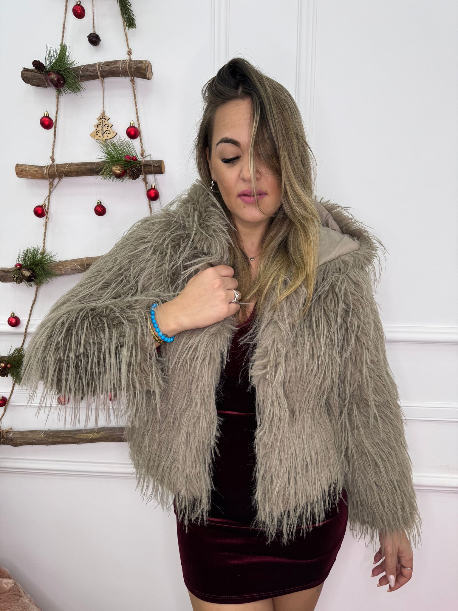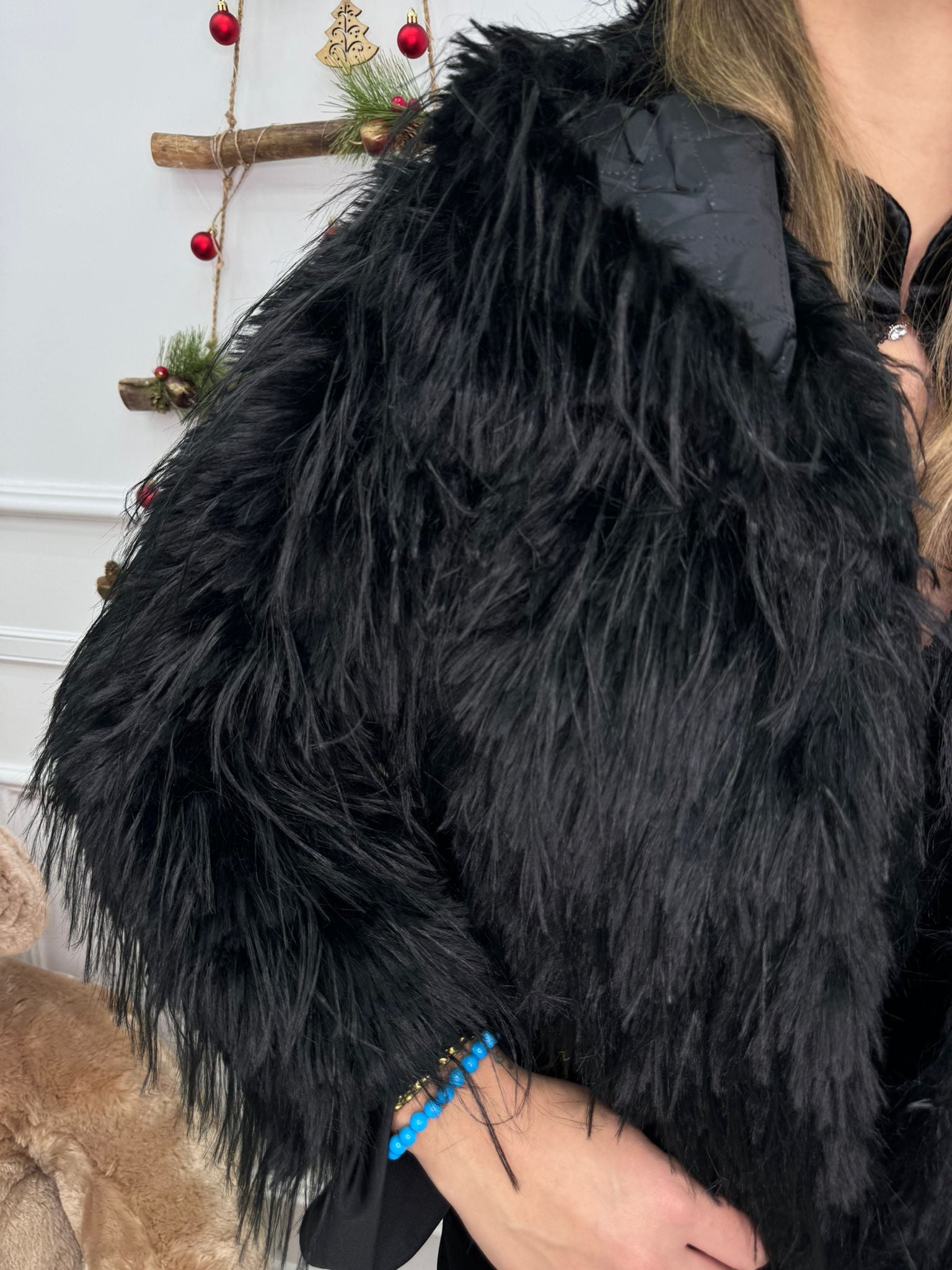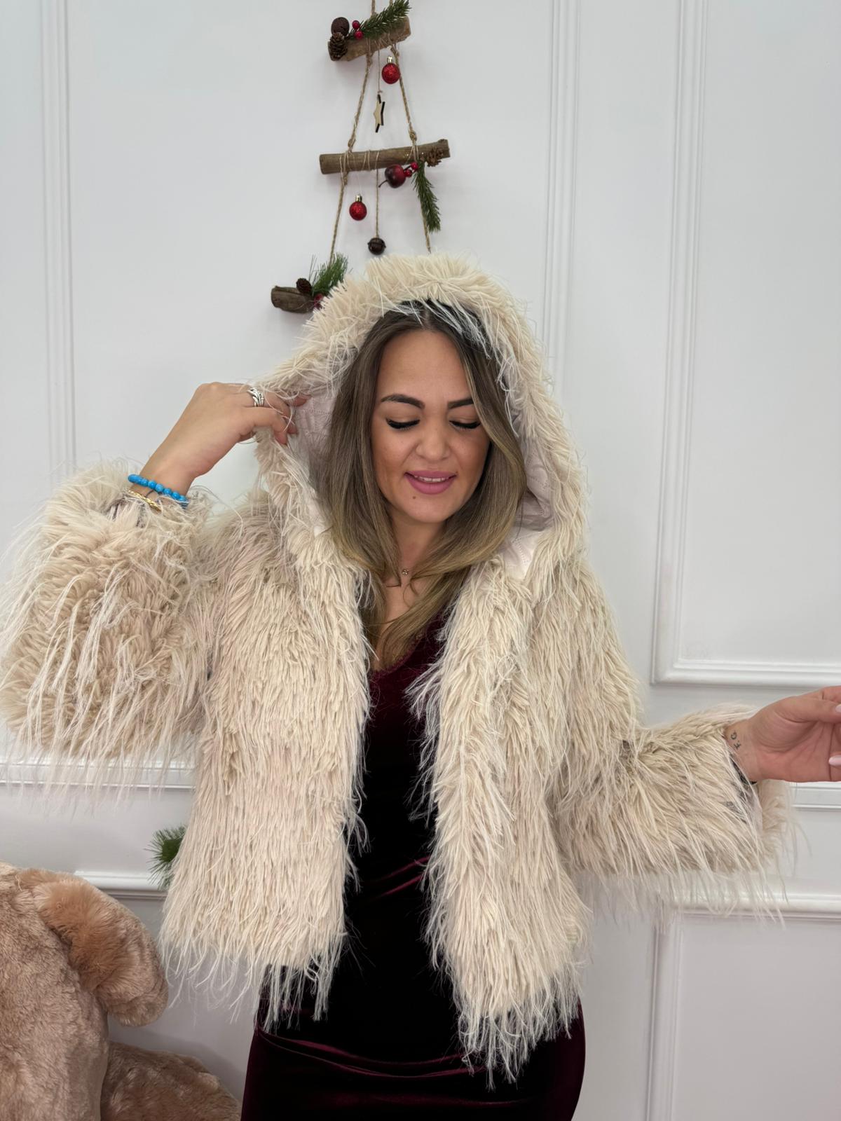 Pelliccia eco con piume e cappuccio
