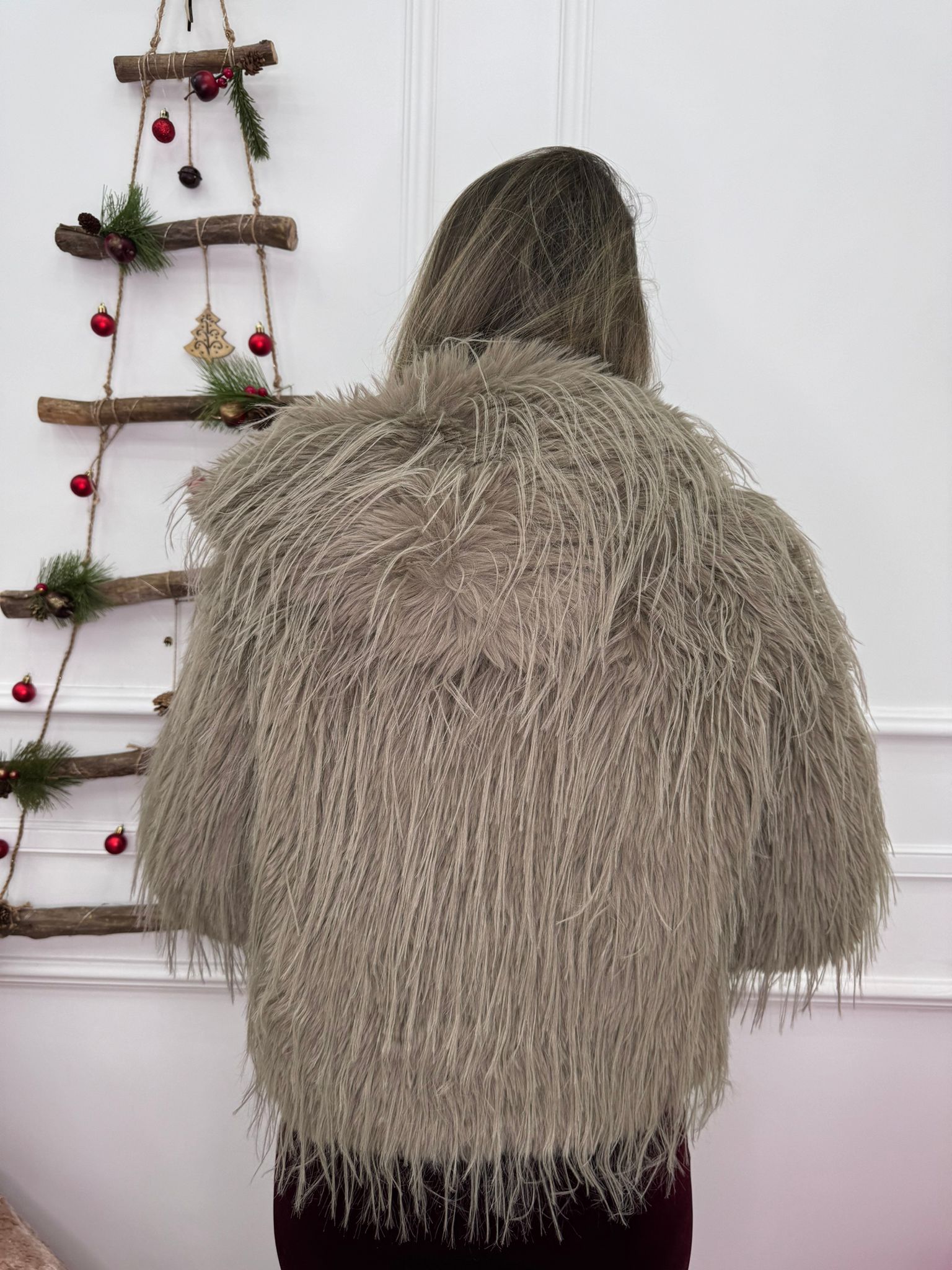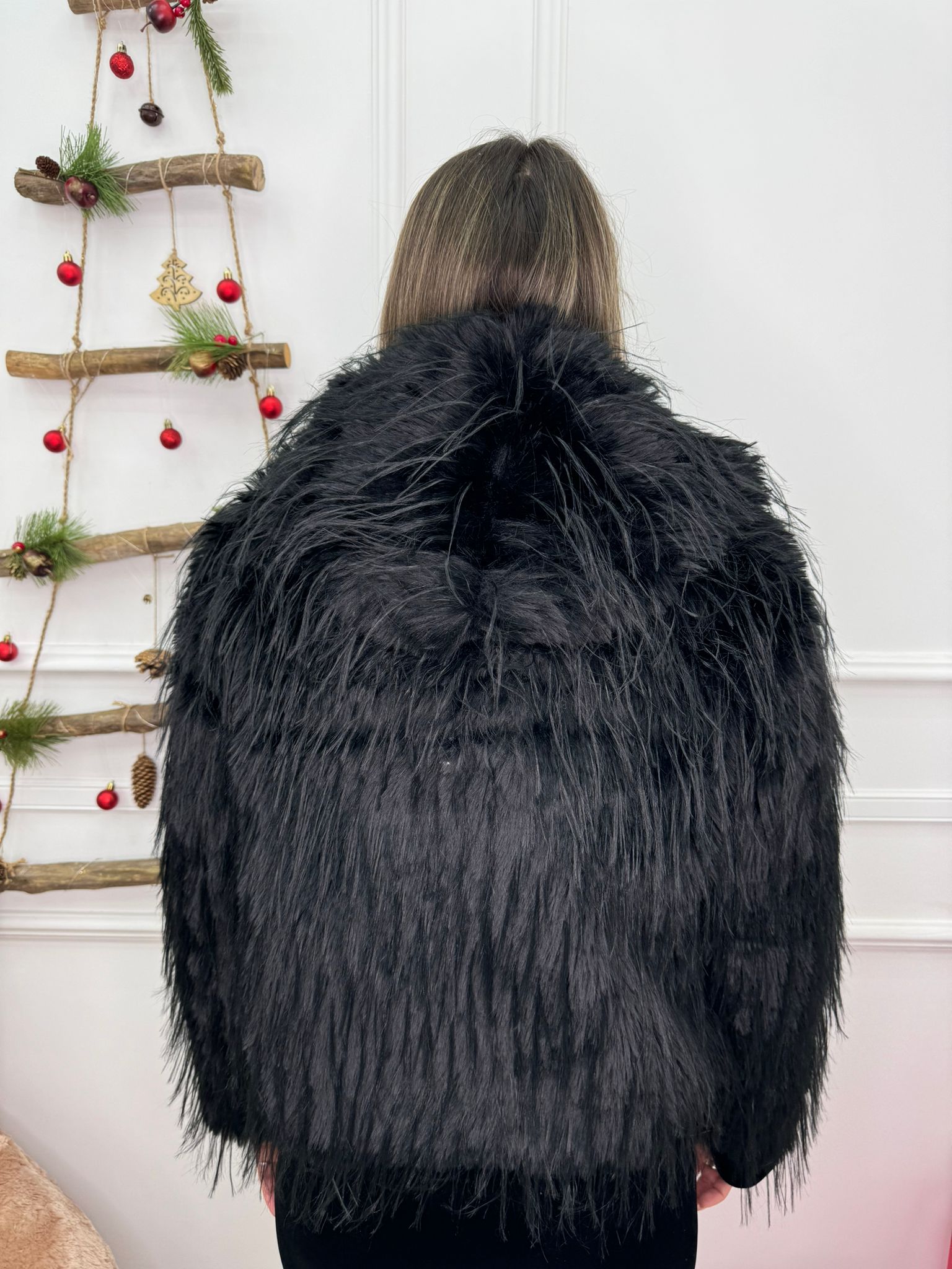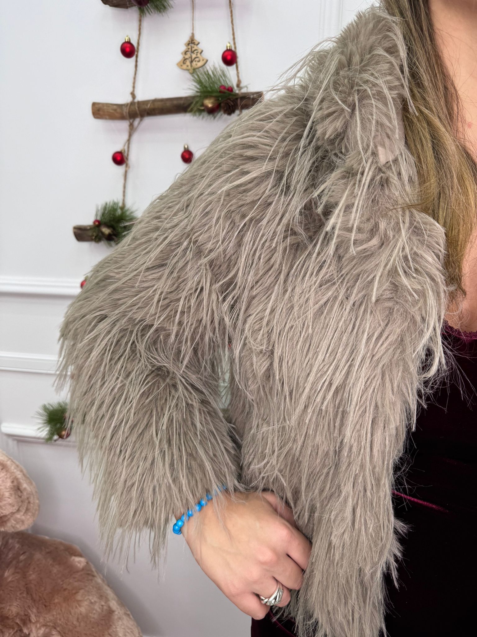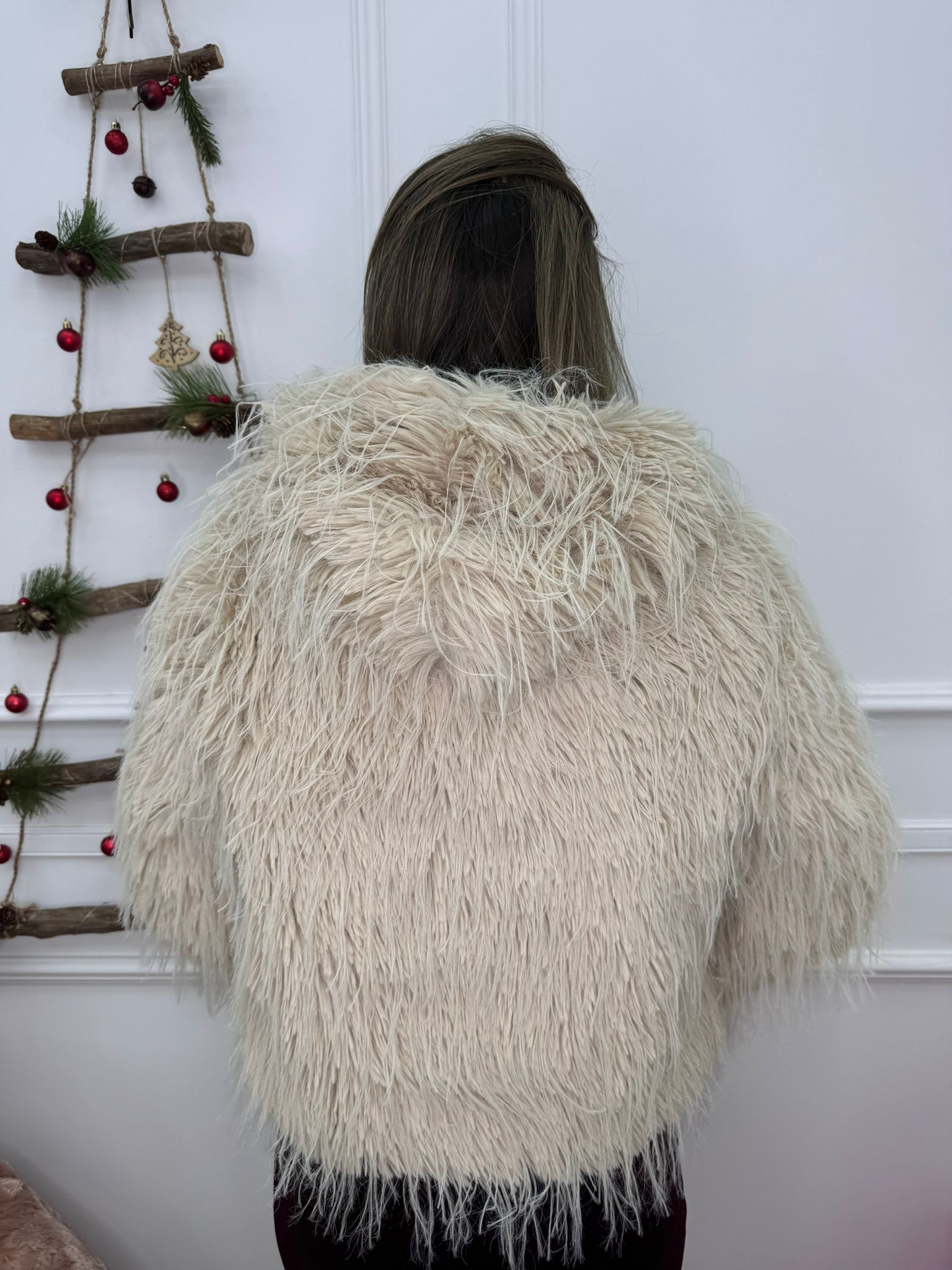 Pelliccia eco con piume e cappuccio