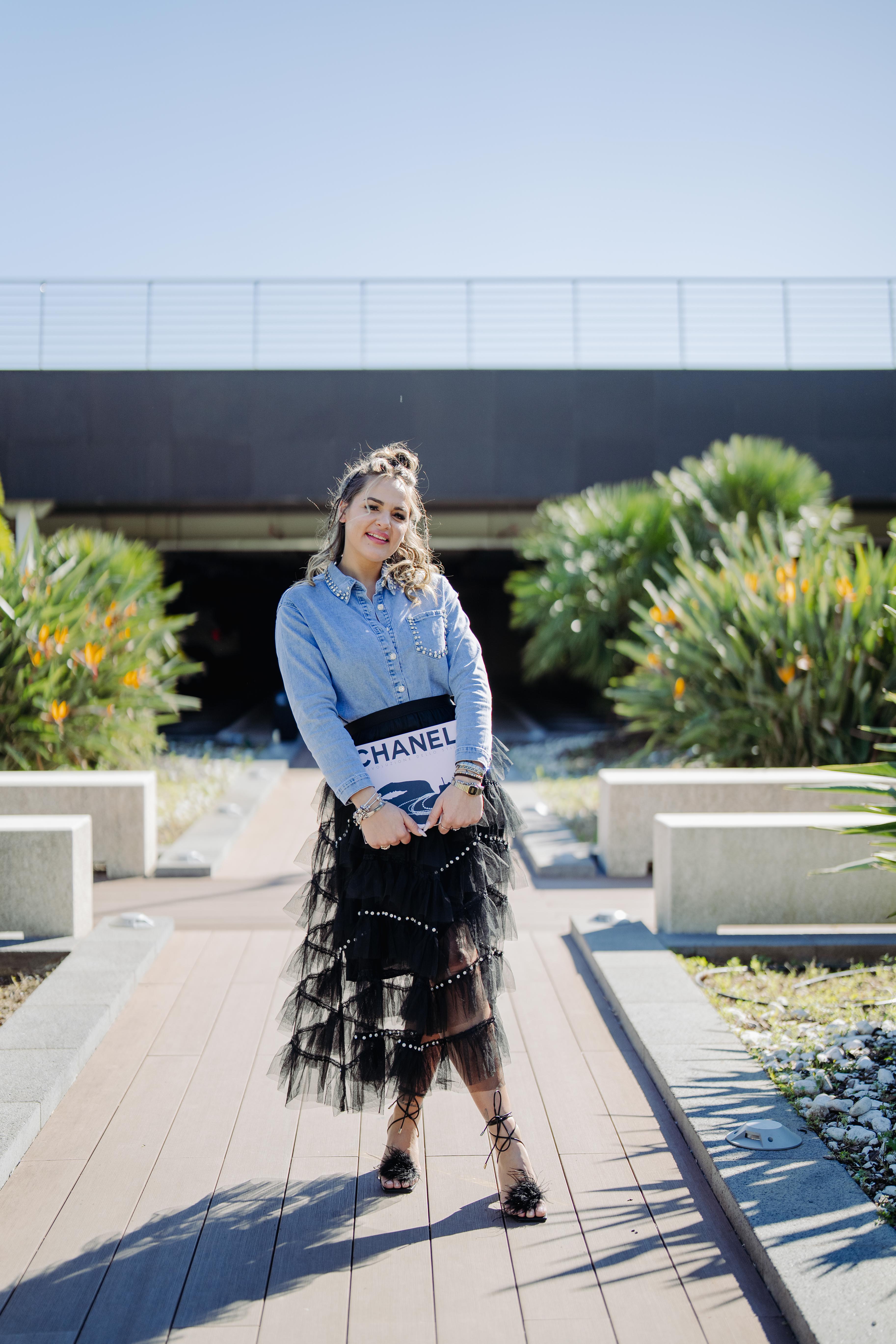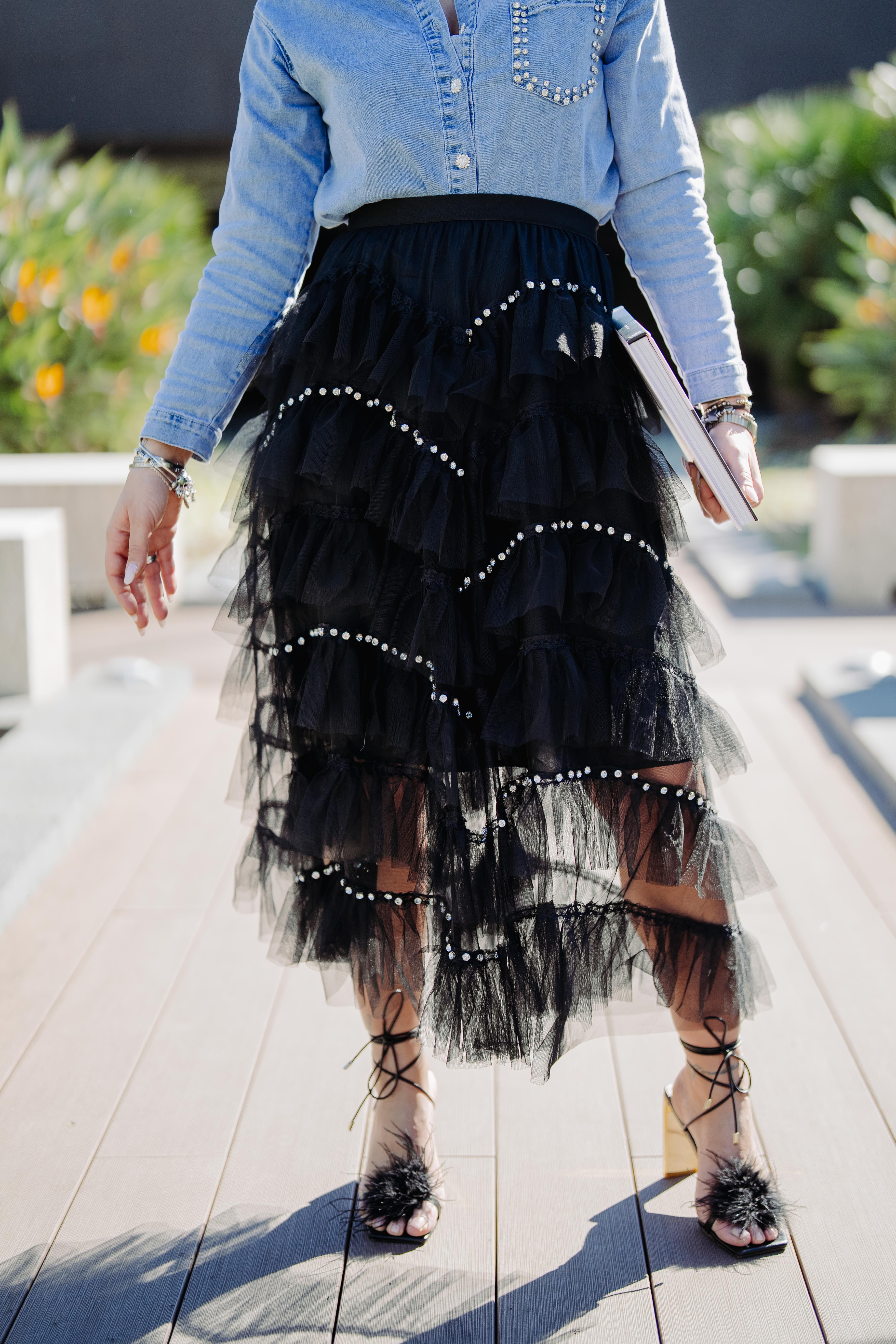 Gonna lunga in tulle con balze e swarovski