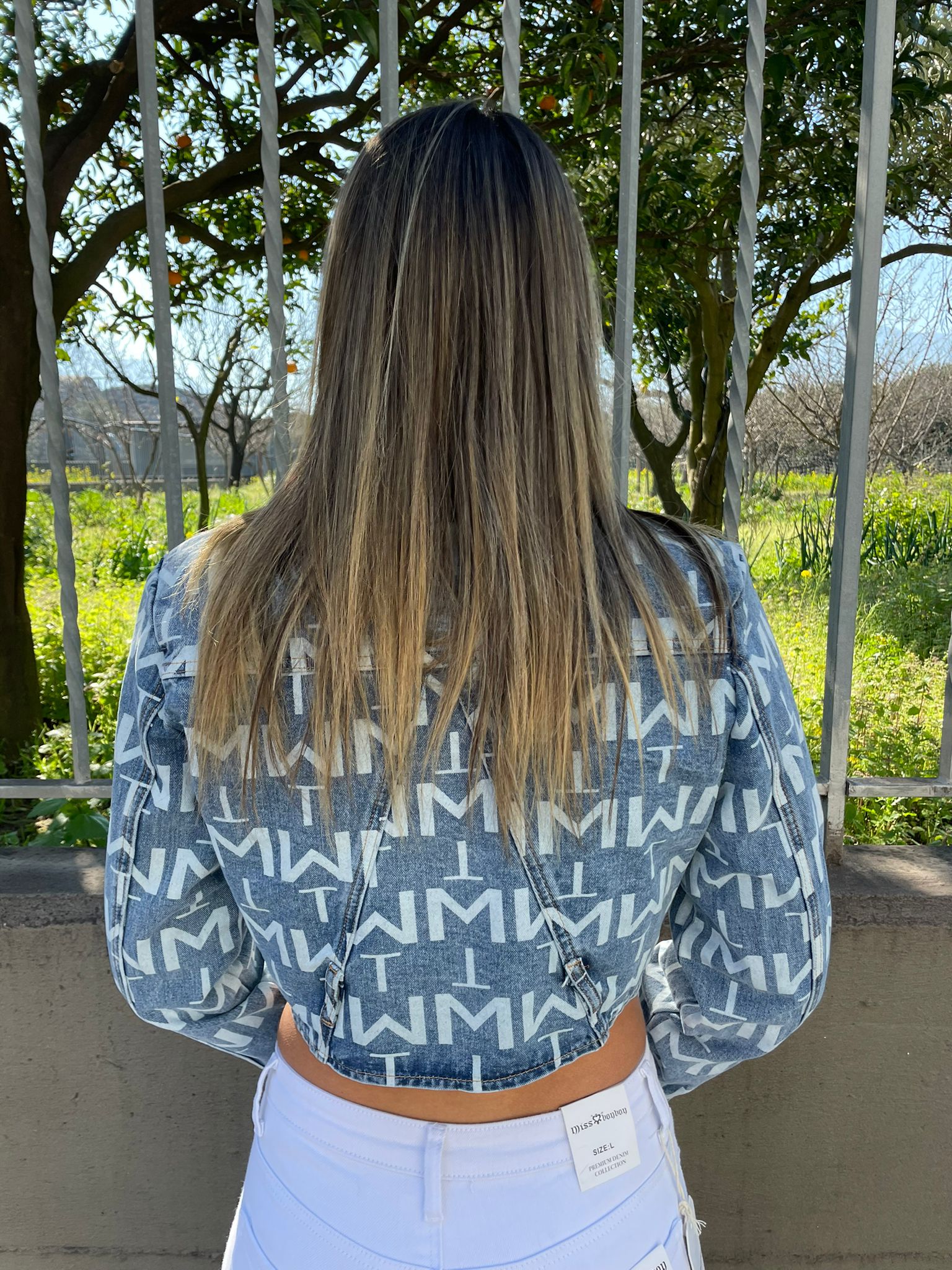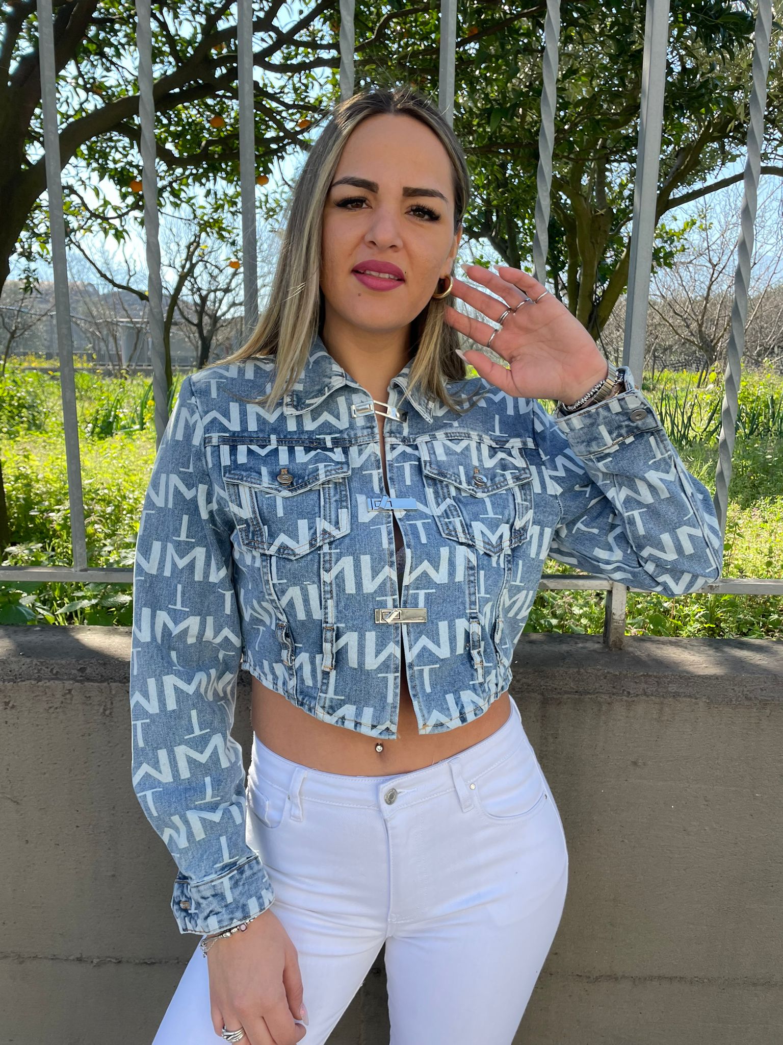 Giubbino di jeans con scritte e ciappe avanti