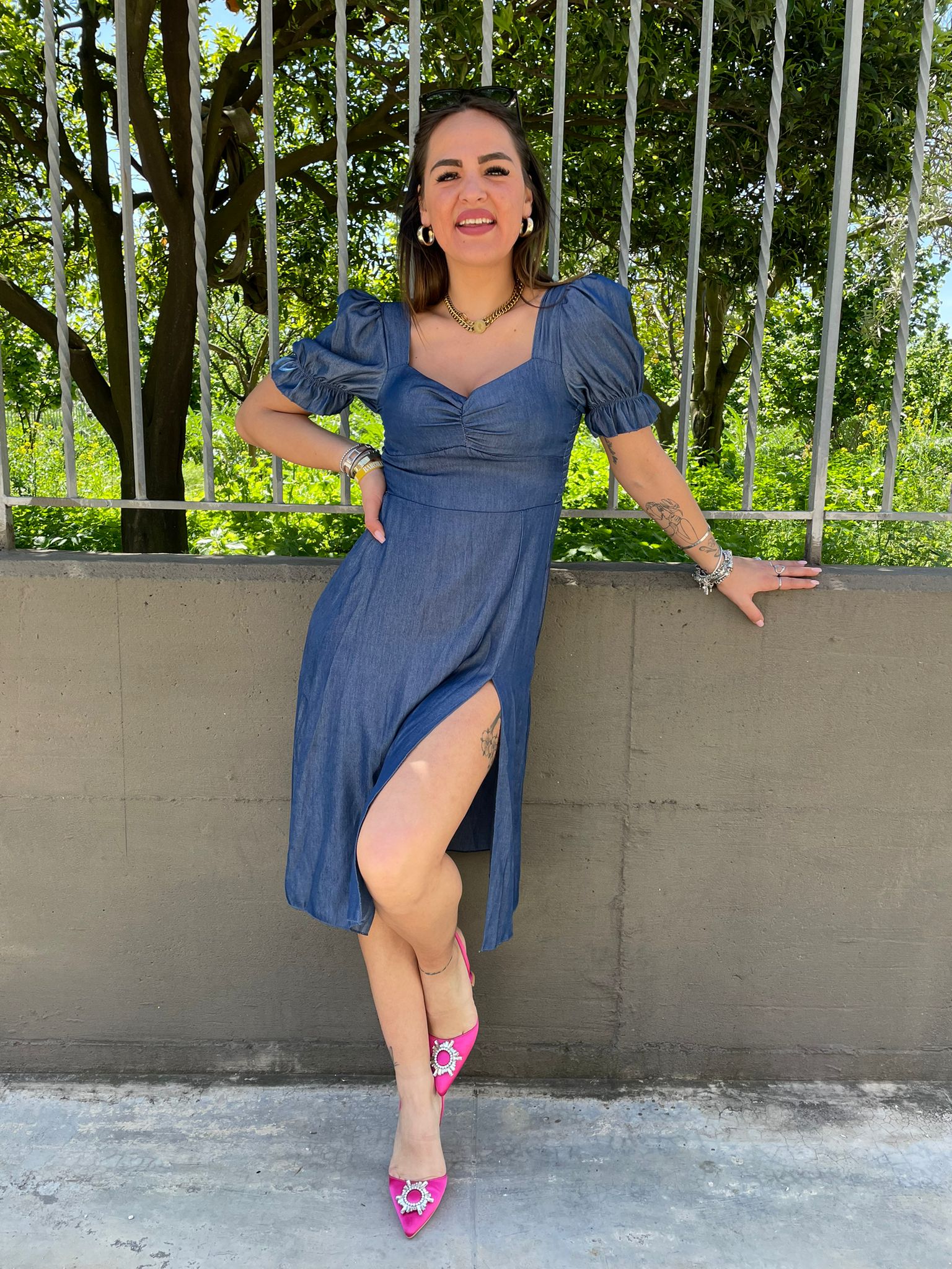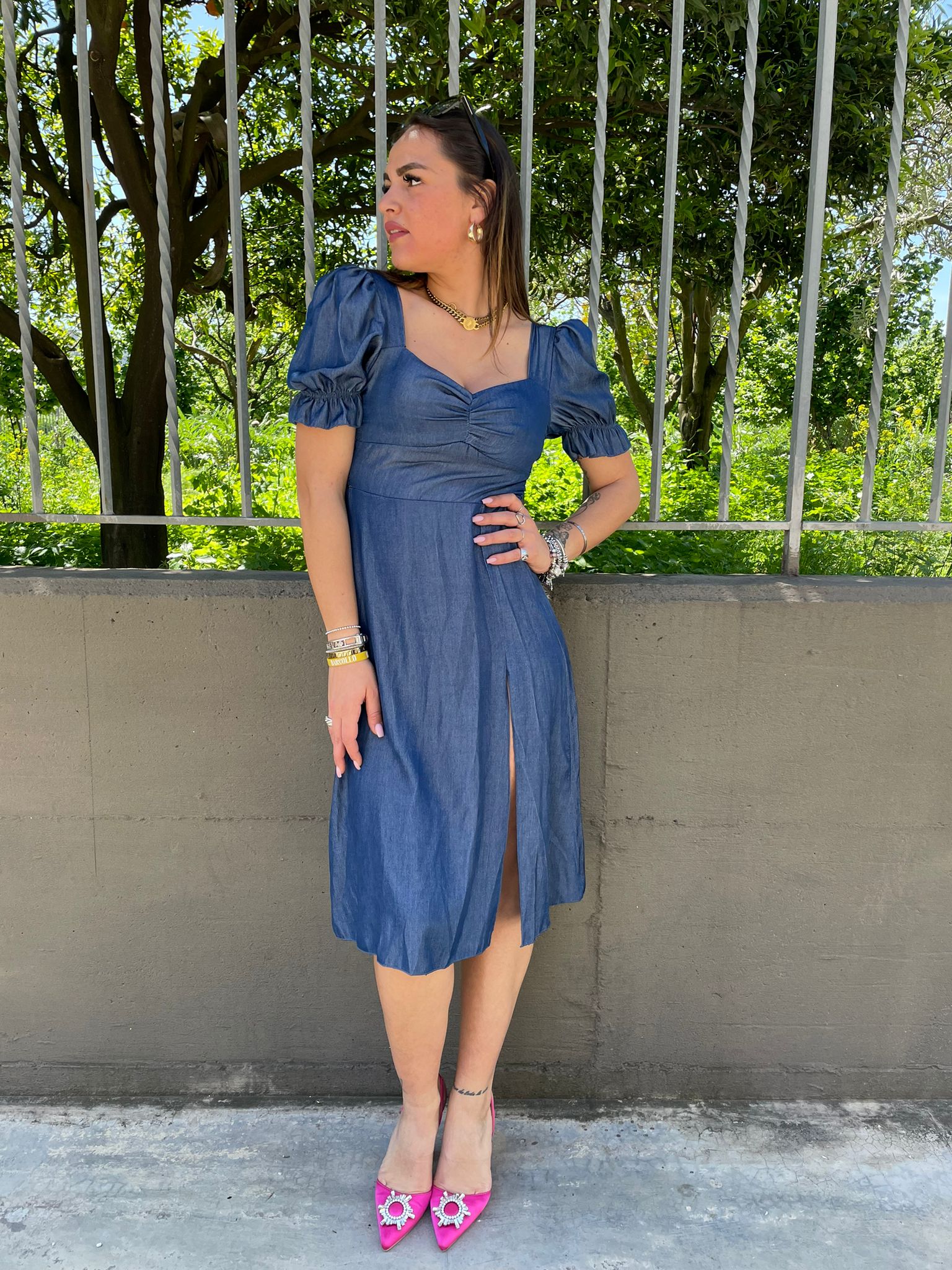 Vestito effetto jeans con maniche a sbuffo