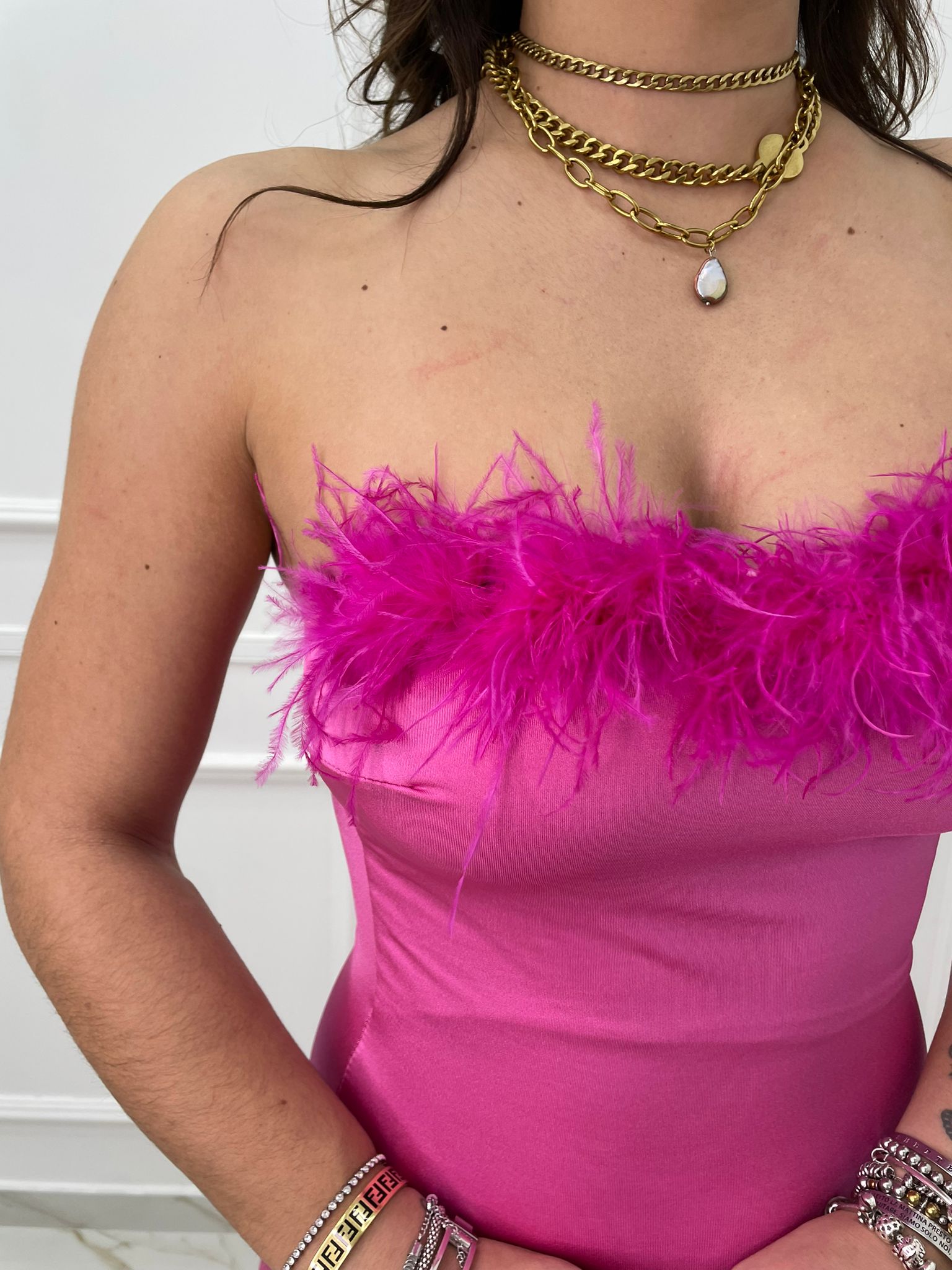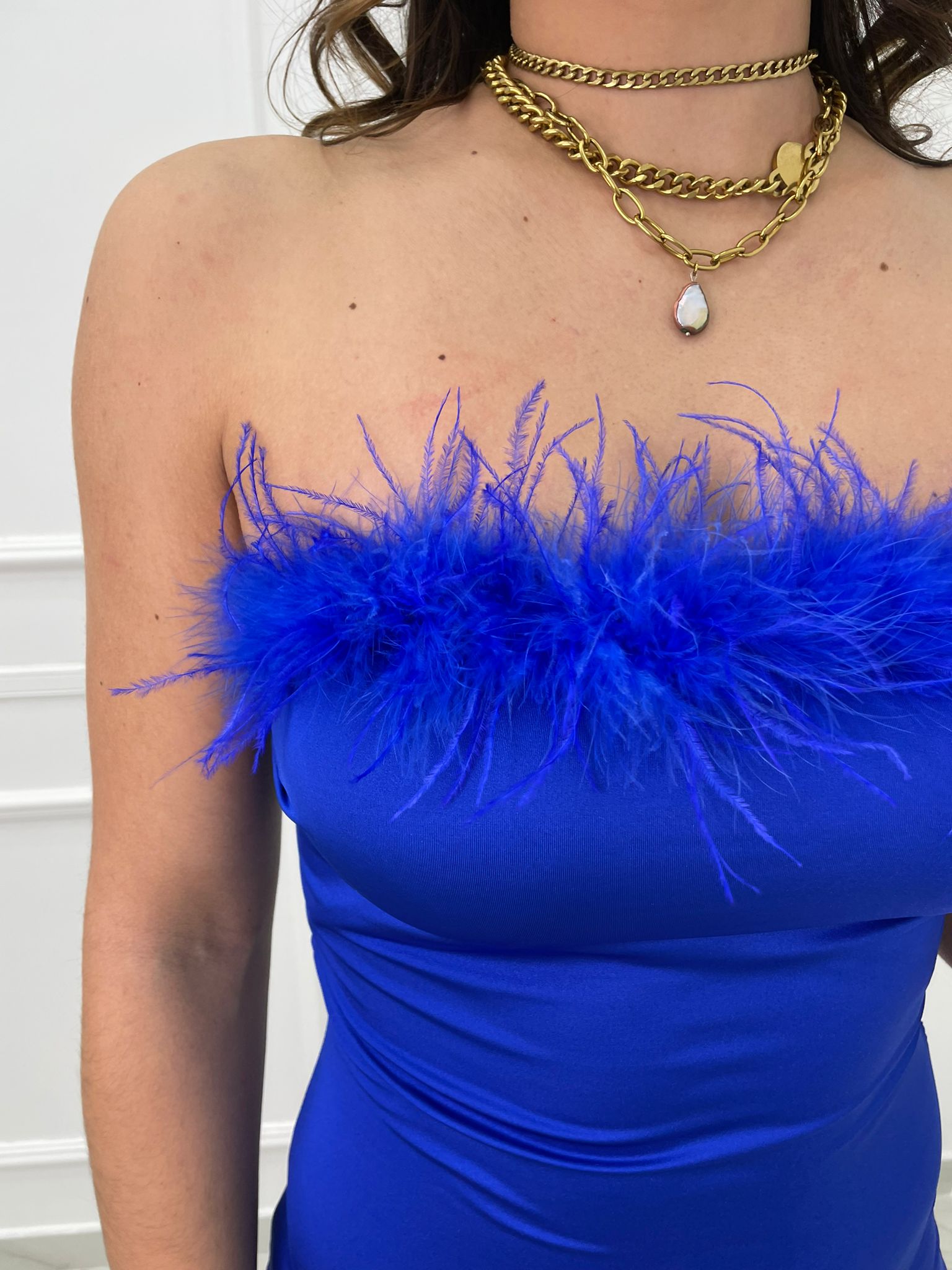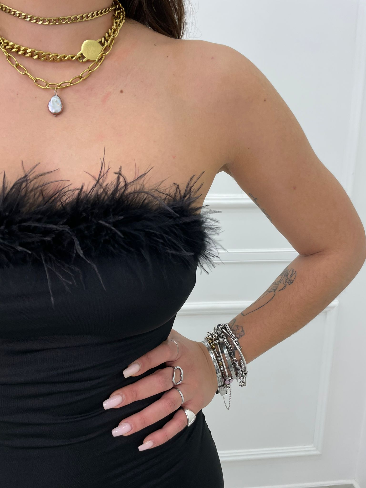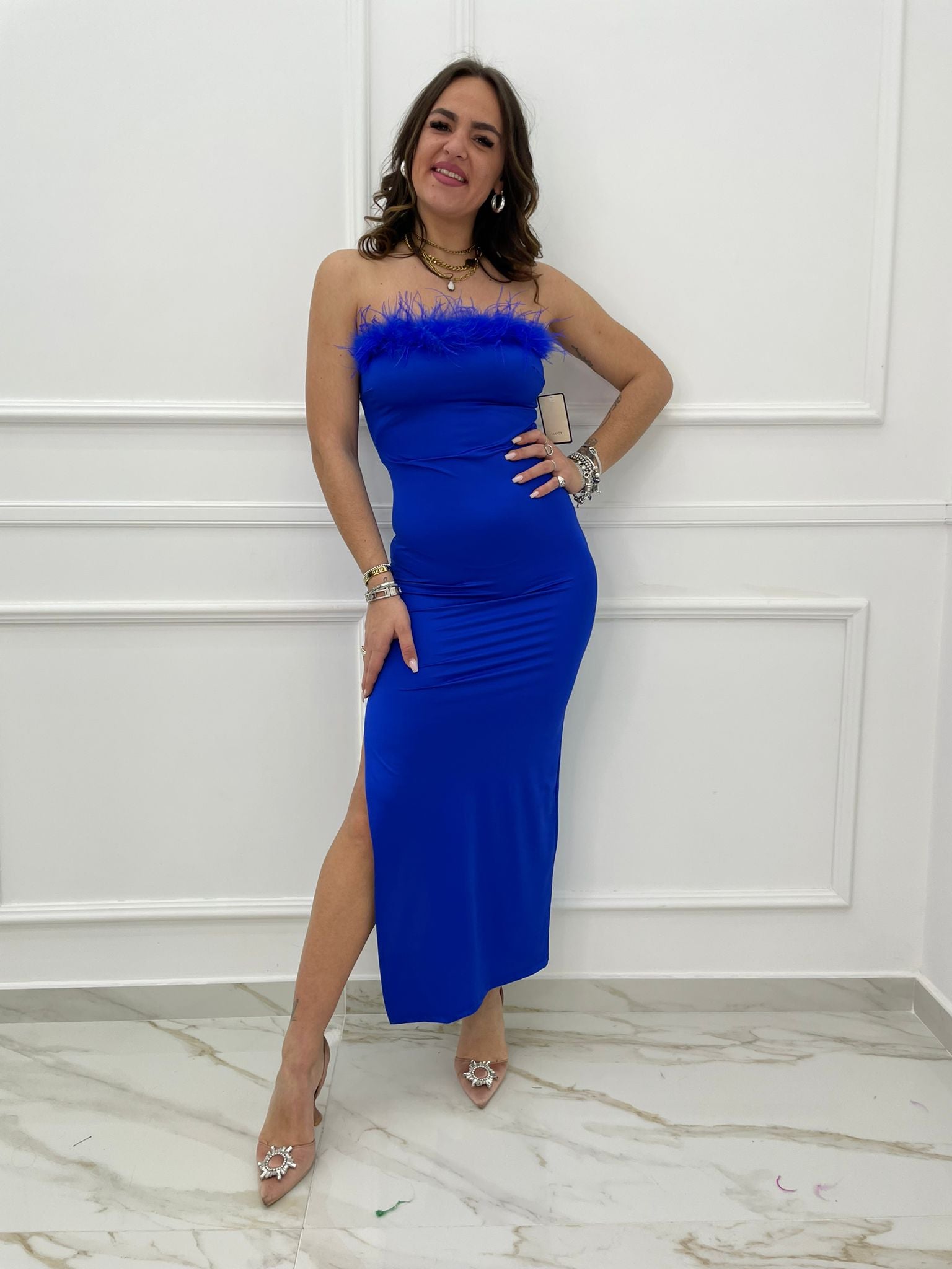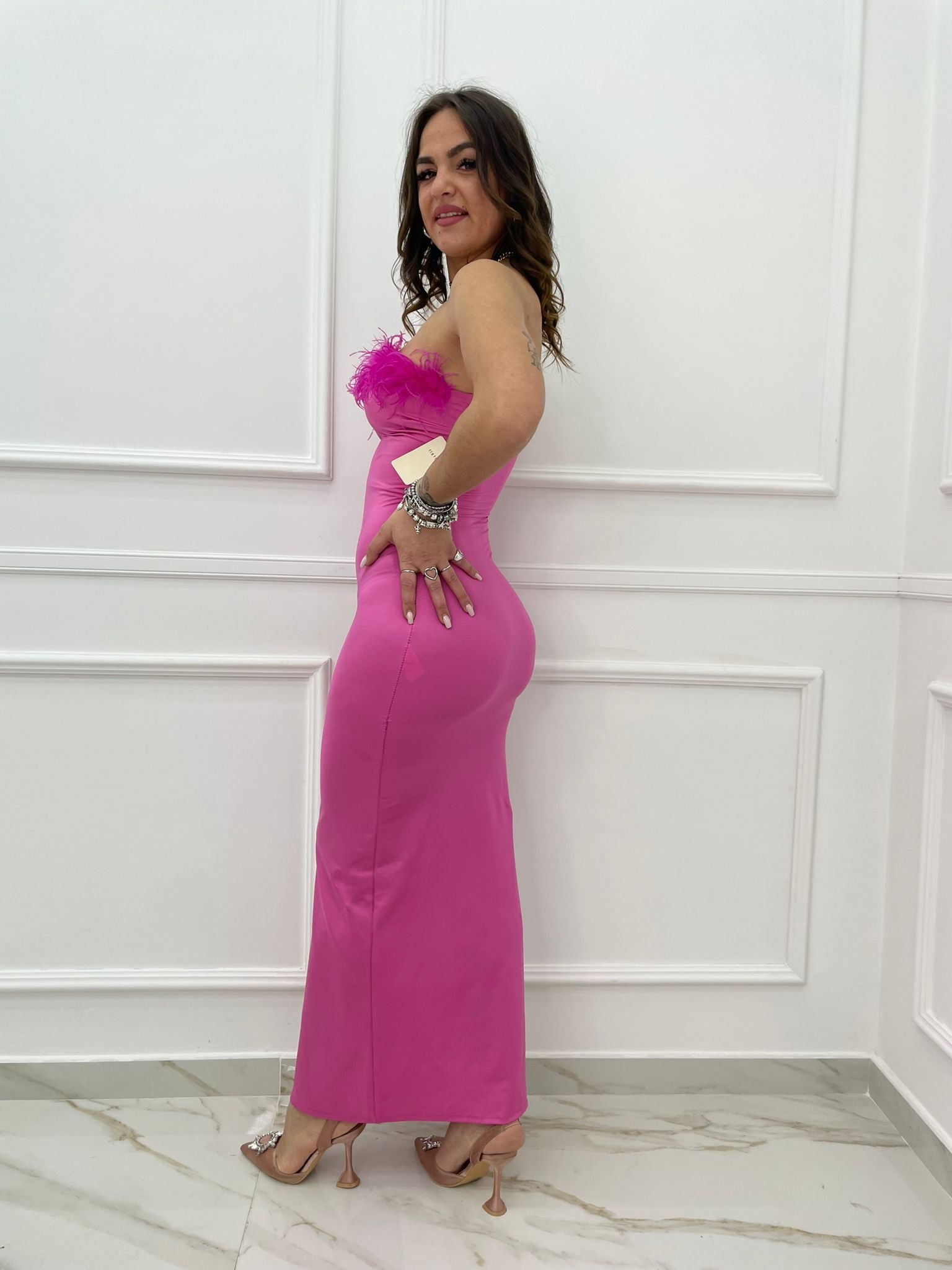 Vestito lungo con piume sullo scollo