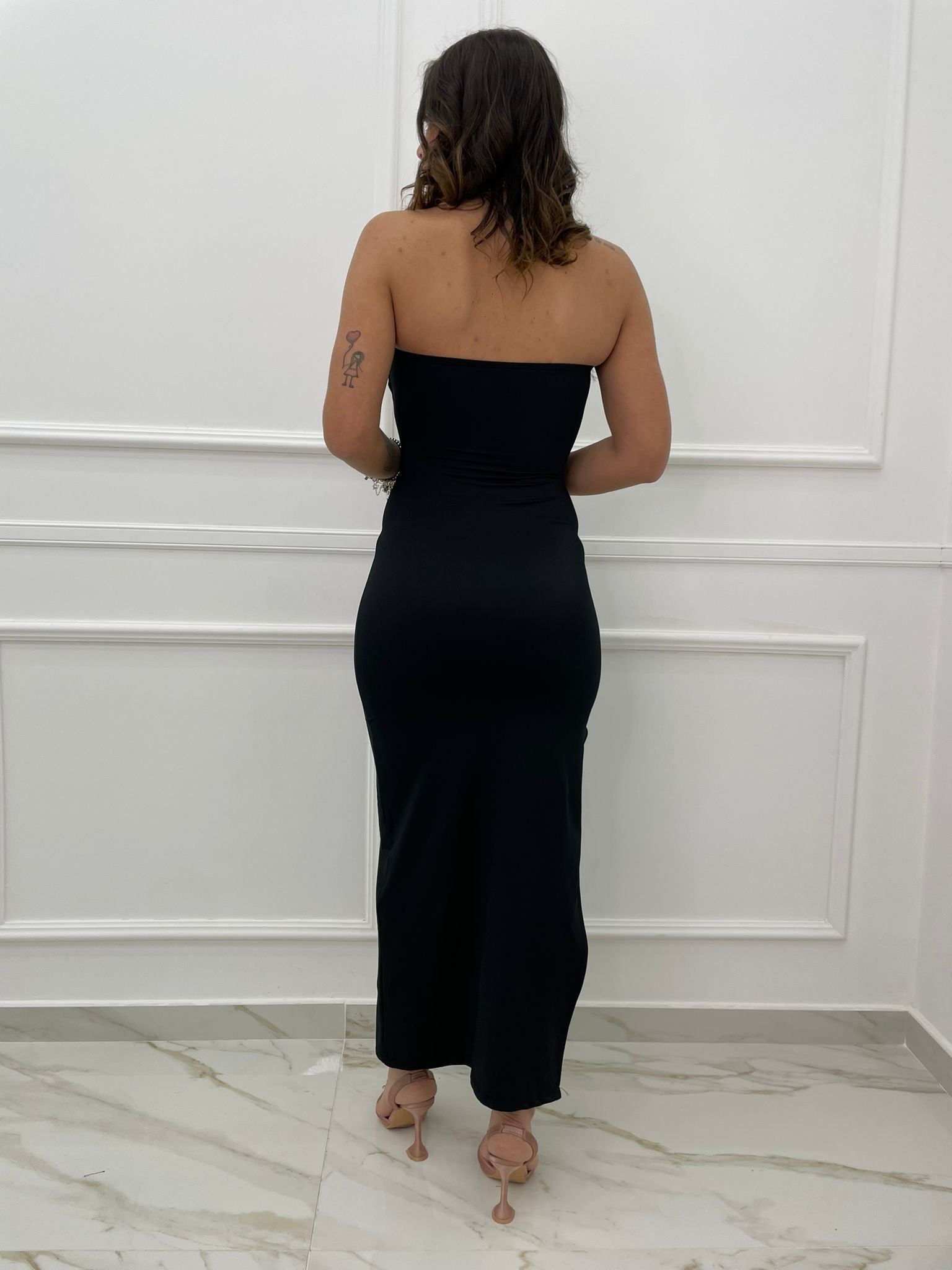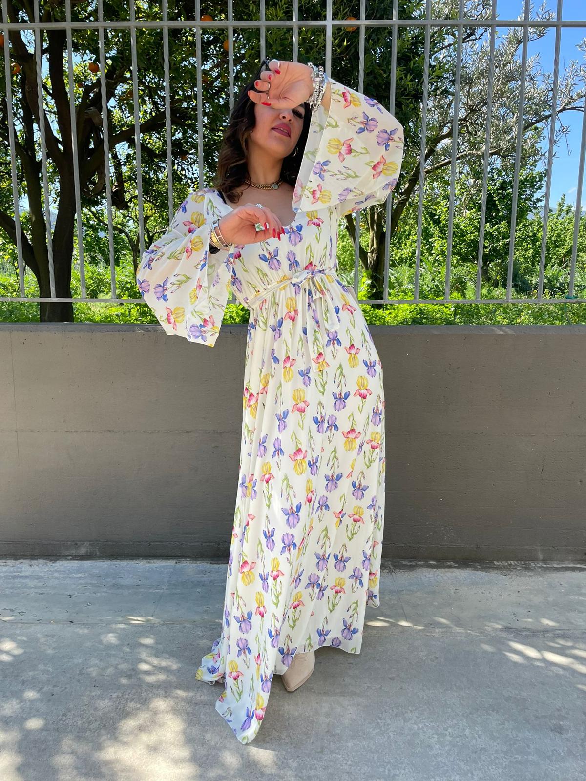 Vestito lungo con spalle scoperte e maniche a campana