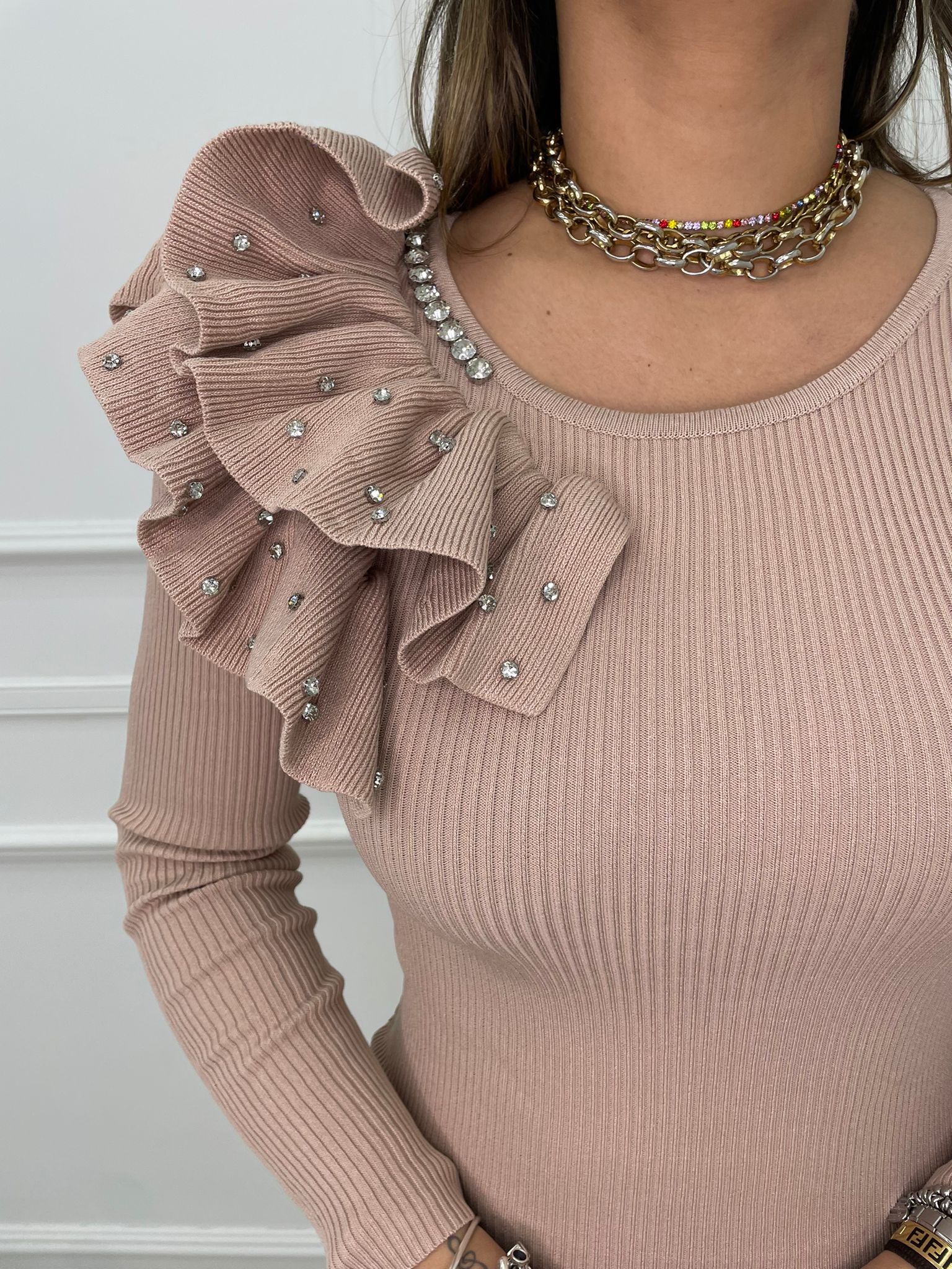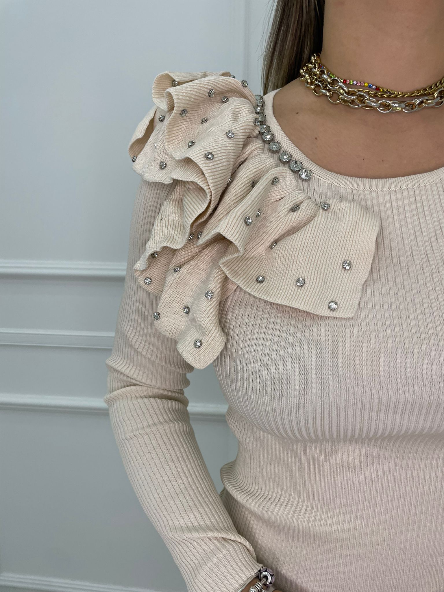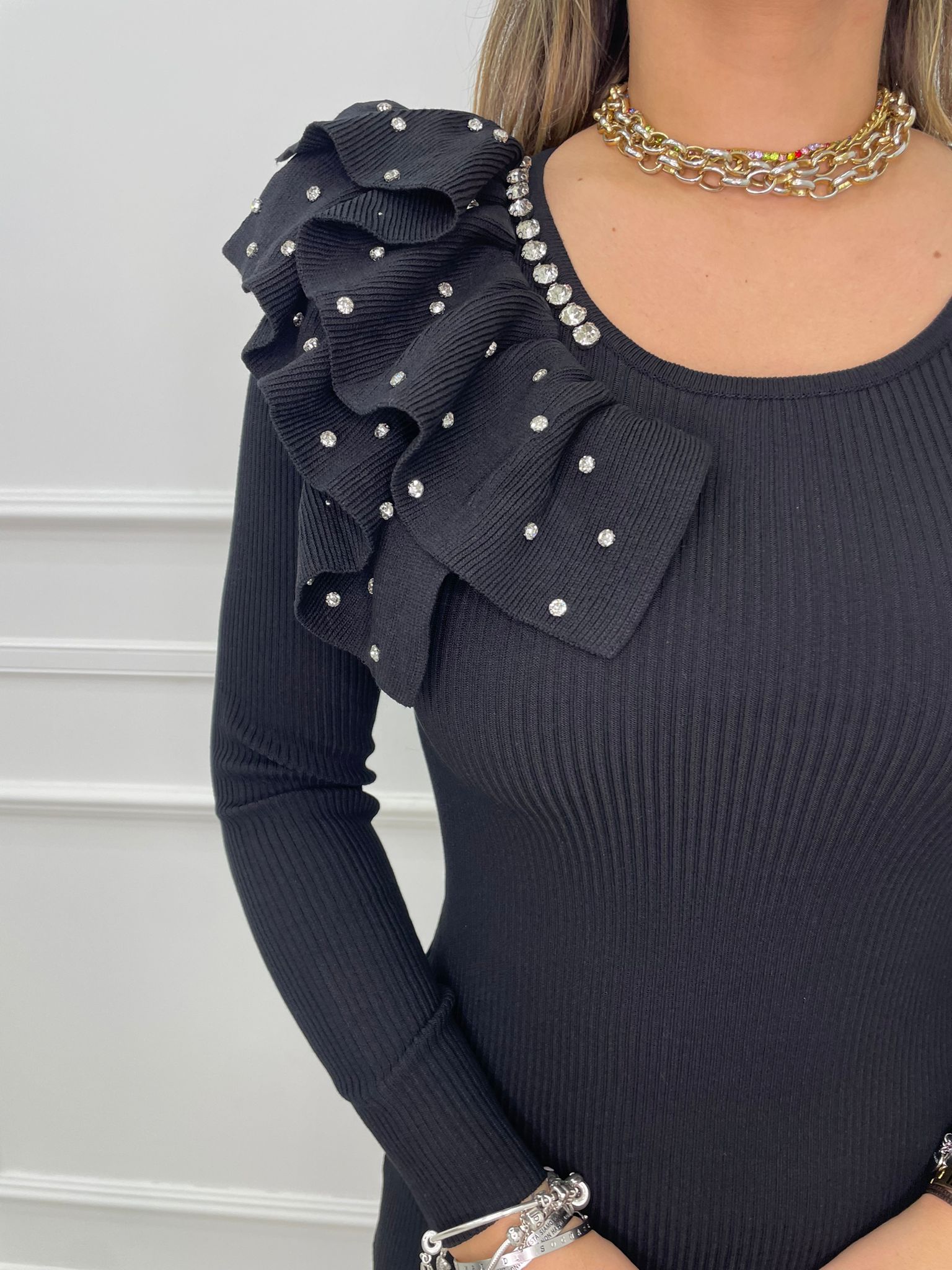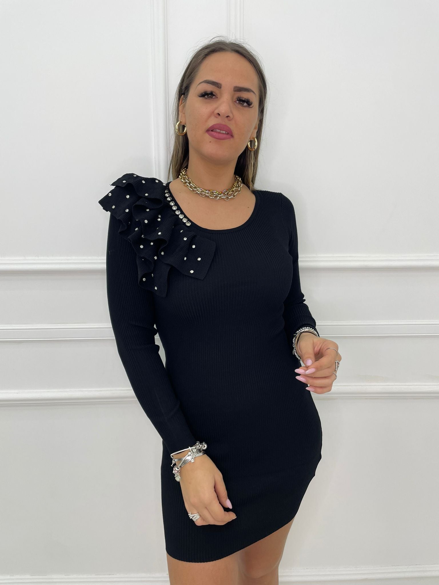 Vestitino con volant alla spalla e swarovski