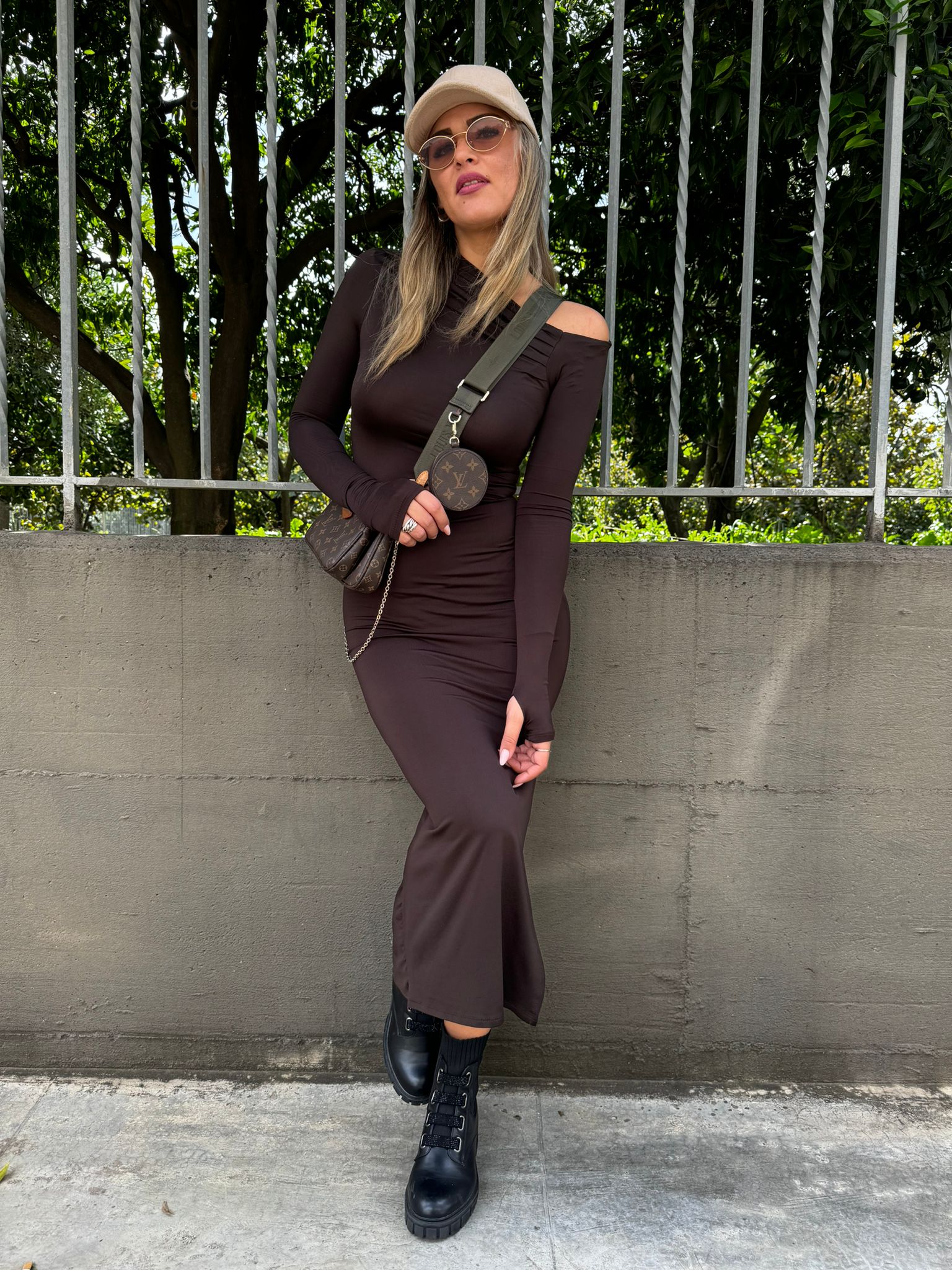 Vestito lungo in lycra con spalla scoperta e drappeggio