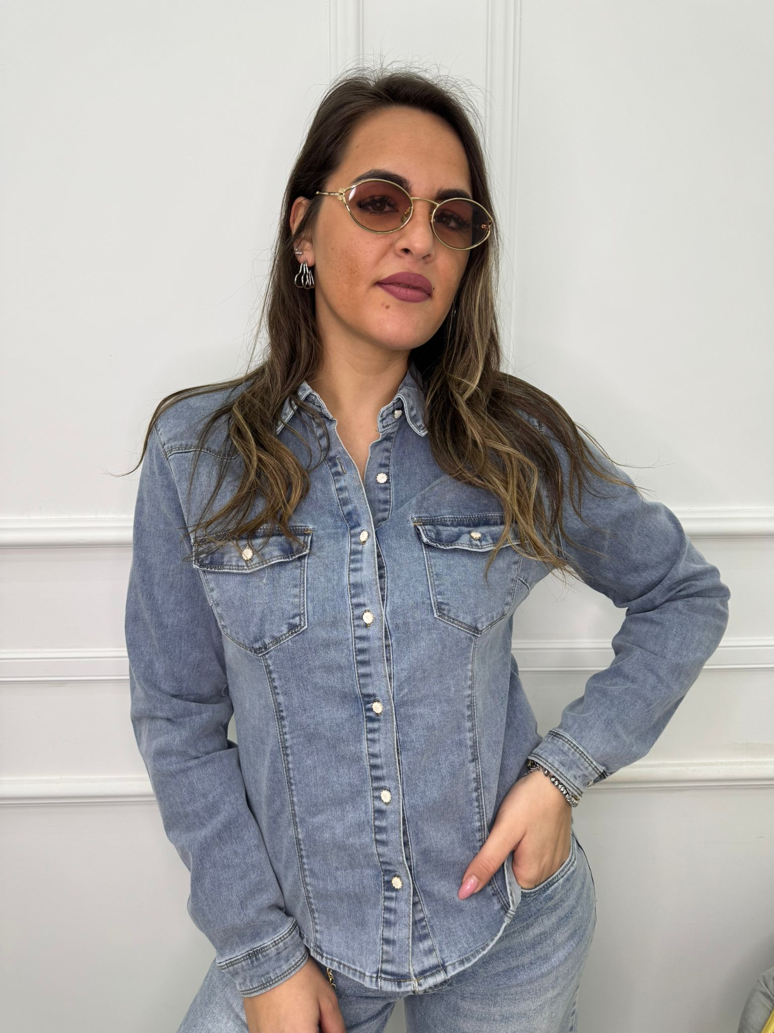 Camicia di jeans lavaggio chiaro con bottoni madre perla