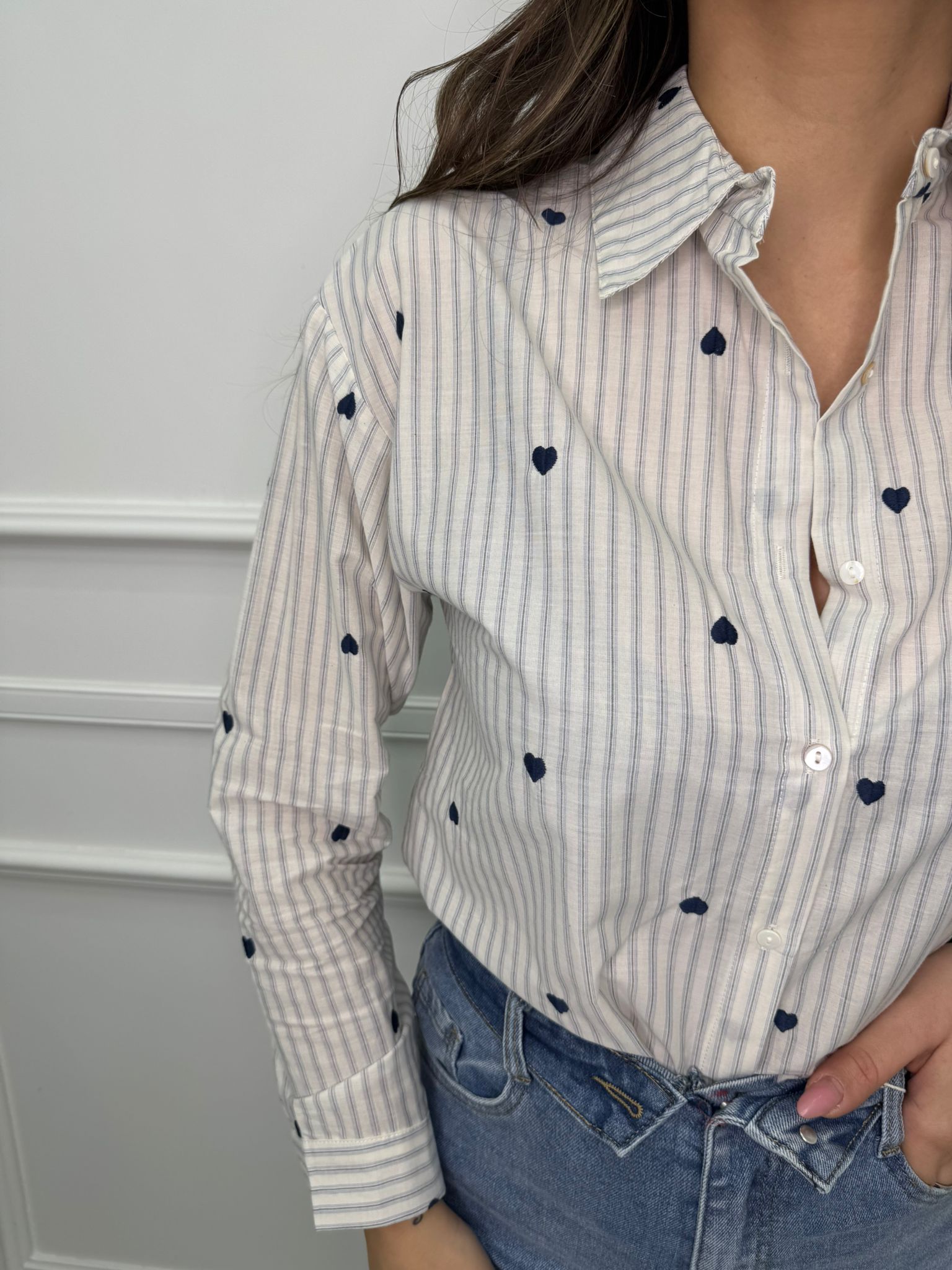 Camicia a righe con cuori ricamati
