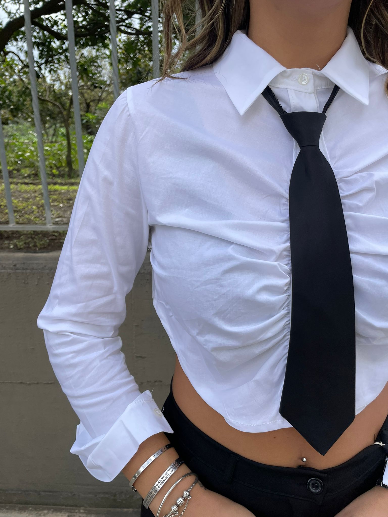 Camicia crop con cravatta e drappeggio