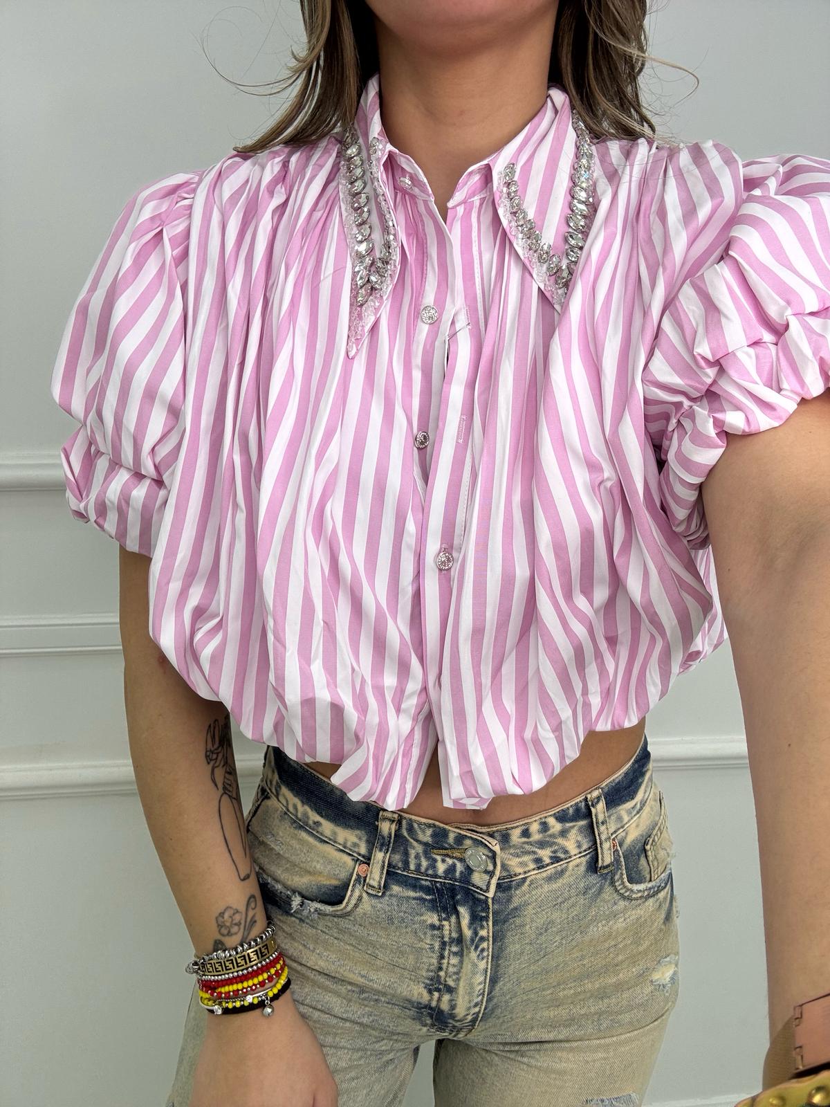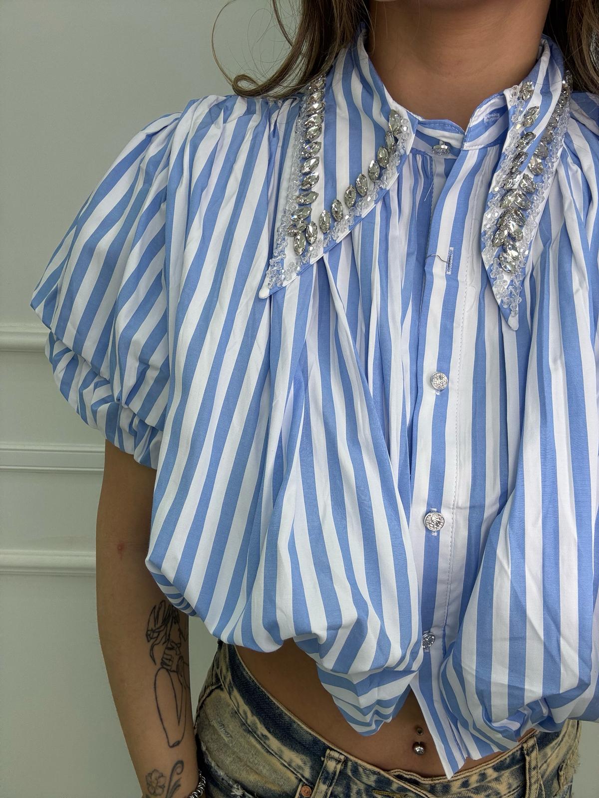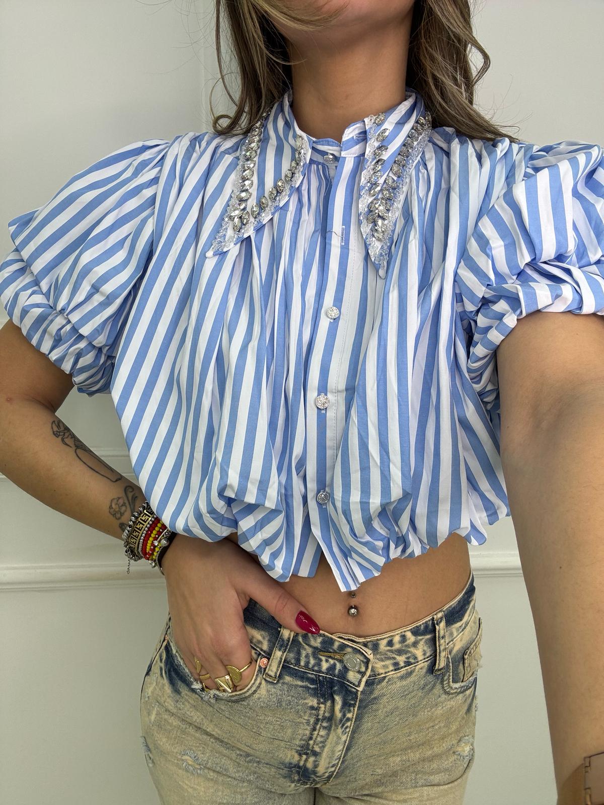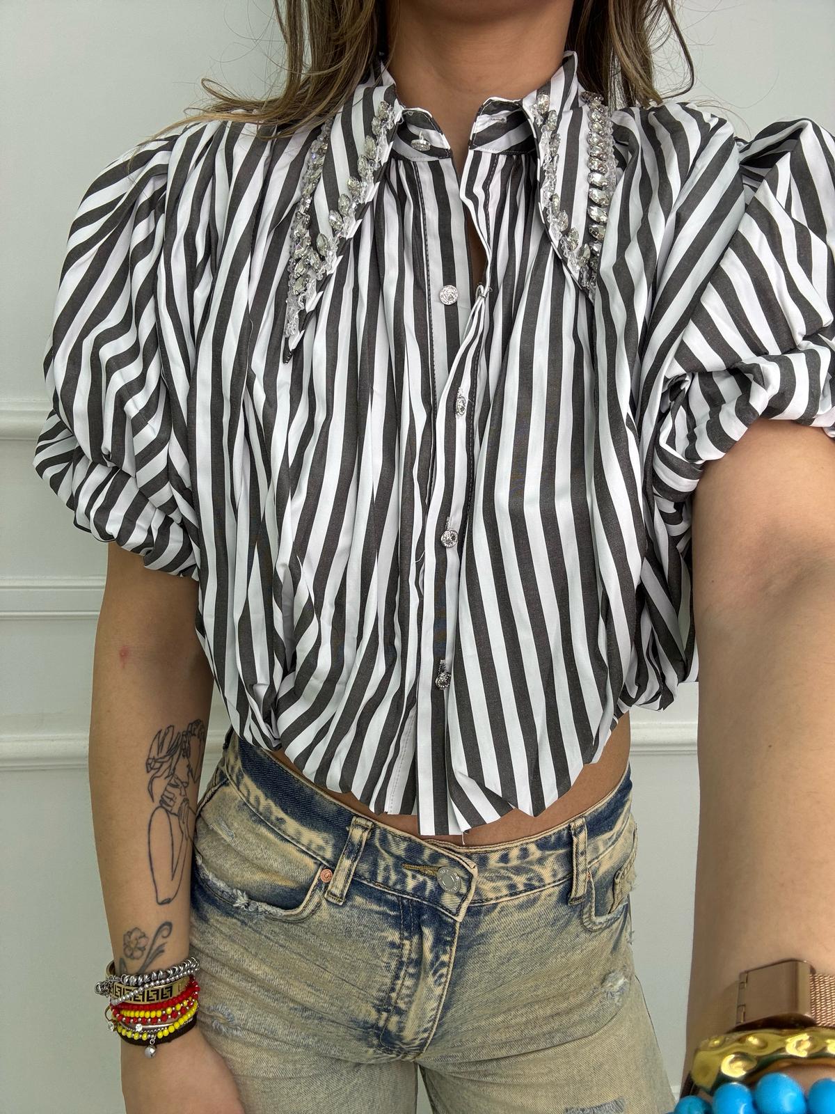 Camicia crop con maniche a sbuffo e swarvoski