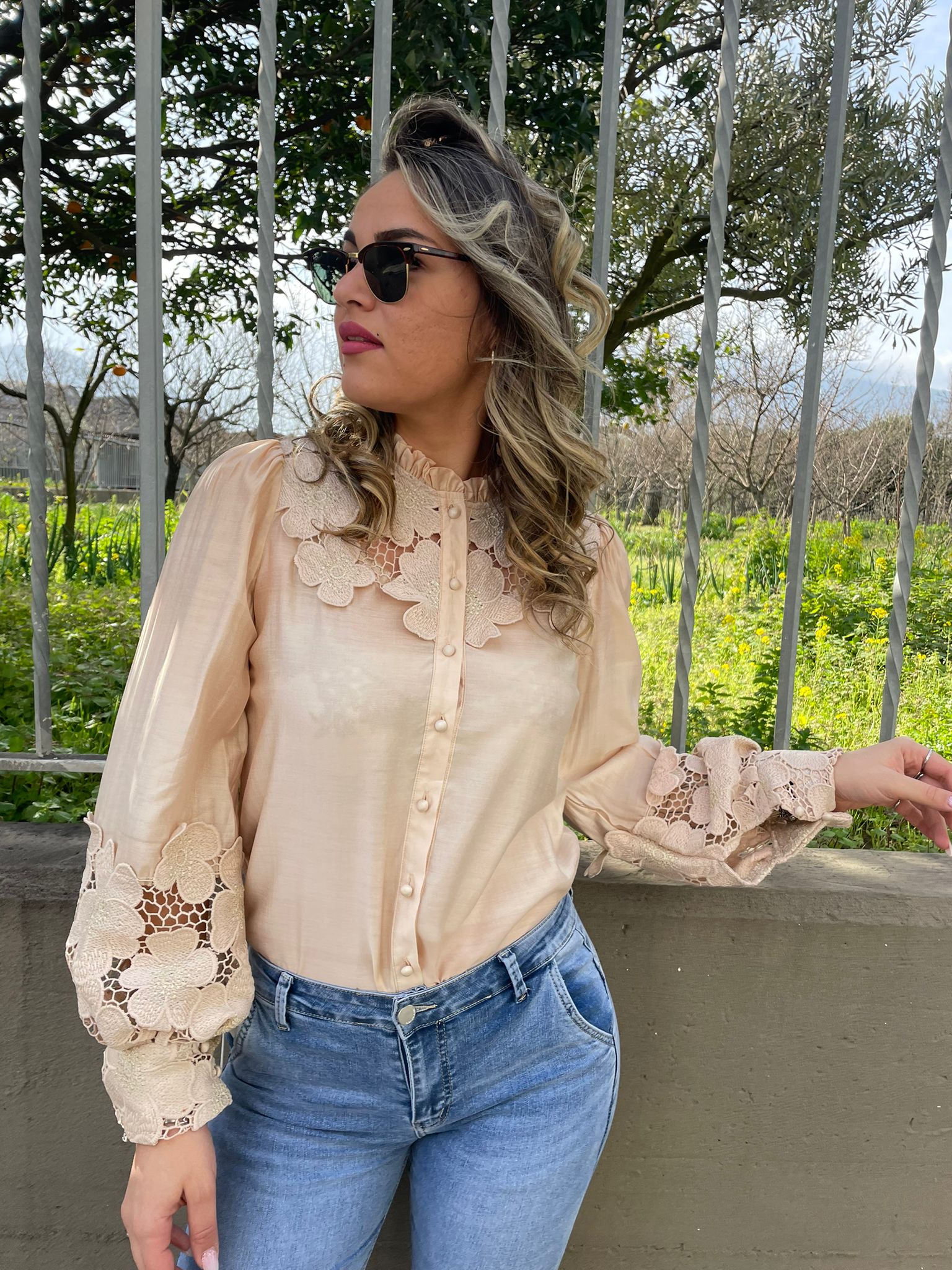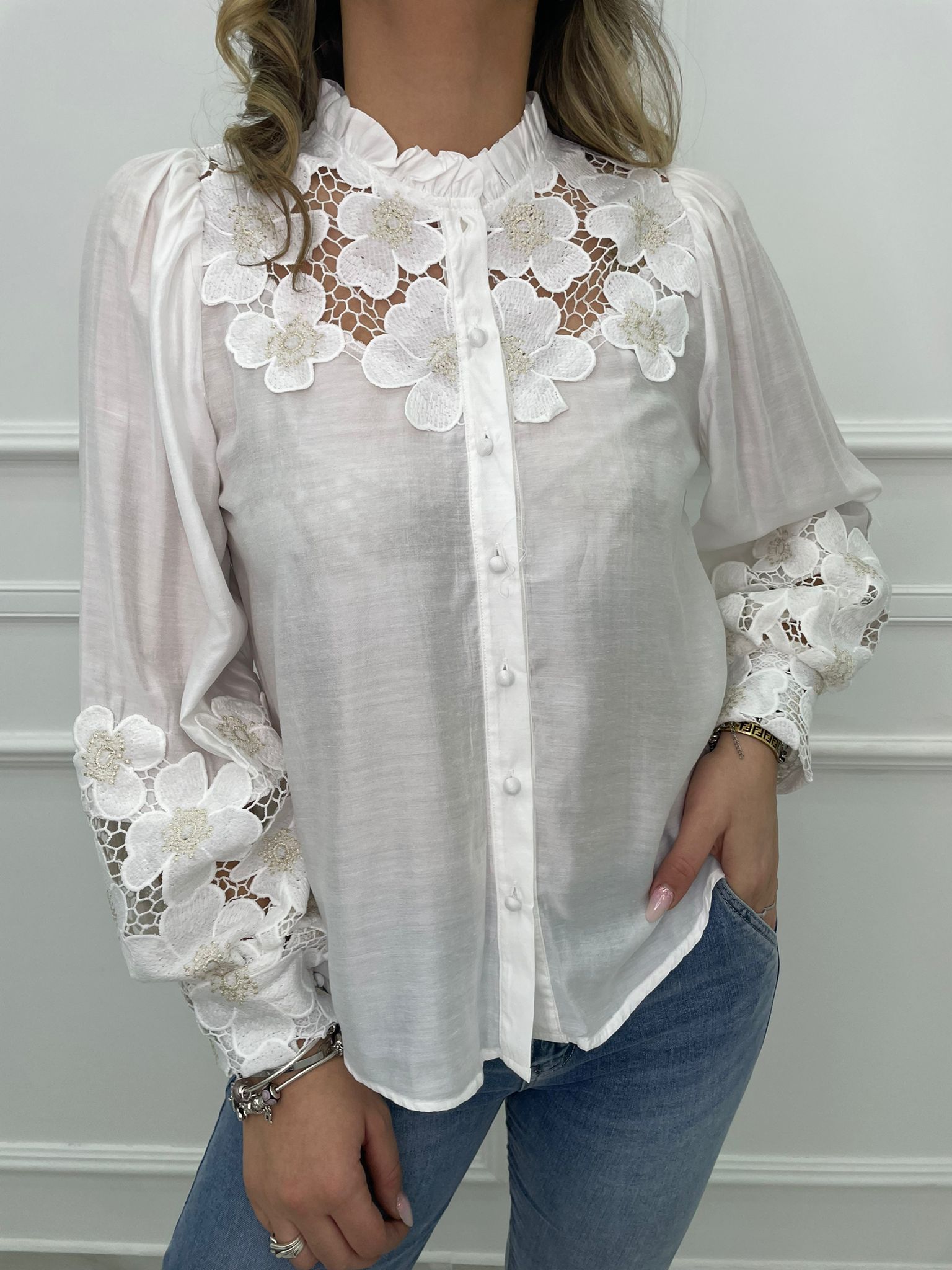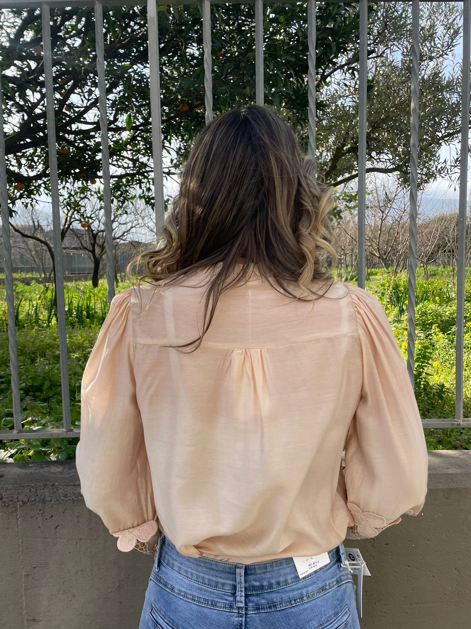 Camicia tinta unita con inserti ricamati e maniche a sbuffo