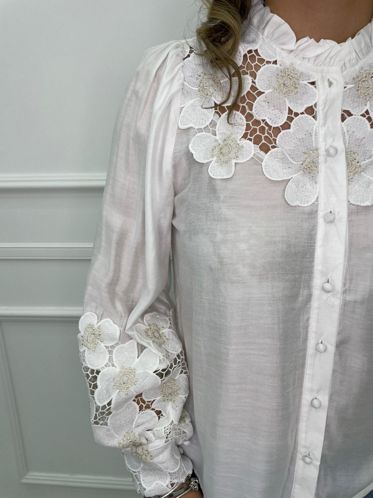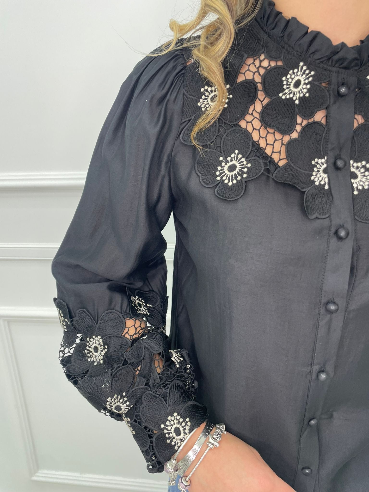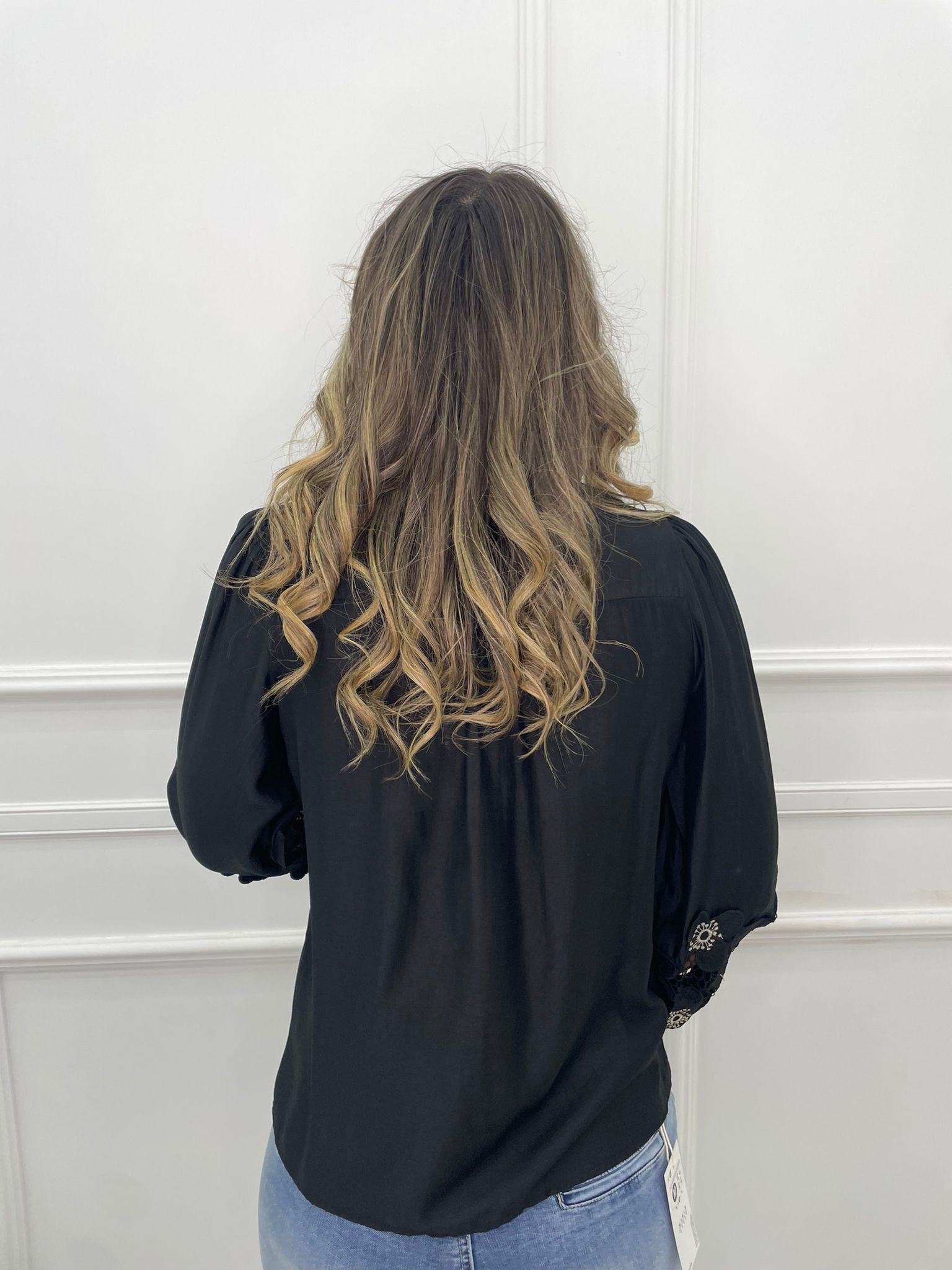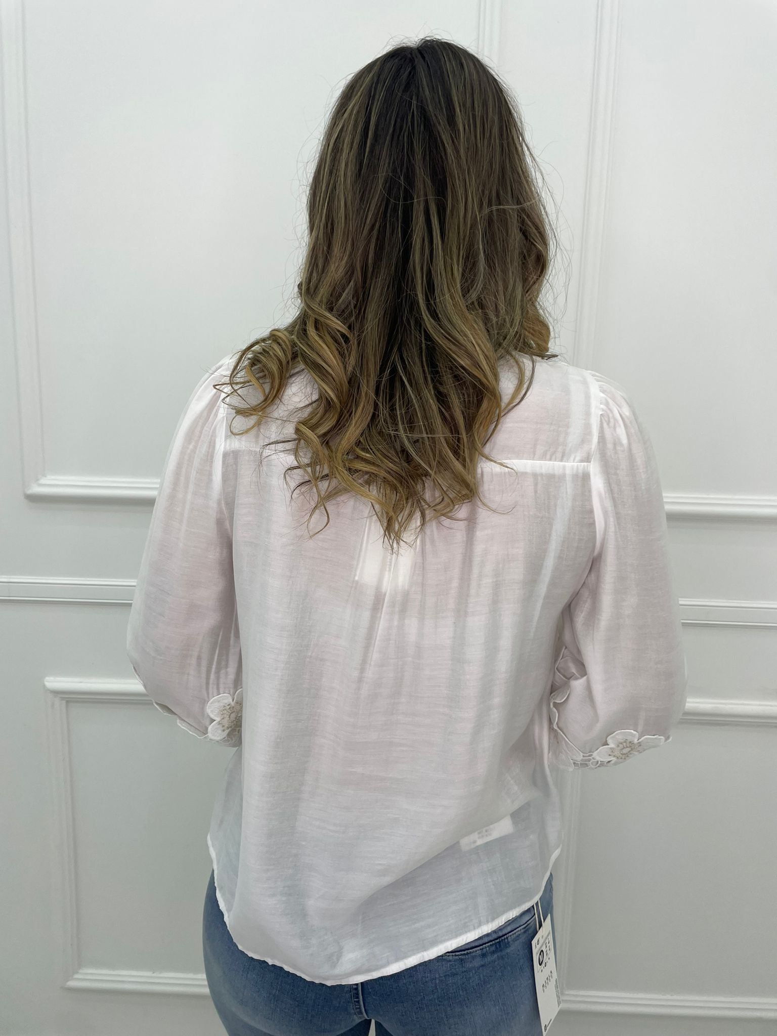 Camicia tinta unita con inserti ricamati e maniche a sbuffo