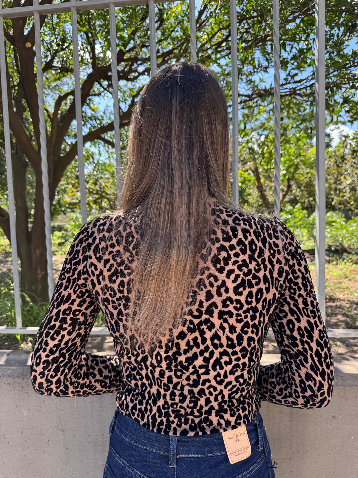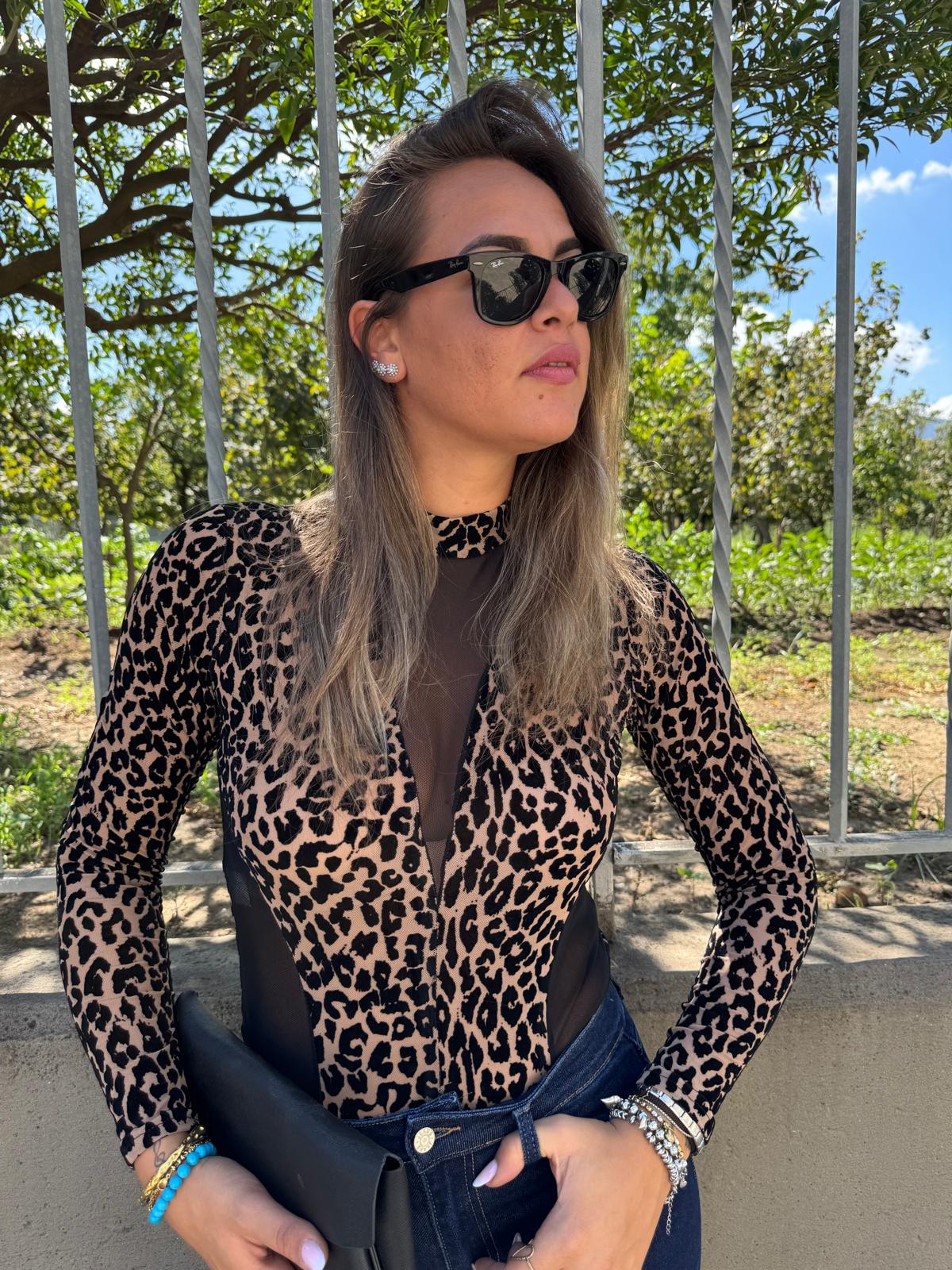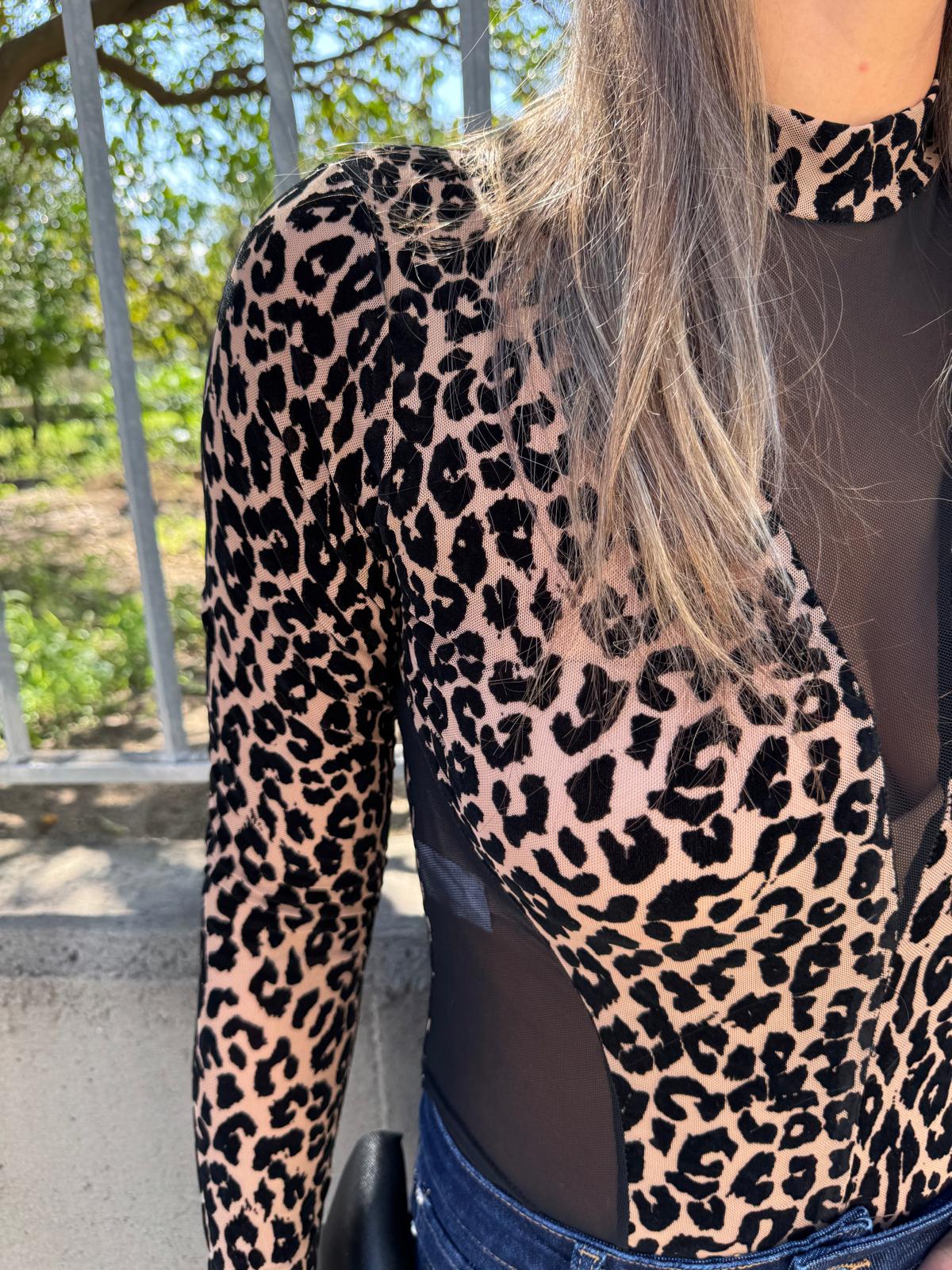 Body animalier con inserti velati e in velluto