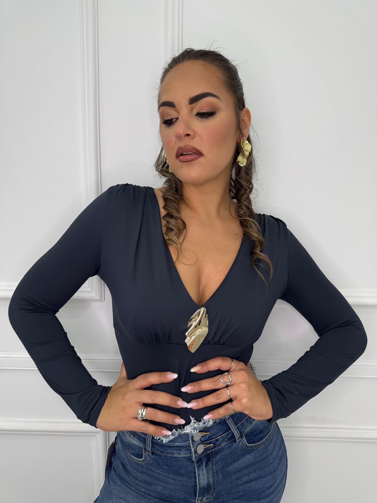 Body in lycra scollo a V con applicazione oro